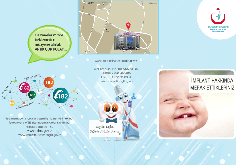 Hastanelerimizde beklemeden muayene olmak ARTIK ÇOK KOLAY… www. eskisehir.adsm.saglik.gov.tr .tr s.gov ww w. m hr s.g ov .tr .mhr www Yenikent Mah. Piri Reis Cad. No: 28 Telefon: 0 222 2290919 Fax : 0 222 2293854 [email protected] v.tr rs.go .mh www Hastanemizde randevulu sistem ile hizmet verilmektedir. Telefon veya WEB sitesinden randevu alabilirsiniz. Randevu Telefon: 182 www.mhrs.gov.tr www. eskisehir.adsm.saglik.gov.tr Sağlıklı Dişler, Sağlıklı Gülüşler Dileriz... İMPLANT HAKKINDA MERAK ETTİKLERİNİZ İmplant (Suni Diș Kökü) Nedir? Üst çene veya alt çenede eksik olan dișlerin fonksiyonunu ve estetiğini yeniden kazandırmak amacıyla çene kemiğine yerleștirilen, özellikle saf ve doku dostu materyallerden yapılan suni diș kökleridir. İmplantlar İle Tedavi Güvenli ve Uzun Ömürlü müdür? Güvenli ve kaliteli bir implant ortaya çıkarmak için yapılan çalıșmalar 1809 dan beri sürmektedir. Günümüzde piyasada mükemmele çok yakın, 365 yıllık klinik takipleri bulunan implantlar olduğu gibi nispeten yeni implant markaları da bulunmaktadır. Bu konuda daha detaylı bilgiyi diș hekiminiz size verecektir. Her Hastaya İmplant Uygulanabilir mi? İmplant vidaları, belirli kalınlığı ve genișliği olan yapılardır. Bu nedenle implant konulması öngörülen bölgede, çene kemiğinin bu imlant vidasını kabul edecek yükseklikte ve genișliğesahip olması gerekmektedir. Varolan kemiğin kalitesi de imlant bașarısını etkileyen faktörlerden birisidir. Ayrıca tedaviden önce ve imlant ağızda kaldığı sürece diș etlerinin tamamen sağlıklı olması gerekmektedir. Hastanın genel sağlık durumu iyi olduğu sürece implant uygulamasını engelleyecek bir üst yaș limiti yoktur ancak kemik gelișimi tamamlanmamıș çok genç hastalara uygulanması tercih edilmeyebilir. İmplant Yerleștirilirken Acı Duyar mıyım? İmplant uygulanması öncesinde diğer ağız ve diș sağlığı hizmetlerinin verilmesinde olduğu gibi hastanın genel sağlık durumuna bağlı genel yada lokal uygun bir anestezi uygulanacağı için acı duyulmaz. Uygulama sonrasında akșam duyulabilecek ağrı, basit ağrı kesiciler ile giderilebilir. Bir çok hasta bu ağrının normal diș çekiminden sonra duyulan ağrıdan farklı olmadığını belirtmektedir. Tedavinin problemsiz tamamlandığı durumlarda implantların varlığını bile hissetmeyecek kadar rahat olursunuz. İmplantlar Yerleștirildikten Hemen Sonra Protezlerim Takılabilir mi? İmplantların kemik ile tam birleșmesini (Osteointegration) sağlamak için iyileșme dönemi olan ilk 3-6 ay boyunca implant üstüne gelen yüklerin en aza indirgenmesi gerekir. Doktorunuz, bu iyileșme süresinde size uygun bir geçici protez yapabilir. dan sonraki geç dönemde ise yetersiz ağız temizliğine bağlı iltihaplanmalar șeklinde ortaya çıkabilir. Özellikle erken dönemin iyileșmesi sırasında sigara kullanmak enfeksiyon riskini arttırmaktadır. İmplantların Temizliği Önemli midir? Hem de çok önemlidir. İmplantların ağız içindeki yabancı cisimler olduğu düșünülürse en az kendi dișleriniz kadar hatta daha da önemli olduğunu takdir edersiniz. İmplantların temizlikleri belli bir öğrenme süreci gerektirir. İmplantlar üzerine yapılacak protezler vakanın özelliğine gore değișik tipte olabilir. Yani bunlar kolayca temizlenmesi amacı ile hasta tarafından çıkartılabilecek șekilde olabileceği gibi ancak diș hekimi tarafından çıkartılabilecek șekilde de planlanabilir. Her iki planlamanın da avantaj ve dezavantajları bulunmaktadır ve sizin için uygun olan tasarımı hekiminiz tedavinize bașlamadan önce size anlatacaktır. Unutmamanız gereken șey, bu tip bir tedavinin bașarılı olması için gerekli en önemli faktörün düzenli bir ağız bakımı olduğudur. İmplant Muayenesinde Neler Yapılacak ? Bu muayene sırasında tedaviye uygun bir hasta olup olmadığınızın ortaya çıkması için implantları yerleștirecek, üzerinin protezini yapacak ve daha sonraki periyodik diș eti bakımını üstlenecek hekimlerin sizi muayene etmesi en doğru yöntemdir. Bu muayene sırasında sizden, genel sağlık durumuz hakkında bilgi alınacak ve gerekli görülürse bir takım tahlilleri yaptırmanız istenebilecektir. Bu așamada ayrıca çeșitli röntgen incelemeleri ve ağız modellerinin elde edilmesi gerekebilecektir. İmplant yerleștirme kararına varırken göz önünde bulundurulması gereken bir çok faktör vardır. Öncelikle hastanın genel sağlık durumu hakkında bilgi alınır. Her Eksik Diș İçin "bir" İmplant Gerekir mi? Eğer eksik diș sayısı 1 den fazla ise implant uygulanacak bölgeye ve ptotez planlamasına göre uygulanacak implant sayısı değișiklik gösterir. İmplant Yaptırmak Pahalı mıdır? Kullanılan bazı malzemelerin ithal olması ve sağlıklı implant üretimi için çok yüksek teknolojiye gereksinim duyulması tedavinin fiyatını belirlemektedir. Ülkemizin içinde bulunduğu ekonomik șartlar nedeni ile döviz kurlarında gözlenen artıșlar da tedavinin maliyetini olumsuz etkilemektedir. Ancak kesin fiyat uzman hekimlerimizin sizi muayene edip bu tedavi șekli için uygun bir hasta olup olmadığınızı belirlemeleri ve istediğiniz protez șekline gore değișecektir. İmplant yerleștirme ișleminin karmașıklığı ve uzunluğu, hastanın diș sağlığı ve ihtiyaçlarına bağlı olarak değișir. Sonuç büyük bir yatırım olabilir. İmplant Tedavisinde Gözlenebilecek Riskler Nelerdir? Ağız içi yada dıșı tüm cerrahi ișlemlerde gözlemlenebilecek risklerin ötesinde bir risk söz konusu değildir. Bunlar erken dönemde enfeksiyon ve allerji, protezlerin tamamlanmasın İmplantların Ömrü Nekadardır? İmplantın ömrü bir çok etkene bağlıdır. Hastanın sağlığı ve implantların iyi bakımı bunların ikisidir. Sonuçta implatlar bir ömür boyu kullanılabilirler. 