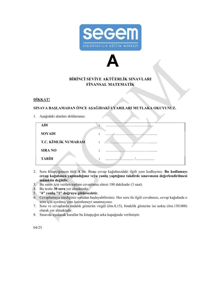 A BİRİNCİ SEVİYE AKTÜERLİK SINAVLARI FİNANSAL MATEMATİK DİKKAT! SINAVA BAŞLAMADAN ÖNCE AŞAĞIDAKİ UYARILARI MUTLAKA OKUYUNUZ. 1. Aşağıdaki alanları doldurunuz. ADI : ……………………………....... SOYADI : ………………………………....... T.C. KİMLİK NUMARASI : ………………………………....... SIRA NO : ………………………………....... TARİH : .............. /.............. /.................... 2. Soru kitapçığınızın türü A’dır. Bunu cevap kağıdınızdaki ilgili yere kodlayınız. Bu kodlamayı cevap kağıdınıza yapmadığınız veya yanlış yaptığınız takdirde sınavınızın değerlendirilmesi mümkün değildir. 3. Bu sınav için verilen toplam cevaplama süresi 180 dakikadır (3 saat). 4. Bu testte 30 soru yer almaktadır. 5. "4" yanlış "1" doğruyu götürecektir. 6. Cevaplamaya istediğiniz sorudan başlayabilirsiniz. Her soru ile ilgili cevabınızı, cevap kağıdında o soru için ayrılmış yere işaretlemeyi unutmayınız. 7. Soru ve cevaplarda ondalık gösterim virgül (örn.0,15), bindelik gösterim ise nokta (örn.150.000) olarak yer almaktadır. 8. Sınavda uyulacak kurallar bu kitapçığın arka kapağında verilmiştir. 04/25 AKTÜERLİK SINAVLARI-FİNANSAL MATEMATİK A Soru 2: 1.000 TL nominal değerli, vadesine 6 sene kalmış her sekiz ayda bir %10 kupon ödemesi olan tahvilin vadeye kadar getirisi %7 ise tahvilin bugünkü değeri aşağıdaki seçeneklerden hangisinde verilmiştir? A) 1.377 B) 1.272 C) 1.071 D) 1.029 E) 875 Doğru Seçenek: A 1 AKTÜERLİK SINAVLARI-FİNANSAL MATEMATİK A Soru-4: Ailesinden 1.000.000 TL miras kalan bir kişi %28 faiz ile bu parayı bankaya yatırmayı düşünmektedir. Buna karşılık miras kalan kişi tek seferde toplu para almak yerine gelecek aydan itibaren 50 sene boyunca her ay sabit bir tutar bankadan para çekerek dönem sonunda sıfır bakiyeye ulaşmayı hedeflemektedir. Her ay çekmesi gereken tutar aşağıdaki seçeneklerden hangisinde verilmiştir? A) 50.000 B) 40.000 C) 30.000 D) 20.000 E) 10.000 Doğru Seçenek: D 2 AKTÜERLİK SINAVLARI-FİNANSAL MATEMATİK A Soru-6: Ekonomik ömrü 5 sene olan bir projenin ilk yatırım maliyeti 300.000 TL’dir. Proje her sene 80.000 TL nakit girişi sağlayacaktır. Projenin hurda değeri 100.000 TL ve fırsat maliyeti %15 ise projenin net bugünkü değeri aşağıdaki seçeneklerden hangisinde verilmiştir? A) 180.079 B) 68.172 C) 47.392 D) 17.890 E) -31.828 Doğru Seçenek: D 3 AKTÜERLİK SINAVLARI-FİNANSAL MATEMATİK A Soru-8: Bir kişi aylık %3 faiz, Kaynak Kullanımı Destek Fonu (KKDF) (%15) ve Banka ve Sigorta Muameleleri Vergisi (BSMV) (%15) ile bankadan 6 ay vadeli 300.000 TL tüketici kredisi almıştır. Üçüncü ay sonunda kişinin bankaya kalan ana para borcunun tutarı aşağıdaki seçeneklerden hangisinde verilmiştir? A) 164.700 B) 162.150 C) 158.599 D) 140.042 E) 128.874 Doğru Seçenek: C 4 AKTÜERLİK SINAVLARI-FİNANSAL MATEMATİK A Soru-10: Sonsuza kadar %10 faiz oranı ile değerlenecek yıllık 1.000 TL kazanımların bugünkü değeri aşağıdaki seçeneklerden hangisinde verilmiştir? A) 10.000.000 B) 1.000.000 C) 100.000 D) 10.000 E) 1.000 Doğru Seçenek: D 5 AKTÜERLİK SINAVLARI-FİNANSAL MATEMATİK A Soru-12: Cenk bugün bir fona 50 TL, 20 yıl sonra ise 100 TL yatırmıştır. Fon, ilk 15 yıl çeyrekliğe dönüştürülebilir yıllık nominal bileşik iskonto oranına ve bundan sonraki yıllarda ise yarıyıllığa dönüştürülebilir yıllık %8 nominal bileşik faiz oranına göre değerlenmektedir. 35 yıl sonra fonun birikimli değeri 750 TL olarak hesaplanmıştır. Buna göre ’nin değeri aşağıdaki seçeneklerden hangisinde verilmiştir? A) 0,038 B) 0,040 C) 0,042 D) 0,044 E) 0,046 Doğru Seçenek: A 6 AKTÜERLİK SINAVLARI-FİNANSAL MATEMATİK A Soru 14: yıl sonunda 9.000 TL biriktirmek için ilk yıl her yılın sonunda 150 TL ve sonraki sonunda 100 TL yatırılıyor. Yıllık efektif faiz oranı için olarak verildiğine göre ‘nin değeri aşağıdaki seçeneklerden hangisinde verilmiştir? A) 0,08 B)0,09 C)0,10 D)0,11 yıl her yılın E)0,12 Doğru Seçenek: C 7 AKTÜERLİK SINAVLARI-FİNANSAL MATEMATİK A Soru 16: Gökçe sonsuz ödemeli annüiteye birinci yılın başında 1.000 TL ve diğer her yılın başında 150 TL yatıracaktır. Bunun karşılığında ise sonsuza kadar her yılın sonunda ödeme alacaktır. Gökçe’nin alacağı ilk ödemenin 100 TL olduğuna ve her sonraki ödemenin %5 oranında artacağına göre bu işlem için yıllık efektif faiz oranının değeri aşağıdaki seçeneklerden hangisinde verilmiştir? A)%4,66 B)%5,66 C)%6,66 D)%7,66 E)%8,66 Doğru Seçenek:E 8 AKTÜERLİK SINAVLARI-FİNANSAL MATEMATİK A Soru 18: Selim Bey, 5 yıl vadeli ve 11.000 TL tutarında bir ev tadilat kredisi alır. Kredi geri ödemelerini her ay sonunda yapar ve banka yıllık %6 efektif faiz oranı ile işlem yapar. Buna göre, 20. taksit içindeki anapara ödemesi tutarının değeri aşağıdaki seçeneklerden hangisinde verilmiştir? A)165,31 B)173,61 C)179,76 D)185,45 E)197,38 Doğru Seçenek: B 9 AKTÜERLİK SINAVLARI-FİNANSAL MATEMATİK A Soru-20: Bir kişi, 1.000 TL’sini ilk 2 yıl boyunca altı aylığa çevrilebilir nominal faiz oranı%6, sonraki 3 yıl boyunca üç aylığa çevrilebilir nominal faiz oranı %4 ile yatırıma yönlendirmektedir. Bu kişi, 5 yıl sonunda biriken parasını i yıllık efektif faiz oranı ile 5 yıl daha yatıracaktır. 10 yıl sonunda, biriken parası ile 5.000 TL değerinde olan bir varlığı satın alabilmesi için en az olması gereken i yıllık efektif faiz oranı aşağıdaki seçeneklerden hangisinde verilmiştir? (Virgülden sonra dört basamak kullanınız.) A)0,5325 B) 0,3157 C) 0,2058 D) 0,1518 E) 0,1015 Doğru Seçenek: B 10 AKTÜERLİK SINAVLARI-FİNANSAL MATEMATİK A Soru-22: Bir müşteri, bir bankadan yıllık bileşik %8 efektif faiz oranı ile 5 yıl vadeli 