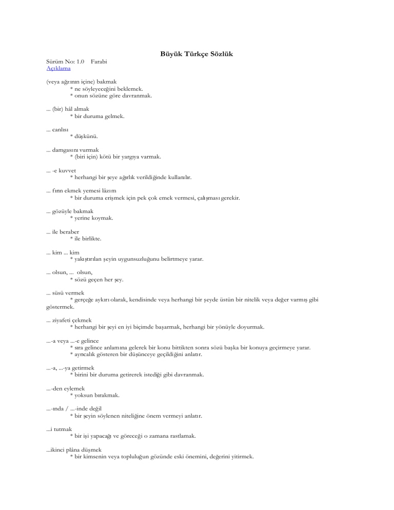 Büyük Türkçe Sözlük Sürüm No: 1.0 Açı klama Farabi (veya ağ zı nı n içine) bakmak * ne söyleyeceğini beklemek. * onun sözüne göre davranmak. ... (bir) hâl almak * bir duruma gelmek. ... canlı sı * düş künü. ... damgası nı vurmak * (biri için) kötü bir yargı ya varmak. ... -e kuvvet * herhangi bir ş eye ağ ı rlı k verildiğ inde kullanı lı r. ... fı rı n ekmek yemesi lâzı m * bir duruma eriş mek için pek çok emek vermesi, çalı ş ması gerekir. ... gözüyle bakmak * yerine koymak. ... ile beraber * ile birlikte. ... kim ... kim * yakı ş tı rı lan ş eyin uygunsuzluğ unu belirtmeye yarar. ... olsun, ... olsun, * sözü geçen her ş ey. ... süsü vermek * gerçeğ e aykı rı olarak, kendisinde veya herhangi bir ş eyde üstün bir nitelik veya değer varmı şgibi göstermek. ... ziyafeti çekmek * herhangi bir ş eyi en iyi biçimde baş armak, herhangi bir yönüyle doyurmak. ...-a veya ...-e gelince * sı ra gelince anlamı na gelerek bir konu bittikten sonra sözü baş ka bir konuya geçirmeye yarar. * ayrı calı k gösteren bir düş ünceye geçildiğ ini anlatı r. ...-a, ...-ya getirmek * birini bir duruma getirerek istediği gibi davranmak. ...-den eylemek * yoksun bı rakmak. ...-ı nda / ...-inde değil * bir ş eyin söylenen niteliğ ine önem vermeyi anlatı r. ...i tutmak * bir iş i yapacağ ıve göreceği o zamana rastlamak. ...ikinci plâna düş mek * bir kimsenin veya topluluğun gözünde eski önemini, değ erini yitirmek. ...ile beraber * -dı ğ ı/ -diği anda. * -dan / -den baş ka. * -dı ğ ı/ -diği hâlde. ...-ması yla, ...-mesi bir olmak * aynıanda, çabucacı k, birden. ...maya veya ...meye görsün (veya gör) * söz konusu fiilin doğ uracağ ısonuca kesinlik kazandı rmak için kullanı lı r. ...nı n resmidir... * bir durumun olacağ ıkesin ve bellidir. 19 Mayı s 30 Ağ ustos * Zafer Bayramı . a * Seslenme bildirir. a * (a:) Şaş ma, hatı rlama, sevinme, acı ma, üzülme, kı zma gibi duygularıgüçlendirir, cümlenin baş ı nda veya sonunda kullanı lı r. a/e * Çekimli fiilin sonuna gelerek anlamıpekiş tirir. -a- / -e-a / -e *İ simden fiil türeten ek. * Yönelme durumu eki: dağa, eve, yola, öne. Ünlü ile biten isimlerden sonra araya y sesi girer. -a / -e * Fiilden zarf türeten ek: yaza yaza, gide gide, koş a koş a, düş e kalka, güle oynaya. Ünlü ile biten fiillerden sonra araya y sesi girer: yaş aya yaş aya, bekleye bekleye, okuya okuya, yürüye yürüye. Bu ek göre, kala, geçe, sapa örneklerinde kalı plaş mı ş tı r. a, A ab aba * Türk alfabesinin birinci harfi, ses bilimi bakı mı ndan kalı n ünlülerin düz ve genişolanı nıgösterir. * Nota iş aretlerini harflerle gösterme yönteminde lâ sesini bildirir. * Su. * Yünden, dövülerek yapı lan kalı n ve kaba kumaş . * Bu kumaş tan yapı lmı şyakası z ve uzun üstlük. * Bu kumaş tan yapı lmı şolan. * Eskiden derviş lerin giydiği abadan yapı lmı ş , önü açı k hı rka. * Abla. * Anne. aba altı ndan değ nek (sopa) göstermek * yumuş ak görünmekle birlikte yine de gözünü korkutmak. aba gibi * (kumaşiçin) kaba ve kalı n. aba güreş i * Aba giyilerek ve bele kuş ak bağlanarak yapı lan bir tür güreş . aba vakti yaba, yaba vakti aba * kiş i, ihtiyaçları nıvaktinden önce ve ucuz olduğ u zaman karş ı lamalı dı r. abacı * Aba yapan veya satan kimse. * Abadan giyecek yapan veya satan kimse. * Bedavacı , asalak. abacıkebeci, ara yerde sen neci? * "anlamadı ğı n bu iş e ne karı ş ı yorsun?" anlamı nda kullanı lan bir söz. abacı lı k * Aba yapma veya satma iş i. * Abadan giyecek yapma veya satma iş i. abadî * Kalı nca ve açı k saman renginde, yarı mat bir yazıkâğ ı dı türü. abajur abajurcu * Iş ı ğ ıbir yere toplamak, doğrudan doğ ruya gözlere vurması nıönlemek için kullanı lan lâmba siperi. * Genellikle üzeri siperli masa lâmbasıveya ayaklılâmba. * Abajur yapan veya satan kimse. abajurculuk * Abajurcunun iş i veya mesleğ i. abajurlu * Abajuru olan. abaküs * Sayı boncuğ u, çörkü. abalı * Abasıolan, aba giymişolan. abandı rma * Abandı rmak iş i. abandı rmak * Bir kimsenin bir yere abanması nısağlamak. * Bir hayvanıyere çöktürmek. abandone * Dövüş emeyecek duruma gelen (boksör). abandone etmek * dövüş emeyecek duruma getirmek. abandone olmak * dövüş emeyecek duruma gelmek. abanî abanma * Sarı mtı rak dallınakı ş larla iş lenmişbir tür beyaz, ipek kumaş . * Bu kumaş tan yapı lmı ş . * Abanmak iş i. abanmak abanoz * Eğ ilerek bir ş eyin, bir kimsenin üzerine kapanmak. * Bir yere veya bir kimseye yaslanmak, dayanmak. * Bir ş eyin veya bir kimsenin üzerine çöküp çullanmak. * Birine yük olarak onun sı rtı ndan geçinmeye bakmak. * Abanozgillerin ağ ı r, sert ve siyah renkli tahtası . abanoz gibi * çok sert. abanoz kesilmek * sertleş erek dayanı klı lı ğ ıartmak. * kirden matlaş mak, rengini kaybetmek. abanozgiller *İ ki çeneklilerden, sı cak ülkelerde yetiş en ve kerestesine abanoz denilen bir bitki familyası . abanozlaş ma * Abanozlaş mak durumu alma. abanozlaş mak * Ağaç ve benzeri maddeler uzun süre suda kalarak kararmak. * (insan) uzun süre güneş te kalarak kararmak, yanmak. abartı * Abartma, mübalâğa. abartı cı * Bir ş eyi olduğ undan büyük veya çok gösterme huyunda olan (kimse), abartmacı , mübalâğacı . abartı cı lı k * Abartı cıolma durumu, abartmacı lı k, mübalâğ acı lı k. abartı lı * Olduğundan fazla gösterilen, mübalâğalı . abartı lma * Abartı lmak iş i. abartı lmak * Abartmak iş ine konu olmak, mübalâğ a edilmek. abartı sı z abartı ş abartma * Olduğundan fazla gösterilmeyen, mübalâğası z. * Abartmak iş i veya biçimi. * Abartmak iş i, mübalâğ a. abartmacı * Abartı cı , mübalâğacı . abartmacı lı k * Abartı cı lı k, mübalâğacı lı k. abartmak * Bir ş eyi o