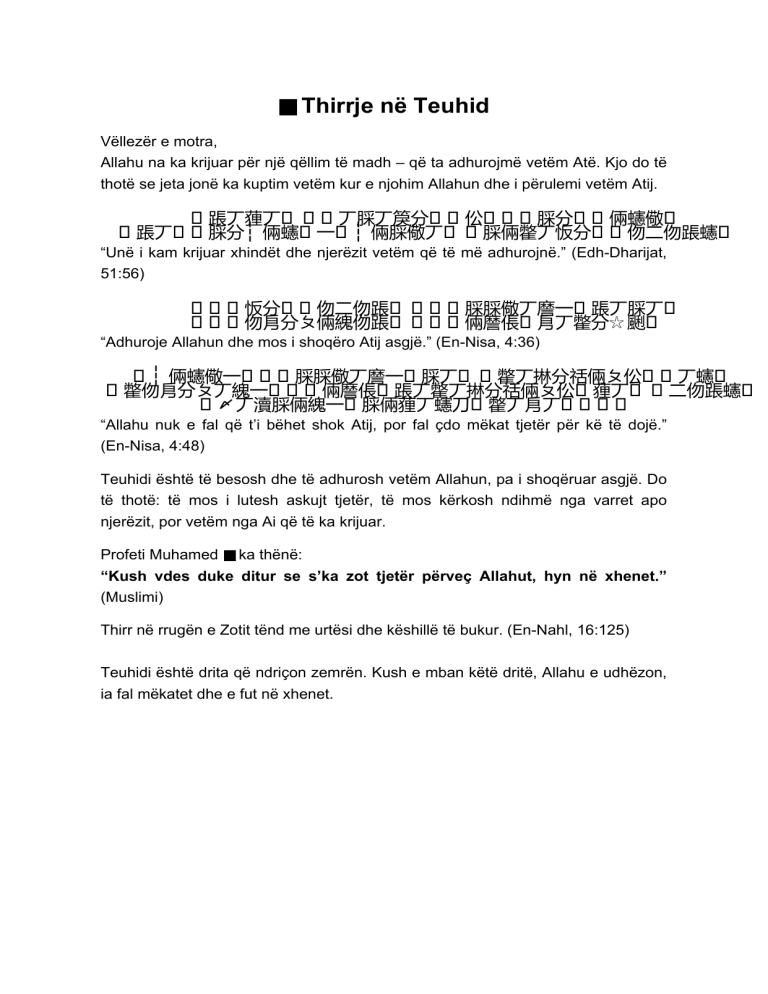 ■ Thirrje në Teuhid Vëllezër e motra, Allahu na ka krijuar për një qëllim të madh – që ta adhurojmë vetëm Atë. Kjo do të thotë se jeta jonë ka kuptim vetëm kur e njohim Allahun dhe i përulemi vetëm Atij. 䠆丆 䠆丆䔆丆 䐆分┆倆䘆 一 丆䐆丆䈆分 ┆倆䐆儆丆 伀 䐆分 倆䘆儆 䐆倆䨆丆㤆分 伆二伆䠆䘆 “Unë i kam krijuar xhindët dhe njerëzit vetëm që të më adhurojnë.” (Edh-Dharijat, 51:56) 㤆分 伆二伆䠆 伆㐆分ㄆ倆䌆伆䠆 䐆䐆儆丆䜆一 䠆丆䐆丆 倆䜆倀 㐆丆䨆分☆䬆 “Adhuroje Allahun dhe mos i shoqëro Atij asgjë.” (En-Nisa, 4:36) ┆倆䘆儆一 䐆䐆儆丆䜆一 䐆丆 䨆丆㨆分䄆倆ㄆ伀 䨆伆㐆分ㄆ丆䌆一 倆䜆倀 䠆丆䨆丆㨆分䄆倆ㄆ伀 䔆丆 〆丆瀆䐆倆䌆一 䐆倆䔆丆䘆刀 䨆丆㐆丆 “Allahu nuk e fal që t’i bëhet shok Atij, por fal çdo mëkat tjetër për kë të dojë.” (En-Nisa, 4:48) Teuhidi është të besosh dhe të adhurosh vetëm Allahun, pa i shoqëruar asgjë. Do të thotë: të mos i lutesh askujt tjetër, të mos kërkosh ndihmë nga varret apo njerëzit, por vetëm nga Ai që të ka krijuar. Profeti Muhamed ■ ka thënë: “Kush vdes duke ditur se s’ka zot tjetër përveç Allahut, hyn në xhenet.” (Muslimi) Thirr në rrugën e Zotit tënd me urtësi dhe këshillë të bukur. (En-Nahl, 16:125) Teuhidi është drita që ndriçon zemrën. Kush e mban këtë dritë, Allahu e udhëzon, ia fal mëkatet dhe e fut në xhenet. 丆䘆 二伆䠆䘆