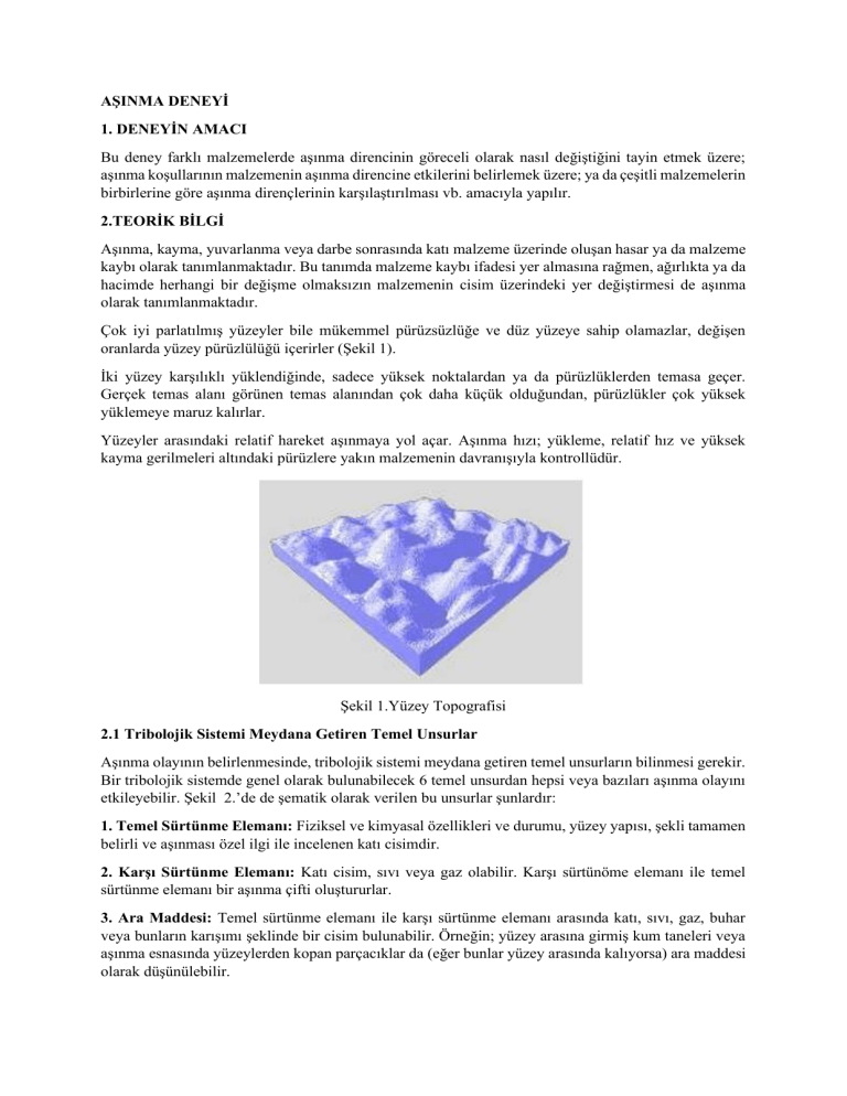 AŞINMA DENEYİ 1. DENEYİN AMACI Bu deney farklı malzemelerde aşınma direncinin göreceli olarak nasıl değiştiğini tayin etmek üzere; aşınma koşullarının malzemenin aşınma direncine etkilerini belirlemek üzere; ya da çeşitli malzemelerin birbirlerine göre aşınma dirençlerinin karşılaştırılması vb. amacıyla yapılır. 2.TEORİK BİLGİ Aşınma, kayma, yuvarlanma veya darbe sonrasında katı malzeme üzerinde oluşan hasar ya da malzeme kaybı olarak tanımlanmaktadır. Bu tanımda malzeme kaybı ifadesi yer almasına rağmen, ağırlıkta ya da hacimde herhangi bir değişme olmaksızın malzemenin cisim üzerindeki yer değiştirmesi de aşınma olarak tanımlanmaktadır. Çok iyi parlatılmış yüzeyler bile mükemmel pürüzsüzlüğe ve düz yüzeye sahip olamazlar, değişen oranlarda yüzey pürüzlülüğü içerirler (Şekil 1). İki yüzey karşılıklı yüklendiğinde, sadece yüksek noktalardan ya da pürüzlüklerden temasa geçer. Gerçek temas alanı görünen temas alanından çok daha küçük olduğundan, pürüzlükler çok yüksek yüklemeye maruz kalırlar. Yüzeyler arasındaki relatif hareket aşınmaya yol açar. Aşınma hızı; yükleme, relatif hız ve yüksek kayma gerilmeleri altındaki pürüzlere yakın malzemenin davranışıyla kontrollüdür. Şekil 1.Yüzey Topografisi 2.1 Tribolojik Sistemi Meydana Getiren Temel Unsurlar Aşınma olayının belirlenmesinde, tribolojik sistemi meydana getiren temel unsurların bilinmesi gerekir. Bir tribolojik sistemde genel olarak bulunabilecek 6 temel unsurdan hepsi veya bazıları aşınma olayını etkileyebilir. Şekil 2.’de de şematik olarak verilen bu unsurlar şunlardır: 1. Temel Sürtünme Elemanı: Fiziksel ve kimyasal özellikleri ve durumu, yüzey yapısı, şekli tamamen belirli ve aşınması özel ilgi ile incelenen katı cisimdir. 2. Karşı Sürtünme Elemanı: Katı cisim, sıvı veya gaz olabilir. Karşı sürtünöme elemanı ile temel sürtünme elemanı bir aşınma çifti oluştururlar. 3. Ara Maddesi: Temel sürtünme elemanı ile karşı sürtünme elemanı arasında katı, sıvı, gaz, buhar veya bunların karışımı şeklinde bir cisim bulunabilir. Örneğin; yüzey arasına girmiş kum taneleri veya aşınma esnasında yüzeylerden kopan parçacıklar da (eğer bunlar yüzey arasında kalıyorsa) ara maddesi olarak düşünülebilir. 4. Çevre: Ortam sıcaklığı,nem miktarı, ortam basıncı gibi çevresel faktörler çevre koşullarını belirler. 5. Yükleme: Etki eden yükün (kuvvetin) büyüklüğü, şekli (statik, dinamik, darbeli, titreşimli vs.) doğrultusu ve zamana göre değişimi yüklemeyi meydana getirir. 6. Hareket: Temel sürtünme elemanının karşı sürtünme elemanına göre bağıl hareketinin cinsi (kayma, yuvarlanma, çarpma vs.) büyüklüğü, doğrultusu ile verilir. Aşınma miktarının belirlenmesinde hareket süresi önemli bir etkendir. Aşınmanın meydana gelmesinde gerekli bir unsurdur. 2.2 Aşınma Mekanizması ve Türleri Aşınma mekanik ve / veya kimyasal yollarla oluşur ve genellikle sürtünmeden dolayı ısınma ile hızlanır. Aşınma hasarları, 5 farklı mekanizmayla gerçekleşmektedir. Ancak temel prensip katı malzemenin yüzeyden kopmasıdır. Buna göre aşınma mekanizmaları, 1. Adhezif aşınma 2. Abrasif aşınma 3. Yorulma ve tabakalı (delaminasyon) aşınma 4. Erozyon ve çarpma etkisiyle aşınma 5. Kimyasal/Oksidatif aşınma olarak sıralanmaktadır. Bunların dışındaki mekanizmalar, yukarıda sıralanan 5 farklı mekanizmanın kombinasyonları şeklinde karşımıza çıkmaktadır. Şekil 3. Dört Aşınma Tipinin Şematik Gösterimi 2.2.1 Adhezyon (Yapışma) Aşınması Adhezif aşınması iki katı yüzeyin kayma sırasında birbirleriyle etkileşimi sonucu oluşur. Adhezyon (bağlanma, yapışma) yüzeydeki pürüzlerin bağlanmasıyla oluşmaktadır. Kayma sırasında meydana gelen kesme gerilmelerinin sonucu olarak, bağlantı noktalarında kopma gerçekleşir ve malzeme kaybı meydana gelir. Buna göre adhezif aşınma sırasında, yüzeydeki pürüzler birbirlerine kaynar, bunu takiben bağlantı yerlerinden kopmalar meydana gelmektedir. Kopan parçacıklar iki yüzey arasında yeni temas alanları (ikincil temaslar) oluşmasını sağlamaktadır. Kopan parçaların birbirleriyle temaslarının artmasıyla bu parçalar topaklanır ve bu topaklar kayan iki yüzey arasında hareket eder, iki yüzey arasında büyüyen bu parçalar yükün de etkisiyle levha haline gelir. Sonuç olarak, yüzeylerde yapışık halde, kayma yönünde kompozit yapıda levha tipi aşınma partikülleri oluşur. 2.2.2 Abrazyon Aşınması Abrazyon aşınması, yüzey pürüzlülüklerinin yüzey veya sert parçacıklar tarafından plastik deformasyona uğratılması koparılması ile oluşur. Kırılma tokluğu yüksek olan yumuşak metaller, seramikler kayma esnasında sert parçacıklar tarafından plastik akışa uğratır. Kırılma tokluğu düşük olan gevrek malzemelerde, yüzey pürüzlülüğü kırılması ile madde kaybına uğrarlar. 2.2.3 Yorulma ve Tabakalı (Delaminasyon) Aşınması Adhezif ve abrasif aşınmada sürekli bir temas mevcut iken, çevrimsel bir temasın söz konusu olduğu durumlarda, farklı bir aşınma mekanizması ortaya çıkmaktadır. Bu tür çevrimsel temaslar sonucu oluşan aşınma türüne yorulma aşınması adı verilmektedir. Eğer çevrim sayısı yüksek ise, yüksek çevrimli yorulma aşınması, çevrim sayısı düşük ise düşük çevrimli yorulma aşınmasının oluşması beklenmektedir. Dönen yapı elemanları için genellikle parçalar arasında elastik bir temas söz konusudur. Temas noktasında, ana aşınma mekanizması yüksek çevrimli yorulma aşınmasıdır. Temas altında ortaya çıkan gerilme, malzemenin akma dayanımından yüksek olmamasına rağmen, temas eden noktalardaki, boşluk, tane sınırı ve inklüzyonlar nedeniyle yerel olar
