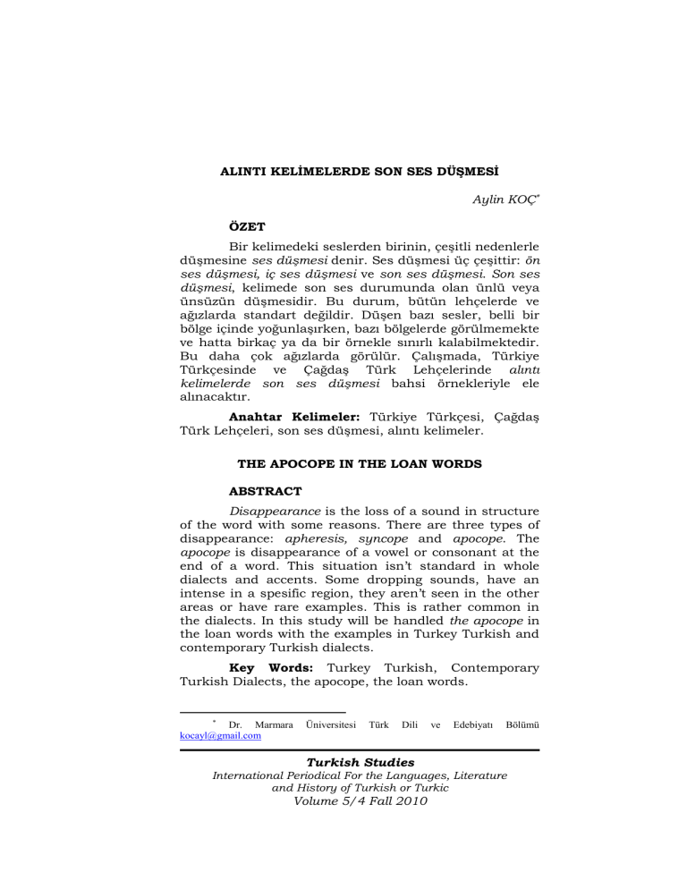 ALINTI KELİMELERDE SON SES DÜŞMESİ Aylin KOÇ ÖZET Bir kelimedeki seslerden birinin, çeşitli nedenlerle düşmesine ses düşmesi denir. Ses düşmesi üç çeşittir: ön ses düşmesi, iç ses düşmesi ve son ses düşmesi. Son ses düşmesi, kelimede son ses durumunda olan ünlü veya ünsüzün düşmesidir. Bu durum, bütün lehçelerde ve ağızlarda standart değildir. Düşen bazı sesler, belli bir bölge içinde yoğunlaşırken, bazı bölgelerde görülmemekte ve hatta birkaç ya da bir örnekle sınırlı kalabilmektedir. Bu daha çok ağızlarda görülür. Çalışmada, Türkiye Türkçesinde ve Çağdaş Türk Lehçelerinde alıntı kelimelerde son ses düşmesi bahsi örnekleriyle ele alınacaktır. Anahtar Kelimeler: Türkiye Türkçesi, Çağdaş Türk Lehçeleri, son ses düşmesi, alıntı kelimeler. THE APOCOPE IN THE LOAN WORDS ABSTRACT Disappearance is the loss of a sound in structure of the word with some reasons. There are three types of disappearance: apheresis, syncope and apocope. The apocope is disappearance of a vowel or consonant at the end of a word. This situation isn’t standard in whole dialects and accents. Some dropping sounds, have an intense in a spesific region, they aren’t seen in the other areas or have rare examples. This is rather common in the dialects. In this study will be handled the apocope in the loan words with the examples in Turkey Turkish and contemporary Turkish dialects. Key Words: Turkey Turkish, Contemporary Turkish Dialects, the apocope, the loan words. Dr. Marmara [email protected] Üniversitesi Türk Dili Turkish Studies ve Edebiyatı Bölümü International Periodical For the Languages, Literature and History of Turkish or Turkic Volume 5/4 Fall 2010 1340 Aylin KOÇ Ses düşmesi, çeĢitli nedenlerle kelimelerin ön, iç ve son seslerinde ünlü veya ünsüz düĢmesi biçiminde kendini gösteren bir ses hadisesidir. Ses düĢmesi, ön ses düşmesi, iç ses düşmesi ve son ses düşmesi olmak üzere üç çeĢittir. Son ses düşmesi, kelimede son ses durumunda olan bir ünlü veya ünsüzün düĢmesidir. Türkçeye, ses düĢmesi açısından bakıldığında, kalıcı ses düĢmelerinin yanı sıra bazı ses düĢmelerinin yazı dili hâline gelememiĢ ağızlarda veya bölgeden bölgeye değiĢebilen ve bir kısmı yazı diline aktarılmayan geçici ses düĢmeleri hâlinde olduğu görülür. Bu durumda, kalıcı düĢmeler yazı diline yansıyan düĢmeleri; geçici düĢmeler ise ağızlarda görülen ve bir yazı dili içerisinde bölgeden bölgeye değiĢebilen düĢmeleri göstermektedir. Diğer bir ifadeyle düĢen seslerin standart olarak bütün lehçe ve ağızlarda ortak olmadığıdır. DüĢen bazı sesler belli bir bölge içerisinde yoğunlaĢırken, bazı bölgelerde görülmemekte veya sadece birkaç, hatta bir örnekle sınırlı kalabilmektedir. Türkçe, kendi ses düzenine uygun olmayan alıntı kelimelere, genellikle kendi kurallarını uygular. Dilin kendi uyarlaması olarak ifade edebileceğimiz bu düzenlemelerden bir tanesi de son ses düşmesidir. Bu çalıĢmada, Türkçeye girmiĢ olan alıntı kelimelerin son seslerindeki ünsüz düĢmesi bahsi Türkiye Türkçesi, Türkiye Türkçesi Ağızları ve ÇağdaĢ Türk Lehçeleri baĢlıkları altında ele alınacaktır. ÇalıĢma genel olarak, ağızlar ve lehçeler üzerinde yapılan çalıĢmaların son ses düşmesi bahsi taranarak oluĢturulmuĢtur. Tespit edilen örneklere dayanılarak, alıntı kelimeler, ünsüz+ünsüz durumundaki son ses (ünsüz) düşmesi ve ünlü+ünsüz durumundaki son ses (ünsüz) düşmesi olmak üzere iki ana baĢlık altında değerlendirilmiĢtir. Ünsüzlerin sıralamasında ise örnek yoğunluğu dikkate alınmıĢtır. 1. Ünsüz+Ünsüz durumundaki son ses (ünsüz) düşmesi: Türkçede sonu çift ünsüzle biten alıntı kelimelerde sondaki ünsüzün bazen düĢtüğü görülür. Bunun sebebi, kelime sonunda aynı hecede art arda gelen çift ünsüzün söyleniĢ zorluğudur. Bu söyleniĢ zorluğunu ortadan kaldırmak amacıyla sondaki ünsüz düĢebilir. Böylelikle alıntı kelime dilin bünyesine uydurulmuĢ olur. Bu hadise genellikle konuĢma dilinde ve ağızlarda, kısmen de yazı dilinde görülmektedir. Son ses (ünsüz) düĢmesi, sırasıyla t (bt, ft, ht, kt, nt, rt, st, şt); d (nd, kd, sd, zd); h (ch, dh, rh, th); k (sk, şk, zk); g (ng, rg); s (ns) ünsüzlerinde görülür. Sondaki ünsüzün düĢmesi sırasında, son ünsüzden önceki ünsüzün bazen değiĢmeden kaldığı bazen de bu hadisenin etkisiyle değiĢtiği tespit edilmiĢtir. Bunun yanı sıra, gerek Türkiye Türkçesinin gerekse diğer ÇağdaĢ Türk Lehçelerinin yazı dilinde bazı alıntı kelimelerin ikili kullanımları mevcuttur: Turkish Studies International Periodical For the Languages, Literature and History of Turkish or Turkic Volume 5/4 Fall 2010 Alıntı Kelimelerde Son Ses Düşmesi… 1341 aptes~abdest < Far. âbdest, çıra~çerâg < Far. çerâġ, mis~misk < Ar. misk, usta~üstat < Far. ustâd gibi. Bu durumda, yazı dilinde hem kelimenin aslî Ģekli kullanılmakta hem de ses değiĢikliğine uğramıĢ Ģekli kullanılmaktadır. 1.1. Ünsüz+Ünsüz durumundaki “t” düĢmesi: Bu durumun özellikle konuĢma dilinde ve ağızlarda örnekleri çokça mevcuttur. Kelime sonunda “t” ünsüzü düĢerken kendinden önceki ünsüz bazen değiĢmeden kalır: büs < büst, serbes < serbest, çif < çift gibi. Bazen de “t” ünsüzü düĢerken kendinden önceki ünsüz ses değiĢikliğine uğrar: raz < rast, apdez < abdest, poş < post gibi. Fransızca kaynaklı alıntı kelimelerde Ģu hususu göz önünde bulundurmak gerekir: Orijinal dilin konuĢma dilinde doküman < Fr. document, kompliman < Fr. compliment, departman < Fr. département gibi kelimelerin sonundaki “t”ler telaffuz edilmez. Bu durumda Türkiye Türkçesindeki bu tür alıntı kelimelerde, kelimenin orijinal d