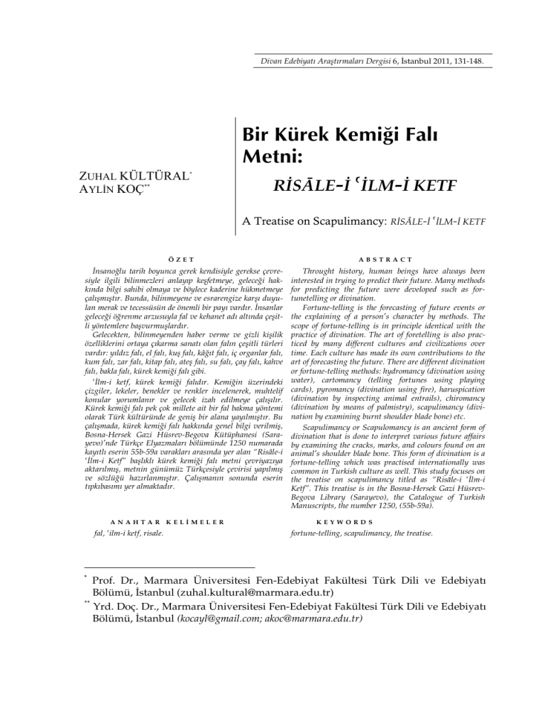 Divan Edebiyatı Araştırmaları Dergisi 6, İstanbul 2011, 131-148. ZUHAL KÜLTÜRAL* AYLİN KOÇ Bir Kürek Kemiği Falı Metni: RİSĀLE-İ ˘İLM-İ KETF A Treatise on Scapulimancy: RİSÂLE-İ ˘İLM-İ KETF ÖZET ABSTRACT İnsanoğlu tarih boyunca gerek kendisiyle gerekse çevresiyle ilgili bilinmezleri anlayıp keşfetmeye, geleceği hakkında bilgi sahibi olmaya ve böylece kaderine hükmetmeye çalışmıştır. Bunda, bilinmeyene ve esrarengize karşı duyulan merak ve tecessüsün de önemli bir payı vardır. İnsanlar geleceği öğrenme arzusuyla fal ve kehanet adı altında çeşitli yöntemlere başvurmuşlardır. Gelecekten, bilinmeyenden haber verme ve gizli kişilik özelliklerini ortaya çıkarma sanatı olan falın çeşitli türleri vardır: yıldız falı, el falı, kuş falı, kâğıt falı, iç organlar falı, kum falı, zar falı, kitap falı, ateş falı, su falı, çay falı, kahve falı, bakla falı, kürek kemiği falı gibi. ˘İlm-i ketf, kürek kemiği falıdır. Kemiğin üzerindeki çizgiler, lekeler, benekler ve renkler incelenerek, muhtelif konular yorumlanır ve gelecek izah edilmeye çalışılır. Kürek kemiği falı pek çok millete ait bir fal bakma yöntemi olarak Türk kültüründe de geniş bir alana yayılmıştır. Bu çalışmada, kürek kemiği falı hakkında genel bilgi verilmiş, Bosna-Hersek Gazi Hüsrev-Begova Kütüphanesi (Sarayevo)’nde Türkçe Elyazmaları bölümünde 1250 numarada kayıtlı eserin 55b-59a varakları arasında yer alan “Risâle-i ˘İlm-i Ketf” başlıklı kürek kemiği falı metni çevriyazıya aktarılmış, metnin günümüz Türkçesiyle çevirisi yapılmış ve sözlüğü hazırlanmıştır. Çalışmanın sonunda eserin tıpkıbasımı yer almaktadır. Throught history, human beings have always been interested in trying to predict their future. Many methods for predicting the future were developed such as fortunetelling or divination. Fortune-telling is the forecasting of future events or the explaining of a person’s character by methods. The scope of fortune-telling is in principle identical with the practice of divination. The art of foretelling is also practiced by many different cultures and civilizations over time. Each culture has made its own contributions to the art of forecasting the future. There are different divination or fortune-telling methods: hydromancy (divination using water), cartomancy (telling fortunes using playing cards), pyromancy (divination using fire), haruspication (divination by inspecting animal entrails), chiromancy (divination by means of palmistry), scapulimancy (divination by examining burnt shoulder blade bone) etc. Scapulimancy or Scapulomancy is an ancient form of divination that is done to interpret various future affairs by examining the cracks, marks, and colours found on an animal’s shoulder blade bone. This form of divination is a fortune-telling which was practised internationally was common in Turkish culture as well. This study focuses on the treatise on scapulimancy titled as “Risāle-i ˘İlm-i Ketf”. This treatise is in the Bosna-Hersek Gazi HüsrevBegova Library (Sarayevo), the Catalogue of Turkish Manuscripts, the number 1250, (55b-59a). ANAHTAR KELİMELER fal, ˘ilm-i ketf, risale. * KEYWORDS fortune-telling, scapulimancy, the treatise. Prof. Dr., Marmara Üniversitesi Fen-Edebiyat Fakültesi Türk Dili ve Edebiyatı Bölümü, İstanbul ([email protected]) Yrd. Doç. Dr., Marmara Üniversitesi Fen-Edebiyat Fakültesi Türk Dili ve Edebiyatı Bölümü, İstanbul ([email protected]; [email protected]) 132 ● DİVAN EDEBİYATI ARAŞTIRMALARI DERGİSİ I. Giriş İnsanoğlu tarih boyunca gerek kendisiyle gerekse çevresiyle ilgili bilinmezlikleri anlayıp keşfetme, istikbalin neler getireceğini öğrenme arzusu içinde olmuştur. Bunda meçhule ve esrarengize olan merak duygusunun büyük etkisi vardır. İnsanlar geleceği öğrenme arzusuyla fal ve kehanet adı altında çeşitli yöntemlere başvurmuşlardır. Fal; genel olarak çeşitli tekniklerle gelecekten ve bilinmeyenden haber verme, gizli kişilik özelliklerini ortaya çıkarma sanatıdır. Falda çeşitli araçlar ve teknikler kullanılmış, buna göre de değişik fal türleri ortaya çıkmıştır: yıldız falı, el falı, kuş falı, kâğıt falı, iç organlar falı, kum falı, zar falı, kitap falı, ateş falı, su falı, çay falı, kahve falı, bakla falı, kürek kemiği falı gibi…(Aydın 1995: 134-135). Bu çalışmada, kürek kemiği falı hakkında genel bilgi verilmiş, Bosna-Hersek Gazi Hüsrev-Begova Kütüphanesi (Sarayevo)’nde Türkçe Elyazmaları bölümünde 1250 numarada kayıtlı eserin 55b-59a varakları arasında yer alan “Risâle-i ˘İlm-i Ketf” başlıklı kürek kemiği falı metni çevriyazıya aktarılmış, metnin günümüz Türkçesiyle çevirisi yapılmış ve sözlüğü hazırlanmıştır. Çalışmanın sonunda eserin tıpkıbasımı yer almaktadır. II. Kürek Kemiği Falı Divânu Lügâti’t-Türk’te yarın olarak adlandırılan “kürek kemiği” için diğer Türk lehçelerinde aynı kökten gelen, ancak lehçe hususiyetlerine göre fonetik değişmeye uğramış kelimeler kullanılmaktadır. Eski Yunanlılarda ve Romalılarda mevcudiyeti bilinen kürek kemiği falına Yunancada ωμοπλατοσκοπία, Latincede skapulimantia adı verilirdi. Araplar bu falı eski Yunan ilimlerinden sayarak ilmü’l-ketf (kürek kemiği bilgisi) adıyla bir bilim dalı olarak kabul etmiş, bu konuda risaleler yazmışlardır (İnan 1986: 152). İslam dünyasında bu fal çeşidi kıtfe/kitfe adıyla da bilinmektedir. Bunun için koyunun kürek kemiği kullanılır. Kemiğin üzerindeki kırmızı hat kan döküleceğine, sarı çizgi hastalığa, yeşil bolluk ve ucuzluğa, siyah ise darlık ve yoksulluğa işaret sayılmıştır (Duvarcı 1993: 20). Bir Kürek Kemiği Falı: Risâle-i ‘İlm-i Ketf ● 133 Çinlilerde kürek 