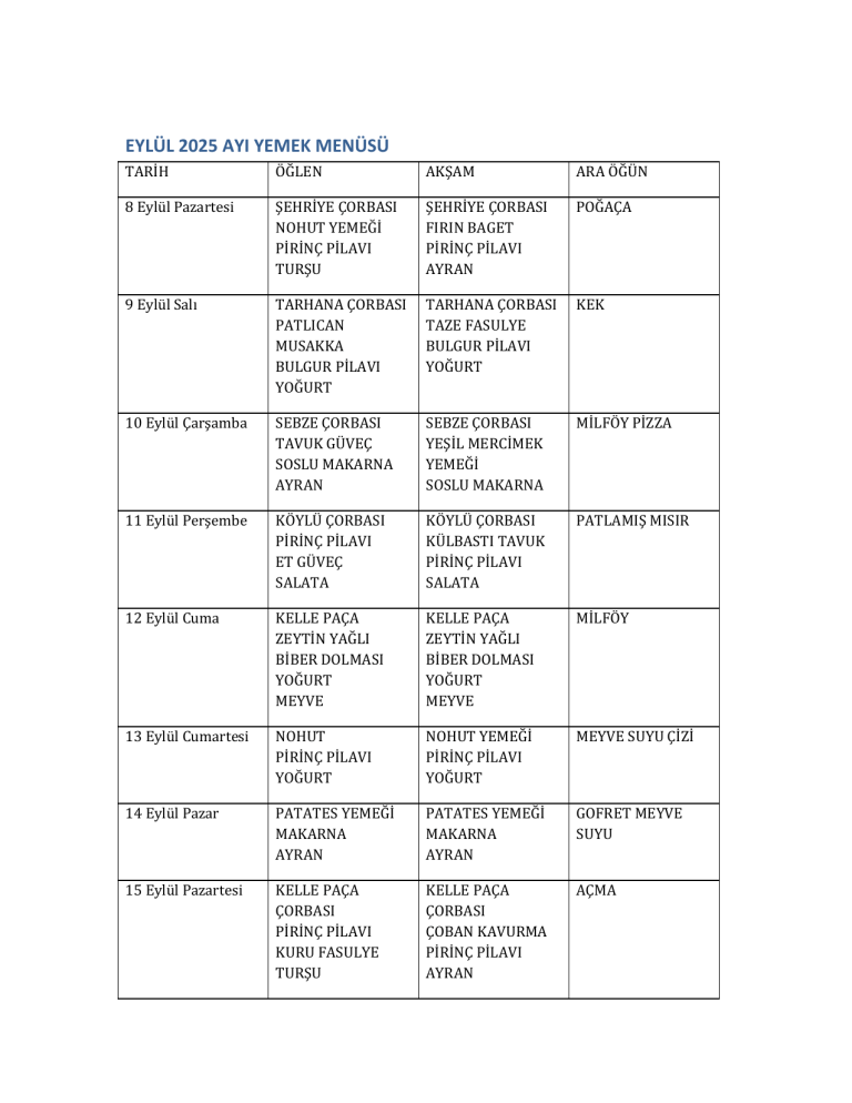 EYLÜL 2025 AYI YEMEK MENÜSÜ TARİH ÖĞLEN AKŞAM ARA ÖĞÜN 8 Eylül Pazartesi ŞEHRİYE ÇORBASI NOHUT YEMEĞİ PİRİNÇ PİLAVI TURŞU ŞEHRİYE ÇORBASI FIRIN BAGET PİRİNÇ PİLAVI AYRAN POĞAÇA 9 Eylül Salı TARHANA ÇORBASI PATLICAN MUSAKKA BULGUR PİLAVI YOĞURT TARHANA ÇORBASI TAZE FASULYE BULGUR PİLAVI YOĞURT KEK 10 Eylül Çarşamba SEBZE ÇORBASI TAVUK GÜVEÇ SOSLU MAKARNA AYRAN SEBZE ÇORBASI YEŞİL MERCİMEK YEMEĞİ SOSLU MAKARNA MİLFÖY PİZZA 11 Eylül Perşembe KÖYLÜ ÇORBASI PİRİNÇ PİLAVI ET GÜVEÇ SALATA KÖYLÜ ÇORBASI KÜLBASTI TAVUK PİRİNÇ PİLAVI SALATA PATLAMIŞ MISIR 12 Eylül Cuma KELLE PAÇA ZEYTİN YAĞLI BİBER DOLMASI YOĞURT MEYVE KELLE PAÇA ZEYTİN YAĞLI BİBER DOLMASI YOĞURT MEYVE MİLFÖY 13 Eylül Cumartesi NOHUT PİRİNÇ PİLAVI YOĞURT NOHUT YEMEĞİ PİRİNÇ PİLAVI YOĞURT MEYVE SUYU ÇİZİ 14 Eylül Pazar PATATES YEMEĞİ MAKARNA AYRAN PATATES YEMEĞİ MAKARNA AYRAN GOFRET MEYVE SUYU 15 Eylül Pazartesi KELLE PAÇA ÇORBASI PİRİNÇ PİLAVI KURU FASULYE TURŞU KELLE PAÇA ÇORBASI ÇOBAN KAVURMA PİRİNÇ PİLAVI AYRAN AÇMA 16 Eylül Salı DOMATES ÇORBASI İZMİR KÖFTE BULGUR PİLAVI SALATA DOMATES ÇORBASI BULGUR PİLAVI BARBUNYA SALATA KURABİYE 17 Eylül Çarşamba MERCİMEK ÇORBASI TAZE FASULYE MAKARNA KEMAL PAŞA TATLISI MERCİMEK ÇORBASI TAVUK ŞİNİTZEL MAKARNA KEMAL PAŞA TATLISI KEK 18 Eylül Perşembe ŞEHRİYE ÇORBASI TAVUK GÜVEÇ PİRİNÇ PİLAVI AYRAN ŞEHRİYE ÇORBASI PİRİNÇ PİLAVI BEZELYE YEMEĞİ AYRAN BÖREK 19 Eylül Cuma TAVUK SUYU ÇORBASI MANTI YOĞURT HÖŞMERİM TATLISI TAVUK SUYU ÇORBASI MANTI YOĞURT HÖŞMERİM TATLISI PATLAMIŞ MISIR 20 Eylül Cumartesi ÇIĞIRTMA YOĞURT HÖŞMERİM TATLISI MAKARNA ÇIĞIRTMA YOĞURT HÖŞMERİM TATLISI MAKARNA KEK,MEYVE SUYU 21 Eylül Pazar KÖFTE MAKARNA AYRAN KÖFTE MAKARNA AYRAN MEYVE SUYU 22 Eylül Pazartesi TAVUK SUYU ÇORBASI BARBUNYA PİRİNÇ PİLAVI TURŞU TAVUK SUYU ÇORBASI KAVURMA PİRİNÇ PİLAVI TURŞU SİMİT 23 Eylül Salı DOMATES ÇORBASI FIRIN BAGET TEREYAĞLI ERİŞTE SALATA DOMATES ÇORBASI BEZELYE YEMEĞİ TEREYAĞLI ERİŞTE SALATA KISIR 24 Eylül Çarşamba KELLE PAÇA ÇORBASI KELLE PAÇA ÇORBASI TAHİNLİ KURABİYE TÜRLÜ YEMEĞİ SOSLU MAKARNA YOĞURT MANTI YOĞURT KADAYIF TATLISI KEK 25 Eylül Perşembe TARHANA ÇORBASI KIYMALI PATATES OTURTMA BULGUR PİLAVI CACIK TARHANA ÇORBASI NOHUT BULGUR PİLAVI CACIK KURABİYE 26 Eylül Cuma MERCİMEK ÇORBASI TAVUKLU PİLAV AYRAN MEYVE MERCİMEK ÇORBASI TAVUKLU PİLAV AYRAN MEYVE PATLAMIŞ MISIR 27 Eylül Cumartesi KURU FASULYE PİLAV TURŞU KURU FASULYE PİLAV TURŞU MEYVE SUYU, KEK 28 Eylül Pazar KARIŞIK KIZARTMA YOĞURT MAKARNA KARIŞIK KIZARTMA YOĞURT MAKARNA MEYVE SUYU, GOFRET 29 Eylül Pazartesi TAVUK SUYU ÇORBASI YEŞİL MERCİMEK ERİŞTE TURŞU TAVUK SUYU ÇORBASI ZEYTİN YAĞLI BİBER DOLMASI YOĞURT İRMİK HELVASI POĞAÇA 30 Eylül Salı BUĞDAY ÇORBASI ORMAN KEBABI PİRİNÇ PİLAVI AYRAN BUĞDAY ÇORBASI ZEYTİN YAĞLI KABAK YEMEĞİ PİRİNÇ PİLAVI AYRAN KEK