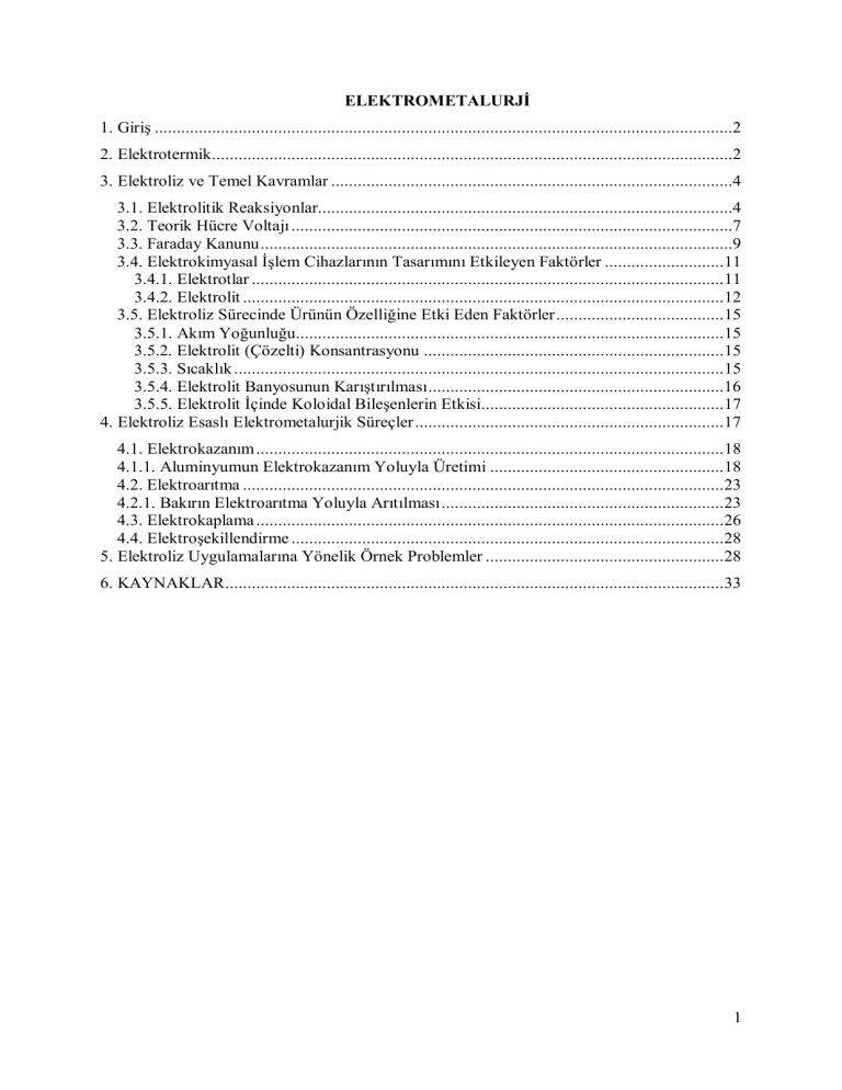 ELEKTROMETALURJİ 1. Giriş ...................................................................................................................................2 2. Elektrotermik ......................................................................................................................2 3. Elektroliz ve Temel Kavramlar ...........................................................................................4 3.1. Elektrolitik Reaksiyonlar..............................................................................................4 3.2. Teorik Hücre Voltajı ....................................................................................................7 3.3. Faraday Kanunu ...........................................................................................................9 3.4. Elektrokimyasal İşlem Cihazlarının Tasarımını Etkileyen Faktörler ...........................11 3.4.1. Elektrotlar ...........................................................................................................11 3.4.2. Elektrolit .............................................................................................................12 3.5. Elektroliz Sürecinde Ürünün Özelliğine Etki Eden Faktörler ......................................15 3.5.1. Akım Yoğunluğu.................................................................................................15 3.5.2. Elektrolit (Çözelti) Konsantrasyonu ....................................................................15 3.5.3. Sıcaklık ...............................................................................................................15 3.5.4. Elektrolit Banyosunun Karıştırılması ...................................................................16 3.5.5. Elektrolit İçinde Koloidal Bileşenlerin Etkisi.......................................................17 4. Elektroliz Esaslı Elektrometalurjik Süreçler ......................................................................17 4.1. Elektrokazanım ..........................................................................................................18 4.1.1. Aluminyumun Elektrokazanım Yoluyla Üretimi .....................................................18 4.2. Elektroarıtma .............................................................................................................23 4.2.1. Bakırın Elektroarıtma Yoluyla Arıtılması ................................................................23 4.3. Elektrokaplama ..........................................................................................................26 4.4. Elektroşekillendirme ..................................................................................................28 5. Elektroliz Uygulamalarına Yönelik Örnek Problemler ......................................................28 6. KAYNAKLAR .................................................................................................................33 1 ELEKTROMETALURJİ 1. Giriş Elektrometalurji, cevher veya her çeşit madde içindeki metallerin, elektrik enerjisi kullanılarak üretilmesi işlemidir. Bu amaçla elektrik enerjisinden iki şekilde yararlanılır. Elektrometalurjik uygulamaların bir kısmı elektrik akımının direnç vasıtasıyla ısıya dönüştürüldüğü elektrik fırınlarında, diğer kısmı ise iyon transferinin esas olduğu elektroliz hücrelerinde gerçekleştirilmektedir. Birincisi için, değişik şekillerde direnç kullanılarak ısıtmanın sağlandığı elektrik fırınlarının tümü örnek verilebilir. İkincisi için ise bakırın sulu bir çözelti ortamından kazanılması ve arıtılması veya aluminyumun ergimiş bir tuz banyosunda oksidinden indirgenmesi örnek gösterilebilir. 2. Elektrotermik Elektrik enerjisi, metalurjik işlemlerde ısı sağlamak amacıyla da kullanılır. Elektrik fırınları çeşitli metal veya alaşımların arıtılması, ergitilmesi, alaşım yapma ve dökümü amacıyla ergitilmesi için kullanılmaktadır. Bu uygulamalarda gereksinilen yüksek sıcaklık direnç, ark veya endüksiyon yoluyla sağlanmaktadır. Isı metalin veya şarjın içinde oluşur. Isının elektrikle sağlanması; (a) Normal yakıtlarla erişilemeyen yüksek sıcaklıkların elde edilebilmesi, (b) Büyük miktarlarda yakıt havasının ısıtılması gibi bir durumun olmaması, (c) Daha temiz bir ürünün elde edilmesi gibi önemli avantajlara sahiptir. Ancak giderler diğer yakıtlarla yapılan izabe işlemlerinden daha fazladır. Çeşitli fırın ve yakıt türlerine göre değişen ergitme hızı, sıcaklık ve ergitme türü ile ilgili bilgiler Tablo 2.1’de verilmiştir. Ferro alaşımlar ve birçok alaşımlı çelikler ancak elektrik fırınlarında yapılabilir. Elektrotermik metotların sakıncası, enerji maliyetinin çok yüksek olmasıdır. Bu nedenle elektrik enerjisinin ucuz olduğu yerlerde daha çok kullanılmaktadır. Elektrik enerjisi yukarıdaki kullanım şekilleri ile birlikte daha çok fiziksel karakterli birçok ara aşamada da kullanılmaktadır. Bu uygulamalardan bazıları, (a) Katı, sıvı ve gaz ürünlerin reaksiyon bölgesinden uzaklaştırılması, (b) Malzemeyi kurutma, (c) Hammadde veya ürünleri harmanlama veya karıştırma, (d) Çözeltiyi buharlaştırma, (e) Gazları toz ve zehirli bileşenlerinden temizlemedir. 2 Tablo 2.1. Çeşitli fırın ve yakıt türlerine göre uygulama değerleri Ergitme Fırını Yakıt Kapasite (ton Fe) Ergitme hızı (Ton Fe/h) Uygulanan sıcaklık (oC) Ergitilen Metaller Pota Fuel-oil, gaz, kok 0.5–1.0 0.4–0.75 200–1400 Döner Fuel-oil, pulvarize kömür 0.5–5.0 0.1–5.0 800–1500 Direkt ark Elektrik 200’e kadar 2–40 1250–1750 İndirekt ark Elektrik 0.25–2.0 0.25–1.0 1000–1750 İndüksiyon Elektrik 25–50 0.5–3.0 600–1750 Al, Zn, pirinç, dökme demir, vb. Al alaşımları, pirinç, bronz, dökme, demir, çelik vb. Çelik, dökme demir