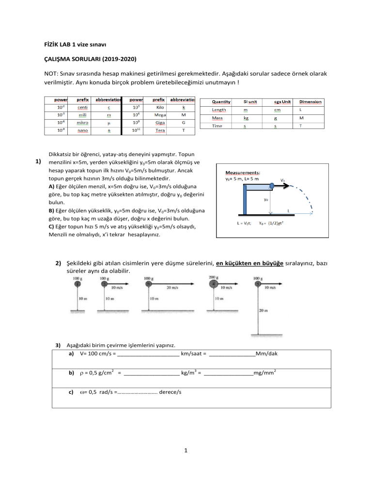 FİZİK LAB 1 vize sınavı ÇALIŞMA SORULARI (2019-2020) NOT: Sınav sırasında hesap makinesi getirilmesi gerekmektedir. Aşağıdaki sorular sadece örnek olarak verilmiştir. Aynı konuda birçok problem üretebileceğimizi unutmayın ! 1) Dikkatsiz bir öğrenci, yatay-atış deneyini yapmıştır. Topun menzilini x=5m, yerden yüksekliğini y0=5m olarak ölçmüş ve hesap yaparak topun ilk hızını V0=5m/s bulmuştur. Ancak topun gerçek hızının 3m/s olduğu bilinmektedir. A) Eğer ölçülen menzil, x=5m doğru ise, V0=3m/s olduğuna göre, bu top kaç metre yüksekten atılmıştır, doğru y0 değerini bulun. B) Eğer ölçülen yükseklik, y0=5m doğru ise, V0=3m/s olduğuna göre, bu top kaç m uzağa düşer, doğru x değerini bulun. C) Eğer topun hızı 5 m/s ve atış yüksekliği y0=5m/s olsaydı, Menzili ne olmalıydı, x’i tekrar hesaplayınız. 2) Şekildeki gibi atılan cisimlerin yere düşme sürelerini, en küçükten en büyüğe sıralayınız, bazı süreler aynı da olabilir. 3) Aşağıdaki birim çevirme işlemlerini yapınız. a) V= 100 cm/s = ____________________ km/saat = _______________Mm/dak b) = 0,5 g/cm c) 2 3 = __________________ kg/m = ________________mg/mm = 0,5 rad/s =………………………. derece/s 1 2 4) TABLO_1’deki veriler kullanılarak aşağıdaki 3 grafik çizilmiştir. a) R2 değerlerine göre en-iyi grafik hangisidir? b) Bu 3 grafikten hangisini en –pratik olarak görüyorsunuz. Hangisini tercih ederdiniz kısaca açıklayın. c) Eğer t=20s ise denklem (1)’i kullanarak M değerini hesaplayın ve sonucu buraya yazın. M= ____________ d) Eğer t=20s ise denklem (2)’yi kullanarak M değerini hesaplayın ve sonucu buraya yazın. M= ____________ e) Eğer t=20s ise denklem (2)’yi kullanarak M değerini hesaplayın ve sonucu buraya yazın. M= ____________ Tablo_1 5) Kurşunun özkütlesi d=11.3 g/cm3’tür. Bir kenarı a=20cm olan küp şeklindeki bir kurşun-bloğun kütlesi kaç kg’dır? Hesaplayınız. (d=M/V; Vcube=a3) 6.) Tabloyu Doldurunuz. Nicelik Örnek: HIZ: V=x/t SI Birimi cgs birimi BOYUTU m/s cm/s LT İVME a=V/t KUVVET, F=Ma EYLEMSİZLİK MOMENTİ: 2 I=mr Z= aV/ F 2 -1 7.) Bilgi: Adı ISTANBUL olan bir gezegen hayal ediniz. Bu gezegenin yarı-çapı, dünyanın yarı çapının 100 katıdır. R_IST=100.R_dünya. G ivmesi dünyadaki g’nin 5 katıdır. g(IST)= 5g=50m/s2’dir. Bu gezegende atmosfer –hava yoktur ! Bu gezegende bir gün 10 dünya saatidir. 1 IST_günü = 10 dünya saati Bu bilgileri kullanarak aşağıdaki soruları cevaplayınız). B1) Bu gezegende “30 ISTANBUL_yılı” yaşındaki bir kişi, Dünyada kaç Dünya_yılı yaşındadır? B2) Bir kişi, ISTANBUL gezegeninde, 75m yüksekten ilk hızsız düşerse, kaç saniye sonra yere düşer? Ve yere düştüğündeki son hızı nedir? B3) 8) Dünya ve İstanbul gezegenlerini mükemmel birer küre olarak kabul edelim. Bir ISTANBUL gezegeni hacmi içine kaç tane dünya sığacağını bulunuz. (Kürenin hacmi: Vküre=4/3r3) H=60m yükseklikteki bir binadan, yatay V0=50m/s hız ile atılan cisim için aşağıdaki soruları cevaplayınız. +y V0 a) Yere düşene kadar geçen süre tf nedir? b) Yere düştüğünde x=0 noktasında göre kaç m uzağa düşer, L=? c) Yerden h=20m yüksekteki pencerenin önünden geçerken hızı nedir? d) Atıldıktan t=2s sonra, cismin yerden yüksekliği nedir? H h 2 g=10m/s ; Vy = V0y –gt ; Vx=V0x 2 y(t) = y0 + V0yt – (1/2)gt ; (0,0) 3 +x 9) Bir deneyde alınan ölçümler aşağıda tabloda gösterilmiştir. Bir cismin V (m/s) hızı ve ivmesi a(m/s2) ölçülerek excelde bir grafik çizdirilmiştir. Verilen grafik ve denklemden yararlanarak, aşağıdaki soruları cevaplayınız. a) x ekseninde hangi büyüklük olmalıdır, grafik üzerine birimi ile birlikte yazınız. b) y ekseninde hangi büyüklük olmalıdır, grafik üzerine birimi ile birlikte yazınız. c) B = 30 ise, B’nin birimi var mıdır, var ise ne olmalıdır? d) C= 4 C’nin birimi var mıdır, var ise ne olmalıdır? e) V, a, B ve C sembollerini kullanarak, V ile a arasındaki denklemin en genel halini yazınız. V (m/s) 0,2 0,3 0,4 0,5 0,6 0,7 0,8 0,9 1 1,1 1,2 1,3 a (m/s2) 0,2 0,9 2 3,5 5,4 7,7 10,4 13,5 17 20,9 25,2 29,9 35 30 y = 30x2 - 4x 25 20 15 10 5 0 0 0,2 0,4 4 0,6 0,8 1 1,2 1,4