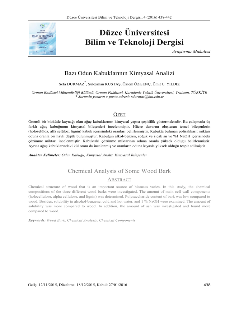 Düzce Üniversitesi Bilim ve Teknoloji Dergisi, 4 (2016) 438-442 Düzce Üniversitesi Bilim ve Teknoloji Dergisi Araştırma Makalesi Bazı Odun Kabuklarının Kimyasal Analizi * Sefa DURMAZ , Süleyman KUŞTAŞ, Özlem ÖZGENÇ, Ümit C. YILDIZ Orman Endüstri Mühendisliği Bölümü, Orman Fakültesi, Karadeniz Teknik Üniversitesi, Trabzon, TÜRKİYE * Sorumlu yazarın e-posta adresi: [email protected] ÖZET Önemli bir biokütle kaynağı olan ağaç kabuklarının kimyasal yapısı çeşitlilik göstermektedir. Bu çalışmada üç farklı ağaç kabuğunun kimyasal bileşenleri incelenmiştir. Hücre duvarını oluşturan temel bileşenlerin (holoselüloz, alfa selüloz, lignin) kabuk içerisindeki oranları belirlenmiştir. Kabukta bulunan polisakkarit miktarı oduna oranla bir hayli düşük bulunmuştur. Kabuğun alkol-benzen, soğuk ve sıcak su ve %1 NaOH içerisindeki çözünme miktarı incelenmiştir. Kabuktaki çözünme miktarının oduna oranla yüksek olduğu belirlenmiştir. Ayrıca ağaç kabuklarındaki kül oranı da incelenmiş ve oranların oduna kıyasla yüksek olduğu tespit edilmiştir. Anahtar Kelimeler: Odun Kabuğu, Kimyasal Analiz, Kimyasal Bileşenler Chemical Analysis of Some Wood Bark ABSTRACT Chemical structure of wood that is an important source of biomass varies. In this study, the chemical compositions of the three different wood barks were investigated. The amount of main cell wall components (holocellulose, alpha cellulose, and lignin) was determined. Polysaccharide content of bark was low compared to wood. Besides, solubility in alcohol-benzene, cold and hot water, and 1 % NaOH were examined. The amount of solubility was more compared to wood. In addition, the amount of ash was investigated and found more compared to wood. Keywords: Wood Bark, Chemical Analysis, Chemical Components Geliş: 12/11/2015, Düzeltme: 18/12/2015, Kabul: 27/01/2016 438 I. GİRİŞ abuk gövdeyi, dalları ve kökü çevreleyen dış katmandır ve ağaç türüne bağlı olarak ağacın toplam ağırlığının yaklaşık % 10-15’ini oluşturur [1]. Dikili haldeki ağacın önemli bir kısmını oluşturmasından dolayı potansiyel bir biokütle kaynağı olmaktadır [2]. Kesim sonrasında odundan soyma yoluyla uzaklaştırılan kabuk kesim alanında çürümeye terk edilirken, kereste fabrikalarında ve odunu işleyen diğer birçok endüstri kuruluşunda ise yakılarak enerji elde etmek maksadıyla kullanılmaktadır [3, 4]. Aynı zamanda kabuk; farklı kullanım alanları için kimyasal madde olarak potansiyel bir kaynaktır. K Kabuk heterojen yapısından dolayı farklılık gösteren bir kimyasal yapıya sahiptir [5]. Ağaç kabuklarının aynı türler arasındaki kimyasal bileşenleri dahi bölge, yaş, yetişme koşulları ve örnekleme yöntemleri gibi birçok faktöre bağlı olarak değişiklik göstermektedir [6]. Ortaya çıkan farklılıklar kabuğun kimyasal yapısın aydınlatılmasını çoğu zaman güçleştirmektedir. Kabukta bulunan selüloz ve hemiselülozlar odundaki yapıya benzerlik göstermektedir [5]. Kabuk ve diğer lignoselülozik materyaller arasındaki temel fark, aromatik bileşikler ve polisakkarit miktarındaki değişikliktir [6]. Ağaç kabuklarının gövde odununa göre daha fazla ekstraktif madde içerdiği bilinmektedir [7]. Aynı zamanda kabuktaki pektin ve fenolik bileşikler ile süberin miktarı da oduna oranla daha fazladır [1]. Kabuk yapısındaki zengin kimyasal bileşiklerden dolayı geçmişten beri farklı alanlarda kullanılmaktadır. Kabuğun kimyasal karakterizasyonu, kullanım potansiyelini değerlendirmek için önemlidir [2]. Ancak kabuğun standart yöntemlerle kimyasal analizi farklı sonuçların elde edilmesine neden olmaktadır. Uygulanan ekstraksiyon yöntemi polisakkarit ve lignin miktarını etkilemektedir [8]. Kabuktaki fenolik bileşikler %72’lik sülfirik asit içerisinde çözünmekte ve lignin sonuçlarının hatalı olmasına neden olmaktadır [9]. Kabuğun kimyasal bileşen çeşitliliği oduna kıyasla farklıdır. Bu bakımdan, son yıllarda odun kabuğuna olan ilgi giderek artmaktadır ve kabuğun kimyasal karakterizasyonu ile ilgili çok sayıda çalışma yapılmaktadır. Bu çalışmada, Doğu Karadeniz Göknarı (Abies nordmanniana), Kızılçam (Pinus brutia Ten.) ve Sahil Çamı (Pinus pinaster) ağaç kabuklarının kimyasal bileşenleri incelenmiştir. II. MALZEME ve YÖNTEM A. MALZEME Çalışmada Doğu Karadeniz Göknarı (Abies nordmanniana), Kızılçam (Pinus brutia Ten.) ve Sahil Çamı (Pinus pinaster) türlerine ait ağaç kabukları kullanılmıştır. Doğu karadeniz göknarı ve kızılçam Sinop, Sahil çamı Trabzon bölgesinden temin edilmiştir. Kabuklar ışık almayan ortamda oda sıcaklığında kurutulmuştur. Hava kurusu ağırlığa gelen kabuklar laboratuvar tipi Willey değirmeninde öğütülmüştür. Örnekler Tappi T 257 standardına göre kimyasal analiz için hazırlanmıştır. 439 B. YÖNTEM Holoselüloz miktarı [10], α-selüloz miktarı [11], lignin miktarı Tappi T 222 ilgili standartlarına göre belirlenmiştir. Çözünürlük özellikleri, alkol-benzen Tappi T 204, soğuk ve sıcak su Tappi T 207 ve % 1’lik NaOH Tappi T 212 standartlarına göre belirlenmiştir. Kabuktaki kül tayini Tappi T 221 standardına göre tespit edilmiştir. Tüm analizler üç tekrar olarak yapılmıştır. III. BULGULAR ve TARTIŞMA Üç farklı ağaç kabuğu türünün temel bileşenlerine ait kimyasal analiz sonuçları Tablo 1’de verilmiştir. En fazla holoselüloz ve alfa selüloz miktarı göknar ağaç kabuğunda bulunurken, bu oran en az kızılçam ağaç kabuğunda tespit edilmiştir. Göknar (% 44,60) ve sahil çamı (% 41,15) ağaç kabuklarındaki holoselüloz miktarları birbirlerine yakın bulunmuştur. Alfa selüloz miktarına bakıldığında üç tür arasında farklılıklar olduğu görülmektedir. Geçmiş çalışmalar incelendiğinde aynı t