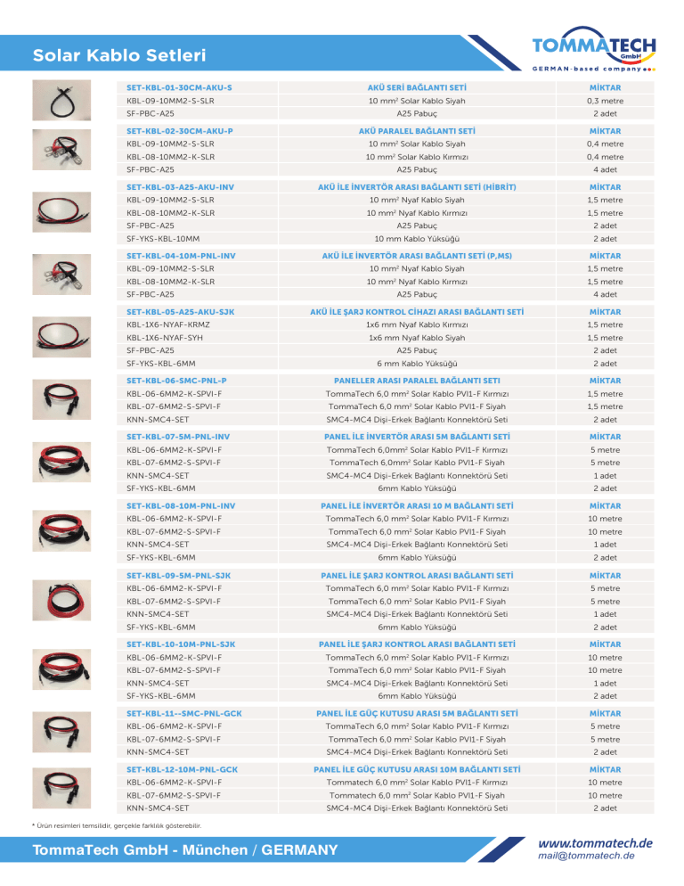 Solar Kablo Setleri SET-KBL-01-30CM-AKU-S AKÜ SERİ BAĞLANTI SETİ MİKTAR KBL-09-10MM2-S-SLR 10 mm2 Solar Kablo Siyah 0,3 metre A25 Pabuç 2 adet SF-PBC-A25 SET-KBL-02-30CM-AKU-P AKÜ PARALEL BAĞLANTI SETİ MİKTAR KBL-09-10MM2-S-SLR 10 mm2 Solar Kablo Siyah 0,4 metre KBL-08-10MM2-K-SLR 10 mm2 Solar Kablo Kırmızı 0,4 metre A25 Pabuç 4 adet SF-PBC-A25 SET-KBL-03-A25-AKU-INV AKÜ İLE İNVERTÖR ARASI BAĞLANTI SETİ (HİBRİT) MİKTAR KBL-09-10MM2-S-SLR 10 mm2 Nyaf Kablo Siyah 1,5 metre KBL-08-10MM2-K-SLR 10 mm2 Nyaf Kablo Kırmızı 1,5 metre A25 Pabuç 2 adet 10 mm Kablo Yüksüğü 2 adet SF-PBC-A25 SF-YKS-KBL-10MM SET-KBL-04-10M-PNL-INV AKÜ İLE İNVERTÖR ARASI BAĞLANTI SETİ (P,MS) MİKTAR KBL-09-10MM2-S-SLR 10 mm2 Nyaf Kablo Siyah 1,5 metre KBL-08-10MM2-K-SLR 10 mm2 Nyaf Kablo Kırmızı 1,5 metre A25 Pabuç 4 adet SF-PBC-A25 SET-KBL-05-A25-AKU-SJK AKÜ İLE ŞARJ KONTROL CİHAZI ARASI BAĞLANTI SETİ MİKTAR KBL-1X6-NYAF-KRMZ 1x6 mm Nyaf Kablo Kırmızı 1,5 metre KBL-1X6-NYAF-SYH 1x6 mm Nyaf Kablo Siyah 1,5 metre A25 Pabuç 2 adet 6 mm Kablo Yüksüğü 2 adet SF-PBC-A25 SF-YKS-KBL-6MM SET-KBL-06-SMC-PNL-P PANELLER ARASI PARALEL BAĞLANTI SETI MİKTAR KBL-06-6MM2-K-SPVI-F TommaTech 6,0 mm2 Solar Kablo PVI1-F Kırmızı 1,5 metre KBL-07-6MM2-S-SPVI-F TommaTech 6,0 mm2 Solar Kablo PVI1-F Siyah 1,5 metre KNN-SMC4-SET SMC4-MC4 Dişi-Erkek Bağlantı Konnektörü Seti 2 adet SET-KBL-07-5M-PNL-INV PANEL İLE İNVERTÖR ARASI 5M BAĞLANTI SETİ MİKTAR KBL-06-6MM2-K-SPVI-F TommaTech 6,0mm2 Solar Kablo PVI1-F Kırmızı 5 metre KBL-07-6MM2-S-SPVI-F TommaTech 6,0mm2 Solar Kablo PVI1-F Siyah 5 metre KNN-SMC4-SET SMC4-MC4 Dişi-Erkek Bağlantı Konnektörü Seti 1 adet SF-YKS-KBL-6MM 6mm Kablo Yüksüğü 2 adet SET-KBL-08-10M-PNL-INV PANEL İLE İNVERTÖR ARASI 10 M BAĞLANTI SETİ MİKTAR KBL-06-6MM2-K-SPVI-F TommaTech 6,0 mm2 Solar Kablo PVI1-F Kırmızı 10 metre KBL-07-6MM2-S-SPVI-F TommaTech 6,0 mm2 Solar Kablo PVI1-F Siyah 10 metre KNN-SMC4-SET SMC4-MC4 Dişi-Erkek Bağlantı Konnektörü Seti 1 adet SF-YKS-KBL-6MM 6mm Kablo Yüksüğü 2 adet SET-KBL-09-5M-PNL-SJK PANEL İLE ŞARJ KONTROL ARASI BAĞLANTI SETİ MİKTAR KBL-06-6MM2-K-SPVI-F TommaTech 6,0 mm2 Solar Kablo PVI1-F Kırmızı 5 metre KBL-07-6MM2-S-SPVI-F TommaTech 6,0 mm2 Solar Kablo PVI1-F Siyah 5 metre KNN-SMC4-SET SMC4-MC4 Dişi-Erkek Bağlantı Konnektörü Seti 1 adet SF-YKS-KBL-6MM 6mm Kablo Yüksüğü 2 adet SET-KBL-10-10M-PNL-SJK PANEL İLE ŞARJ KONTROL ARASI BAĞLANTI SETİ MİKTAR TommaTech 6,0 mm2 Solar Kablo PVI1-F Kırmızı 10 metre KBL-07-6MM2-S-SPVI-F TommaTech 6,0 mm2 Solar Kablo PVI1-F Siyah 10 metre KNN-SMC4-SET SMC4-MC4 Dişi-Erkek Bağlantı Konnektörü Seti 1 adet SF-YKS-KBL-6MM 6mm Kablo Yüksüğü 2 adet KBL-06-6MM2-K-SPVI-F SET-KBL-11--SMC-PNL-GCK PANEL İLE GÜÇ KUTUSU ARASI 5M BAĞLANTI SETİ MİKTAR KBL-06-6MM2-K-SPVI-F TommaTech 6,0 mm2 Solar Kablo PVI1-F Kırmızı 5 metre KBL-07-6MM2-S-SPVI-F TommaTech 6,0 mm2 Solar Kablo PVI1-F Siyah 5 metre KNN-SMC4-SET SMC4-MC4 Dişi-Erkek Bağlantı Konnektörü Seti 2 adet SET-KBL-12-10M-PNL-GCK PANEL İLE GÜÇ KUTUSU ARASI 10M BAĞLANTI SETİ MİKTAR KBL-06-6MM2-K-SPVI-F Tommatech 6,0 mm2 Solar Kablo PVI1-F Kırmızı 10 metre KBL-07-6MM2-S-SPVI-F Tommatech 6,0 mm2 Solar Kablo PVI1-F Siyah 10 metre KNN-SMC4-SET SMC4-MC4 Dişi-Erkek Bağlantı Konnektörü Seti 2 adet * Ürün resimleri temsilidir, gerçekle farklılık gösterebilir. TommaTech GmbH - München / GERMANY [email protected]
