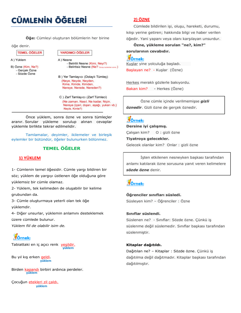 CÜMLENİN ÖĞELERİ 2) ÖZNE Cümlede bildirilen işi, oluşu, hareketi, durumu, kılışı yerine getiren; hakkında bilgi ve haber verilen Öğe: Cümleyi oluşturan bölümlerin her birine öğedir. Yani yapanı veya olanı karşılayan unsurdur. Özne, yükleme sorulan "ne?, kim?" öğe denir. sorularının cevabıdır. Kuşlar yine yolculuğa başladı. Başlayan ne? - Kuşlar (Özne) Herkes meraklı gözlerle bakıyordu. Bakan kim? - Herkes (Özne) Özne cümle içinde verilmemişse gizli öznedir. Gizli özne de gerçek öznedir. Önce yüklem, sonra özne ve sonra tümleçler aranır. Sorular yükleme sorulup alınan cevaplar yüklemle birlikte tekrar edilmelidir. Tamlamalar, deyimler, ikilemeler ve birleşik eylemler bir bütündür, öğeler bulunurken bölünmez. TEMEL ÖĞELER 1) YÜKLEM Dersine iyi çalışmış. Çalışan kim? O : gizli özne Tiyatroya gelecekler. Gelecek olanlar kim? Onlar : gizli özne İşten etkilenen nesneyken başkası tarafından anlamı katılarak özne sorusuna yanıt veren kelimelere 1- Cümlenin temel öğesidir. Cümle yargı bildiren bir sözde özne denir. söz; yüklem de yargıyı üstlenen öğe olduğuna göre yüklemsiz bir cümle olamaz. 2- Yüklem, tek kelimeden de oluşabilir bir kelime grubundan da. Öğrenciler sınıfları süsledi. 3- Cümle oluşturmaya yeterli olan tek öğe Süsleyen kim? – Öğrenciler : Özne yüklemdir. 4- Diğer unsurlar, yüklemin anlamını desteklemek Sınıflar süslendi. üzere cümlede bulunur. Süslenen ne? - Sınıflar: Sözde özne. Çünkü iş Yüklem fiil de olabilir isim de. süslenme değil süslemedir. Sınıflar başkası tarafından süslenmiştir. Tabiattaki en iç açıcı renk yeşildir. yüklem Kitaplar dağıtıldı. Bu yıl kış erken geldi. yüklem dağıtılma değil dağıtmadır. Kitaplar başkası tarafından Birden kapandı birbiri ardınca perdeler. yüklem Çocuğun etekleri zil çaldı. yüklem Dağıtılan ne? – Kitaplar : Sözde özne. Çünkü iş dağıtılmıştır. YARDIMCI ÖĞELER 1) NESNE (DÜZ TÜMLEÇ) a) Belirtili Nesne : İsmin –i hal ekini alır. Yükleme sorulan “neyi, kimi?” sorularının 3) ZARF TAMLAYICISI (ZARF TÜMLECİ) “Ne zaman, nasıl, ne kadar, nereye, niçin, neyle, kimle?” sorularıyla bulunur. cevabını verir. Seni bugün okul müdürü çağırdı. (Ne zaman çağırdı?) Zarf Tamlayıcısı Kedi sütü döktü. Kedi neyi döktü? : Sütü – Belirtili Nesne Ali’yi müdür çağırdı. Ben onu çok seviyordum. (Ne kadar seviyorum?) Zarf Tamlayıcısı Müdür kimi çağırdı? : Ali’yi - Belirtili Nesne Mert kitabın sayfalarını yırtmış. Mert neyi yırtmış? : kitabın sayfalarını – Belirtili Nesne a) Belirtisiz Nesne : İsmin yalın halinde olur. Yükleme, özneyi bulduktan sonra sorulan Gelmediğinden bu konuyu anlamadı. (Niçin anlamadı?) Zarf Tamlayıcısı Güle oynaya okula gitmişti oysa. (Nasıl gitmişti?) Zarf Tamlayıcısı “Ne?” sorusunun cevabını verir. İzmir’den uçakla geldik. (Neyle geldik?) Zarf Tamlayıcısı Annem pazardan elma aldı. Aldı yüklem. Alan kim? - Annem: özne Annem ne aldı? – Elma : Belirtisiz nesne Uyarı: ”İçeri, dışarı, aşağı, yukarı, ileri, geri”gibi yer yön sözcükleri yalın haldeyken zarf tümleci, ismin –e,-de, -den halindeyken dolaylı tümleç, ismin –i halindeyken nesne olur. 2) YER TAMLAYICISI (DOLAYLI TÜMLEÇ) İçeri gel. İçeriye gel. Zarf Tamlayıcısı Yer Tamlayıcısı -e, -de, -den ekini alan tümleçlerdir. Yükleme İçeriyi temizle. Belirtili Nesne sorulan “neye, neyde, neyden, kime, kimde, kimden, nereye, nerede, nereden?” sorularının cevabını verir. Cümleni Ögeleri İle İlgili Genel Özellikler Benim çiçeklerime kimse zarar veremez. Zarar veremez: Yüklem Zarar veremeyen kim? – Kimse : özne Kimse neye zarar veremez? – Benim çiçeklerime : yer tamlayıcı Tebeşir kireçten yapılır. Yer Tamlayıcısı a- Cümlenin kuruluşuna katılmayan, yani öge olmayan ve dolaylı olarak cümlenin anlamına yardımcı olan ünlem grupları, unsurlardır. Bağlaçlar, hitaplar, ara ünlemler, sözler cümle kuruluşunun dışında kalan cümle dışı unsurlardır. Şair, sen üzüldükçe ve öldükçe yaşarsın. Bahçeye indim; fakat çiçeklerin kokusunu alamadım. Başımın ağrısı yazları –sıcaklardan olmalı- artar. Şu kopan fırtına Türk ordusudur, ya Rabbi! Nereden geliyorsun? b- Soru cümleleri, değişik öğeleri buldurmaya Yer Tamlayıcısı Bu sabah yağmur var İstanbul’da Yer Tamlayıcısı yönelik olabilir. Sorunun cevabı hangi öğe ise soru cümlesi onu buldurmaya yöneliktir. -Sana kim izin verdi? –Babam = özneye yönelik -Hangisini beğendin? –Bunu = nesneye yönelik -Ne zaman geleceksin? –Yarın = zarf tümlecine yönelik