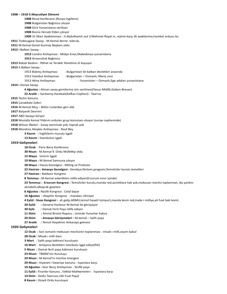 lOMoARcPSD|61152315 1908 – 1918 II.Meşrutiyet Dönemi 1908 Reval Konferansı (Rusya-ingiltere) 1908 Bulgaristan Bağımsız oluyor 1908 Girit Yunanistana veriliyor 1908 Bosna Hersek Elden çıkıyor 1909 31 Mart Ayaklanması : II.Abdulhamit out V.Mehmet Reşat in, rejime karşı ilk ayaklanma,harekat ordusu bs. 1911 Trablusgarp Savaşı : M.Kemal derne -tobruk, 1911 M.Kemal Genel Kurmay Başkanı oldu 1912 I.Balkan Savaşı : 1913 Londra Antlaşması : Midye-Enez,Makedonya yunanistana 1913 Arnavutluk Bağımsız 1913 Babali Baskını : İttihat ve Terakki Yönetime el koyuyor 1913 II.Balkan Savaşı : 1913 Bükreş Antlaşması : Bulgaristan ile balkan devletleri arasında 1913 İstanbul Antlaşması : Bulgaristan – Osmanlı, Meriç sınır 1913 Atina Antlaşması : Yunanistan – Osmanlı,Ege adaları yunanistana 1914 I.Dünya Savaşı 4 Ağustos : Alman savaş gemilerine izin verilmesi(Yavuz-Midilli,Goben-Bresav) 22 Aralık : Sarıkamış Harekatı(Kafkas Cephesi) : Taarruz 1915 Techir Kanunu 1915 Çanakkale Zaferi 1916 M.Kemal Muş – Bitlisi ruslardan geri aldı 1917 Bolşevik Devrimi 1917 ABD Savaşa Giriyor 1918 Mustafa Kemal Yıldırım orduları grup komutanı oluyor (suriye cephesinde) 1918 Wilson İlkeleri : Savaş tazminatı yok, toprak yok 1918 Mondros Ateşkes Antlaşması : Rauf Bey 3 Kasım : İngilizlerin musulu işgali 13 Kasım : İstanbulun işgali 1919 Gelişmeleri 18 Ocak : Paris Barış Konferansı 30 Nisan : M.Kemal 9. Ordu Müfettişi oldu 15 Mayıs : İzmirin İşgali 19 Mayıs : M.Kemal Samsuna çıkıyor 28 Mayıs : Havza Genelgesi : Miting ve Protesto 22 Haziran : Amasya Genelgesi : Gerekçe,Yöntem,program,Temsilciler kurulu temelleri 27 Haziran : Balıkesir Kongresi 8 Temmuz : M.Kemal askerlikten istifa ediyor(Erzurum sınırı içinde) 23 Temmuz : Erzurum Kongresi : Temsilciler kurulu,manda red,azınlıklara hak yok,mebusan meclisi toplanmalı, dış yardım alınabilir,albayrak gazetesi 6 Ağustos : Nazilli Kongresi : Celal bayar 16 Ağustos : Alaşehir Kongresi : mandacı zihniyet 4 Eylül : Sivas Kongresi : ali galip,ARMH,temsil heyeti tümyurt,manda kesin red,irade-i milliye,ali fuat batı komt. 20 Eylül : General Harbour M.Kemal ile görüşüyor 30 Eylü : Damat Ferit Paşa istifa ediyor 11 Ekim : Amiral Bristol Raporu : izmirde Yunanlar haksız 20 Ekim : Amasya Görüşmeleri : M.kemal – Salih paşa 27 Aralık : Temsil Heyetinin Ankaraya gelmesi 1920 Gelişmeleri 12 Ocak : Son osmanlı mebusan meclisinin toplanması : misak-ı milli,seçim kabul 28 Ocak : Misak-ı milli ilanı: 3 Mart : Salih paşa kabinesi kuruluyor 16 Mart : Anlaşma devletleri istanbulu işgal ediyo(fiili) 5 Nisan : Damat ferit paşa kabinesi kuruluyor 23 Nisan : TBMM’nin Kuruluşu 24 Nisan : M.Kemal’in meclise önergesi 29 Nisan : Hıyanet-i Vataniye kanunu : İsyanlara karşı 10 Ağustos : Sevr Barış Antlaşması : Tevfik paşa 11 Eylül : Firariler Kanunu , İstiklal Mahkemeleri : İsyanlara karşı 14 Ekim : Gediz Taarruzu (Ali Fuat Paşa) 8 Kasım : Düzeli Ordu kuruluyor lOMoARcPSD|61152315 9 Kasım : Batı cephesi ikiye ayrılıyor : Batı(İsmet bey),Güney (Refet bey) 3 Aralık : Gümrü Antlaşması (Kars-ığdır-Sarıkamış Türkiyede) 5 Aralık : Bilecik Görüşmeleri : M.kemal – Salih Paşa 1921 Gelişmeleri 6-10 Ocak : I.İnönü Muharebesi : İsmet bey general 20 Ocak : Teşkilat-ı Esasiye kanunu(21 Anayasası): 23 Ocak : Londra Konferansı : Bekir Sami Bey 23 Şubat : Batum Antlaşması : Artvin-Ardahan-Batum Türkiyeye verildi 1 Mart : Türk Afgan dostluk antlaşması : kültürel ve askeri 12 Mart : İstiklal Marşının Kabulu : Milli eğitim bakanı Hamdullas Suphi Tanrıöver okuyor,Besete Zeki üngör, Kastamonuda açıksöz gazetesinde yayımlandı 16 Mart : Moskova Antlaşması :Batum Gürcistana bırakıldı(ilk taviz) 23 Mart : II.İnönü Muharebesi :İngiltere maltada 40 türkü serbest , fransa zognuldak boşl.,”siz orada yalnız düşmanı değil....” 8 Nisan : Aslıhanlar – Dumlupınar taarruzu : henüz taarruz gücüne ulaşılamadı 5 Temmuz : İtalyanlar Anadoludan geri çekilmeye başladı 10 Temmuz : Eskişehir – Kütahya Muharebeleri 5 Ağustos : M.Kemal Başkomutan (3 ay) 7 Ağustos : Tekalifi Milliye Emirleri(Meclisin onayı yok, M.kemalin özel yetkisi ile) 23 Ağustos : Sakarya Meydan Muharebesi: “hattı müdafa yoktur...”,ukrayna dostluk,ingiltere esir ant. 19 Eylül : M.Kemal’e gazi ve mareşal rütbesi 13 Ekim : Kars Antlaşması : (Ermenistan,Gürcistan,Azerbaycan,Nahcivana muhafiyet,boğazlar açık) 20 Ekim : Ankara Antlaşması : Hatay ve iskenderun dışarda,caber kalesi türkiyede 1922 Gelişmeleri 26 Ağustos :Büyük Taarruz 11 Ekim : Mudanya Ateşkes Antlaşması : istanbul-boğazlar-doğu trakya savaşsız alındı : ismet paşa 1 Kasım : Saltanatın Kaldırılması : Osmanlı Devleti Resmen sona erdi,I.TBMM nin tek inkilabı 1923 Gelişmeleri 17 Şubat : İzmir İktisat Kongresi 24 Temmuz : Lozan Konferansı : İsmet paşa 11 Ağustos : II.TBMM nin Açılması 9 Eylül :Cumhuriyet Halk Fırkasını kurulması 13 Ekim : Ankaranın Başkent yapılması 29 Ekim : Cumhuriyetin ilanı : Kabine sistemi 30 Ekim : İsmet İnönü Başbakan 1 Kasım : Fethi Okyar Tbmm Başkanı 1924 Gelişmeleri 3 Mart : Halifeliğin Kaldırılması - Şeriye Evkaf vekaletinin kaldırılması :diyanet,vakıflar açıldı yerine - Erkan-ı Harbiye vekaletinin kaldırılması : Genel kurmay başkanlığu kuruldu - Osmanlı hanedanın yurt dışına çıkarılması - Tevhidi Tedrisat kanunu 20 Nisan : 24 anayasası :din islam,başkent ankara, dil türkçe,seçme yaşı 18,seçilme yaşı 30,cumhurbaşkanı 4 yıllığına 19 Mayıs : Haliç(İstanbul) Konferansı : Musul sorunu için ikili görüşme , başarısız 7 Ağustos : Nasturi İsyanı(ingiltere musul için destekliyor) 26 Ağustos : İş Bankası Açıldı 17 Kasım : Terakki Perver Cumhiriyet Fırkası Kuruldu : yerinden yönetim,tek derece,liberalizm,başka