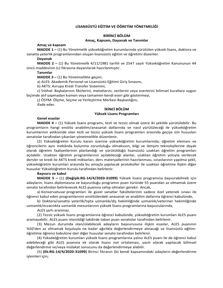 LİSANSÜSTÜ EĞİTİM VE ÖĞRETİM YÖNETMELİĞİ BİRİNCİ BÖLÜM Amaç, Kapsam, Dayanak ve Tanımlar Amaç ve kapsam MADDE 1 – (1) Bu Yönetmelik yükseköğretim kurumlarında yürütülen yüksek lisans, doktora ve sanatta yeterlik programlarından oluşan lisansüstü eğitim ve öğretimi düzenler. Dayanak MADDE 2 – (1) Bu Yönetmelik 4/11/1981 tarihli ve 2547 sayılı Yükseköğretim Kanununun 44 üncü maddesinin (c) fıkrasına dayanılarak hazırlanmıştır. Tanımlar MADDE 3 – (1) Bu Yönetmelikte geçen; a) ALES: Akademik Personel ve Lisansüstü Eğitimi Giriş Sınavını, b) AKTS: Avrupa Kredi Transfer Sistemini, c) İntihal: Başkalarının fikirlerini, metotlarını, verilerini veya eserlerini bilimsel kurallara uygun biçimde atıf yapmadan kısmen veya tamamen kendi eseri gibi göstermeyi, ç) ÖSYM: Ölçme, Seçme ve Yerleştirme Merkezi Başkanlığını, ifade eder. İKİNCİ BÖLÜM Yüksek Lisans Programları Genel esaslar MADDE 4 – (1) Yüksek lisans programı, tezli ve tezsiz olmak üzere iki şekilde yürütülebilir. Bu programların hangi enstitü anabilim/anasanat dallarında ve nasıl yürütüleceği ile yükseköğretim kurumlarının yetkisinde olan tezli ve tezsiz yüksek lisans programları arasında geçişe izin hususları senatolar tarafından çıkarılan yönetmelikle düzenlenir. (2) Yükseköğretim Kurulu kararı üzerine yükseköğretim kurumlarında; öğretim elemanı ve öğrencilerin aynı mekânda bulunma zorunluluğu olmaksızın, bilgi ve iletişim teknolojilerine dayalı olarak öğretim faaliyetlerinin planlandığı ve yürütüldüğü lisansüstü uzaktan öğretim programları açılabilir. Uzaktan öğretim programlarının açılabileceği alanlar, uzaktan öğretim yoluyla verilecek dersler ve kredi ile AKTS kredi miktarları, ders materyallerinin hazırlanması, sınavlarının yapılma şekli, yükseköğretim kurumları arasında bu amaçla yapılacak protokoller ile uzaktan öğretime ilişkin diğer hususlar Yükseköğretim Kurulu tarafından belirlenir. Başvuru ve kabul MADDE 5 – (1) (Değişik:RG-14/4/2020-31099) Yüksek lisans programına başvurabilmek için adayların, lisans diplomasına ve başvurduğu programın puan türünde 55 puandan az olmamak üzere senato tarafından belirlenecek ALES puanına sahip olmaları gerekir. Ancak, a) Konservatuvar programları ile güzel sanatlar fakültelerinin sadece özel yetenek sınavı ile öğrenci kabul eden programlarının enstitülerdeki anasanat ve anabilim dallarına öğrenci kabulünde, b) Doktora/sanatta yeterlik/tıpta uzmanlık/diş hekimliğinde uzmanlık/veteriner hekimliğinde uzmanlık/eczacılıkta uzmanlık mezunlarının yüksek lisans programlarına başvurularında, ALES şartı aranmaz. (2) Tezsiz yüksek lisans programlarına öğrenci kabulünde, yükseköğretim kurumları ALES puanı aramayabilir, ALES puanı istenildiği takdirde taban puan senatolar tarafından belirlenir. (3) Mezun durumda olan/olabilecek adayların başvurusuna ilişkin esaslar, ALES puanının %50'den az olmamak koşuluyla ne kadar ağırlıkla değerlendirmeye alınacağı ve lisansüstü eğitimöğretime öğrenci kabulüne dair diğer hususlar senato tarafından belirlenir. (4) Yükseköğretim kurumları yüksek lisans programlarına yalnız ALES puanı ile de öğrenci kabul edebileceği gibi ALES puanına ek olarak lisans not ortalaması, yazılı olarak yapılacak bilimsel değerlendirme ve/veya mülakat sonucunu da değerlendirmeye alabilir. (5) (Ek:RG-14/4/2020-31099) Birinci fıkranın (b) bendi kapsamındaki adayların değerlendirme işlemleri için; a) Üniversite senatoları tarafından mezun olduğu lisansüstü programa girişteki puan türü veya uzmanlık alanı dikkate alınmaksızın, 55’ten düşük 75’ten fazla olmamak üzere bir puan belirlenir ve ilgili programın şartlarında ilan edilir. b) Bu adaylar daha önceden aldığı puan türü veya doktora/sanatta yeterlik/uzmanlık alanından, farklı bir alanda başvuru yapabilir. c) İlan edilen puan, puan türüne bakılmaksızın ALES puanı olarak hesaplamalara dahil edilir. (6) (Ek:RG-18/5/2021-31485) Konservatuvar programları ile güzel sanatlar fakültelerinin sadece özel yetenek sınavı ile öğrenci kabul eden programlarının enstitülerdeki anasanat ve anabilim dallarındaki öğretim dili Türkçe olan programlarına başvurularda Devlet hastanesi veya Devlet üniversitesi hastanesinden alınmış sağlık raporu ile belgelenmesi şartıyla, a) Düzeltilmemiş engeli en az %70 veya düzeltilmiş engeli en az %40 ve üzeri olan işitme engelli adaylarda, b) Engel düzeyi %50 ve üzeri olmak üzere zihin yetersizliği bulunan engelli adaylarda, c) Engel düzeyi %40 ve üzeri ''yaygın gelişimsel bozukluk'' (Otizm spektrum bozukluğu/çocukluk otizmi/atipik otizm, Rett Sendromu, Asperger Sendromu) tanısı bulunan engelli adaylarda, başvuru yapabilmeleri için yabancı dil puanı aranmaz. Bu adaylar yabancı dil puanı olarak üniversite tarafından aranan yabancı dil taban puanı şartını sağlamış sayılır. Tezli yüksek lisans programı MADDE 6 – (1) Tezli yüksek lisans programı öğrencinin bilimsel araştırma yöntemlerini kullanarak bilgilere erişme, bilgiyi derleme, yorumlama ve değerlendirme yeteneğini kazanmasını sağlar. (2) Tezli yüksek lisans programı toplam yirmi bir krediden az olmamak koşuluyla en az yedi ders, bir seminer dersi ve tez çalışmasından oluşur. Seminer dersi ve tez çalışması kredisiz olup başarılı veya başarısız olarak değerlendirilir. Tezli yüksek lisans programı bir eğitim-öğretim dönemi 60 AKTS kredisinden az olmamak koşuluyla seminer dersi dahil en az sekiz ders ve tez çalışması olmak üzere toplam en az 120 AKTS kredisinden oluşur. Öğrenci, en geç danışman atanmasını izleyen dönemden itibaren her yarıyıl tez dönemi için kayıt yaptırmak zorundadır. (3) Öğrencinin alacağ