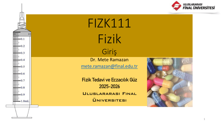 FIZK111 Fizik Giriş Dr. Mete Ramazan [email protected] Fizik Tedavi ve Eczacılık Güz 2025-2026 Uluslararası Final Üniversitesi 1 FIZK111, Fizik – Dersin Tanımı • Bu ders, fiziğin gerekli temel kavramlarını olabildiğince açık bir şekilde sunacak ve sağlık bilimleri öğrencileri için kesinlikle gerekli olan, fiziğin biyotıp ile en ilgili kısımlarını açıklamak için tasarlanmıştır. • Bu ders Eczacılık öğrencileri için büyük bir motivasyon olan, ilaç dozaj bilgilerinin de yer aldığı birim ve ölçüler ile başlayacak. • Bu dersin içeriği, Basınç, Radyasyon ve Sağlık, İyonize Radyasyonun Biyolojik etkileri, Tıbbi Görüntüleme ve Manyetik ile MRI gibi kavramların kapsanmasına izin vermek için fiziğin çeşitli alanlarının kavramları açısından düzenlenmiştir. 2 FIZK111, Fizik – Dersin Genel Amaçları • Bu derste öğrenciler, doğanın, fizik tarafından açıklanan yasalarını öğrenir. • Ders, fiziğin, biyomedikal bilimi ile bağlantılı konuları üzerinde durur. Resim: Arşimed ve suyun kaldırma gücü 3 FIZK111, Fizik – Öğrenim çıktıları Dersi başarıyla tamamlayan öğrenciler, 1. Fizikle ilgili temel kavramları ve terimleri bilir. 2. Fiziksel miktarlar ve bunlara karşılık gelen standart birimleri öğrenir. 3. Uygun denklemlerle soru çözmeyi öğrenir. 4. Newton'un yasalarını ve bu yasaları problem çözmede kullanmayı öğrenir. 5. İnsan vücudu ve basınç konusunda bilgi sahibi olur. 6. Optik konusunda gerekli bilgileri edinir. 7. Farklı radyasyon türlerini ve bunların insan vücuduna etkilerini bilir. 4 FIZK111, Fizik – Kitap Introduction to Biological Physics for the Health and Life Sciences, Kirsten Franklin et. al., WILEY, 2010 5 FIZK111, Fizik – Öğrenim-öğretim yöntemi ve başarı koşulları • Ders, haftada iki saatlik teorik seanslar olarak yürütülecektir. • Dersin büyük bir bölümünde açıklayıcı öğretim yöntemi kullanılacaktır. • Ancak tartışmalar ve sunumlar sırasında her öğrencinin aktif katılımı gerekmektedir. • Süreçler ve kavramlar, sınıf tartışmaları ve ölçme ve değerlendirmede gerekli ödevler için temel oluşturacaktır. Bu derste öğrenciler • Ara sınav(lar) ve final sınavına katılıp en azından geçmek için gerekli minimum notu almalıdır. • Sınıfa hazırlıklı gelip sınıf tartışmalarında etkili olarak yer almalıdır. • Verilen ödevleri zamanında tamamlamalıdır • Tüm derslere katılmalıdır. Herhangi bir nedenle devamın %70'in altına düşmesi NG notu almaya neden olur. 6 FIZK111, Fizik – DEĞERLENDİRME • Ara sınav - %30 • Kısa sınav (quiz) – 2x%10 = %20 • Üç kısa sınavdan en iyi ikisi dikkate alınacaktır • Final sınavı - %50 7 Konular ➢ Ölçü ve birimler ➢ Vektörler, 1-ve 2-boyutta hareket ➢ Kuvvet ve Newton'un hareket yasaları ➢ Dairesel hareket ➢ Statik ve Denge ➢ Enerji ➢ Basınç, suyun kaldırma gücü ➢ Ara sınav ➢ İyonize Radyasyonun üretimi ve etkileşimi ➢ İyonize Radyasyonun Biyolojik etkileri ➢ Tıbbi Görüntüleme (X-Ray Imaging, CT Scan, PET Scan) Değerlendirme ➢ Tıbbi Görüntüleme (X-Ray Imaging, CT Scan, PET scan) • Ara Sınav %30 • 2xKısa sınav 2x10, %20 • Final sınavı %50 ➢ Manyetizma ➢ Manyetizma ve MRI ➢ Tekrar 8 Bu derste • Fiziğe giriş • Ölçüler • Fiziksel nicelikler • Birimler • SI birim sistemi • Birimlerin dönüştürülmesi 9 Fizik Nedir? • İnsanoğlu her zaman etrafındaki dünyayı merak etmiştir. • Örneğin: Gökyüzünün rengi Hareketli bir aracın sesindeki değişim Rüzgarda bir ağacın sallanan yaprakları Güneşin doğuşu ve batışı Bir kuşun veya uçağın uçuşu 10 Fizik Nedir? • Fizik kelimesi, doğal dünyanın bilgisi anlamına gelen Yunanca kelimeden (φuσισ (phusis)) gelir. • Kökeni, Latince physica kelimesine dayanır. • Fizik, evrenin temel doğasını ve nasıl çalıştığını açıklamaya çalışır. 11 Fizik Nedir? • Fizik, madde ve enerji, uzay ve zaman bilimidir. • Fizikteki temel ilkeler ve yasalar, çevremizdeki dünyanın olaylarını tanımlar. • Bu yasalar ve ilkeler hem kara delikler gibi egzotik olaylar hem de günlük yaşam için geçerlidir. 12 • Dünyamızla ilgili sayısız soru, temel bir fizik bilgisi ile cevaplanabilir: • Gökyüzü neden mavidir? • Uzayda astronotlar nasıl yürürler? • CD çalar nasıl çalışır? • Bir helikopter neden rotorlara sahip olmalıdır? 13 Tıbbi Fizik • Fizik kavramlarının tıp, sağlık ve tıp bilimlerine uygulanmasıdır. • Vücudun fiziksel yönlerini anlamak için sağlık eğitimlerinde (tıp, eczacılık vb.) fizik kavramları öğretiliyor. Söz konusu fiziksel yönlere örnek: • Vücuda uygulanan ve vücut içerisindeki kuvvetler • İş • Enerji • Vücut ve güç • Isı • Kan akışı • Solunum • Elektrik • Kan dolaşımı • İşitme 14 Tıbbi Fizik • Tıp fiziği konuları • Ultrason, • Manyetik • Rezonans, • Bilgisayarlı Tomografi, • Nükleer Tıp, • X ışınları, • Radyasyon Terapisi. • Fizikçiler, mühendisler ve radyologlar bu alanda araştırmalara öncülük ediyor. Bilgisayarlı Tomografi (Computed Tomography – CT Scan) 15 Medical Physics Tıbbi Fizik Optics, Opthalmology Optik, Oftalmoloji Biosensor Biyosensör Medical Technology Tıbbi teknoloji Molecular Biology, Biophysics Moleküler Biyoloji, Biyofizik Acoustics, Audiometry Akustik, Odyometri Molecular Medicine Moleküler tıp Radiation Therapy Radyasyon Terapisi X-Ray Diagnostic, Nuclear Medicine X-ışınlarıyla teşhis, Nükleer Tıp Computer Guided Surgery Bilgisayarlı Ameliyat Biostatistics, Medical Informatics Biyostatik, Tıbbi Enformatik Biomechanics Biyomekanik Biomedical Engineering Biyomedikal Mühendisliği 16 Ölçme • Fizik, madde ve enerjinin doğası ve özellikleri ile ilgilenir. • Ortak dil matematik