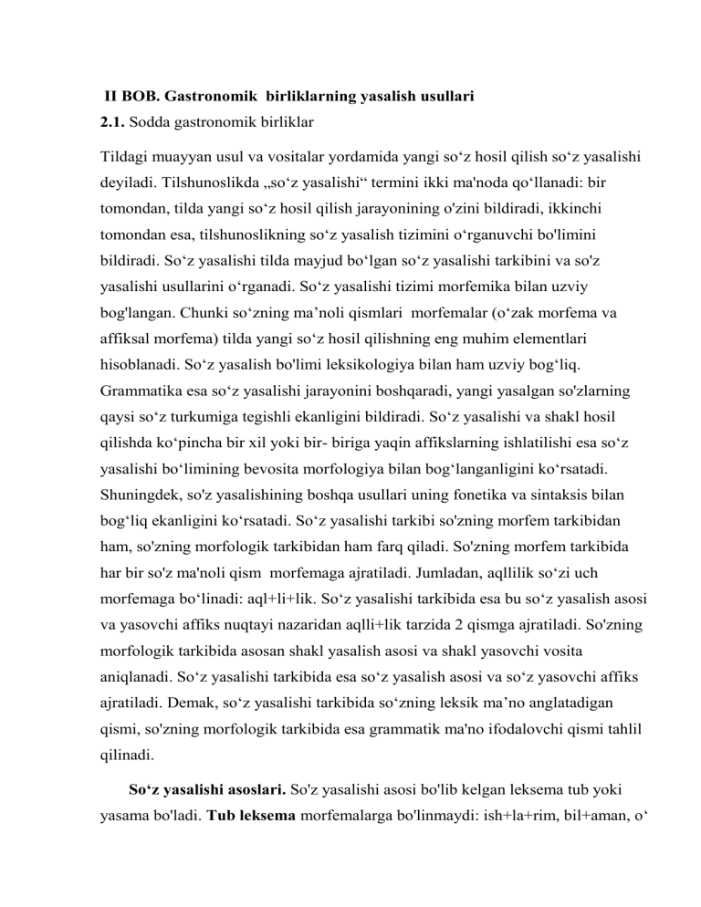 II BOB. Gastronomik birliklarning yasalish usullari 2.1. Sodda gastronomik birliklar Tildagi muayyan usul va vositalar yordamida yangi so‘z hosil qilish so‘z yasalishi deyiladi. Tilshunoslikda „so‘z yasalishi“ termini ikki ma'noda qo‘llanadi: bir tomondan, tilda yangi so‘z hosil qilish jarayonining o'zini bildiradi, ikkinchi tomondan esa, tilshunoslikning so‘z yasalish tizimini o‘rganuvchi bo'limini bildiradi. So‘z yasalishi tilda mayjud bo‘lgan so‘z yasalishi tarkibini va so'z yasalishi usullarini o‘rganadi. So‘z yasalishi tizimi morfemika bilan uzviy bog'langan. Chunki so‘zning ma’noli qismlari morfemalar (o‘zak morfema va affiksal morfema) tilda yangi so‘z hosil qilishning eng muhim elementlari hisoblanadi. So‘z yasalish bo'limi leksikologiya bilan ham uzviy bog‘liq. Grammatika esa so‘z yasalishi jarayonini boshqaradi, yangi yasalgan so'zlarning qaysi so‘z turkumiga tegishli ekanligini bildiradi. So‘z yasalishi va shakl hosil qilishda ko‘pincha bir xil yoki bir- biriga yaqin affikslarning ishlatilishi esa so‘z yasalishi bo‘limining bevosita morfologiya bilan bog‘langanligini ko‘rsatadi. Shuningdek, so'z yasalishining boshqa usullari uning fonetika va sintaksis bilan bog‘liq ekanligini ko‘rsatadi. So‘z yasalishi tarkibi so'zning morfem tarkibidan ham, so'zning morfologik tarkibidan ham farq qiladi. So'zning morfem tarkibida har bir so'z ma'noli qism morfemaga ajratiladi. Jumladan, aqllilik so‘zi uch morfemaga bo‘linadi: aql+li+lik. So‘z yasalishi tarkibida esa bu so‘z yasalish asosi va yasovchi affiks nuqtayi nazaridan aqlli+lik tarzida 2 qismga ajratiladi. So'zning morfologik tarkibida asosan shakl yasalish asosi va shakl yasovchi vosita aniqlanadi. So‘z yasalishi tarkibida esa so‘z yasalish asosi va so‘z yasovchi affiks ajratiladi. Demak, so‘z yasalishi tarkibida so‘zning leksik ma’no anglatadigan qismi, so'zning morfologik tarkibida esa grammatik ma'no ifodalovchi qismi tahlil qilinadi. So‘z yasalishi asoslari. So'z yasalishi asosi bo'lib kelgan leksema tub yoki yasama bo'ladi. Tub leksema morfemalarga bo'linmaydi: ish+la+rim, bil+aman, o‘ qi +dim, sez + gansan kabi so'zlarning ish, bil, o ‘qi, sez qismi tub leksema bo'lib, o'zakka teng keladi. Yasama leksema esa tub leksemaga yasovchi affiks qo'shilishidan yoki birdan ortiq leksemaning qo'shilishidan hosil bo'ladi: ish+chi, bil+im, sez+gir, zamon+dosh, chim+qirqar, sho'r+ quduq kabi. So‘z yasalishi, qanday usul bilan bo‘lsa-da, yangi so‘z hosil qilish demakdir: ish+chi - ishchi, hozir+javob hozirjavob. Hozirgi o'zbek tilida yasama so'zlar juda ko‘p. Lekin ular yasalishiga ko'ra 2 xif boMadi: 1. Hozirgi (sinxron) so‘z yasalishi. 2. Tarixiy (diaxron) so‘z yasalishi. Sinxroma (bir vaqtlilik) va diaxroma (har vaqtlilik) o‘zaro Oziq-ovqat nomlari har bir tilda alohida leksik qatlamni tashkil qiladi. Bu nomlar xalqning turmush tarzi, urf-odatlari, tarixiy taraqqiyoti va madaniy hayoti bilan uzviy bog‘liq. Ular til leksikasining muhim qismini tashkil qilgan holda, so‘z yasash jarayonlarining faol namunasi sifatida o‘rganiladi. Oziq-ovqat nomlari har bir xalqning madaniyati, yashash tarzi, urf-odatlari va tili bilan chambarchas bog‘liq. Oziq-ovqat nomlari tilda turli xil yasalish yo‘llari orqali hosil qilinadi. Bu jarayonda mavjud so‘zlar semantik kengayish, affikslar qo‘shilishi, so‘z birikmalari yoki boshqa tillardan o‘zlashish yo‘li bilan yangi ma’nodagi birliklarga aylanadi. Bu esa tilning boyishiga, yangi tushunchalarni ifodalash imkoniyatining kengayishiga xizmat qiladi. O‘rganilayotgan hudud o‘zbek shevalarida tub so‘z shaklidagi taom nomlari qadimgi davrlardan boshlab hozirgacha qo‘llanilib kelmoqda. Ularda yasama so‘zlik holati kuzatilmaydi: masalan, nan, pәtir, palav,shәvlә, tѳsh, sayыsh, talsan, gѳdjә, zagara, chѳrәk, sѳk kabi. Hozirgi davr nuqtai nazardan ba’zi tub so‘z hisoblangan taom nomlari tarixan yoki diaxronik planda yasama nom bo‘lgan bo‘lishi mumkin: masalan, bavursas bәrәk, sыmыz, chubat, saymas, sүmәlәk, mәstәvә, manti, somsa, gѳmmә kabi.Bu taom nomlarining ko‘pchiligi tarixan diaxronik planda yasama ot shaklida yuzaga kelgan bo‘lsa ham, ularning yasamaligi hozirgi davr nuqtai nazardan sezilmas holga kelib qolgan. Biz bilamizki, soda so‘zlar ham ikki turga bo‘linadi 1) Sodda tub 2) Sodda yasama Sodda tub so‘zlar-tarkibida yasovchi qo‘shimchasi bo‘lmagan so‘zlardir. Sodda tub so‘zlar — tilda hech qanday so‘z yasovchi qo‘shimcha olmagan, bir ildizdan iborat va mustaqil ma’no ifodalaydigan so‘zlardir. Masalan: non, sut, tuz, go‘sht, yog‘, asal, un, suv kabi so‘zlar.Ular o‘zbek tilining eng qadimiy qatlamiga kiradi. Bunday so‘zlar odatda hayot uchun zarur narsalarni bildiradi: tabiat, inson tana a’zolari, ranglar, hayvonlar, va ayniqsa — ovqat nomlari.Demak, “sodda tub oziq-ovqat nomlari” deganda eng qadimiy, yasalmagan, bir so‘zli taom yoki mahsulot nomlari tushuniladi. Sodda oziq-ovqat nomlari odatda bir so‘zdan iborat bo‘lib, ko‘p hollarda tabiiy mahsulotlar yoki kundalik iste’mol qilinadigan taomlarni bildiradi. Masalan: non, sut, go‘sht, asal, tuz, yog‘ kabi so‘zlar o‘zbek tilida eng qadimiy va asosiy oziqovqat nomlaridan hisoblanadi.Turk tilida esa ularning muqobillari: ekmek, süt, et, bal, tuz, yağ tarzida ishlatiladi. Quyidagi jadvalda ayrim misollar keltirilgan: O‘zbekcha Turkcha Ma’nosi (tarjimasi) Non Ekmek Xamir mahsuloti, asosiy taom Sut Süt Sigir yoki boshqa hayvon suti Yog‘ Yağ Yog‘ (o‘simlik yoki hayvon yog‘i) Go‘sht Et Hayvon go‘shti Asal Bal Ari mahsuloti Tuz Tuz Ta’m beruvchi modda Baliq Balık Suv hayvoni Guruch Pirinç Dondan tayyorlanadigan mahsulot Meva Meyve Daraxt hosili Nonushta Kahvaltı Ertalabki ovqatlanish Ko‘rinib turibdiki, so‘zlarning aksariyati fonetik jihatdan juda yaqin. Ba’zilari esa, ma’no jihatdan bir xil bo‘lsa-da, shakl jihat