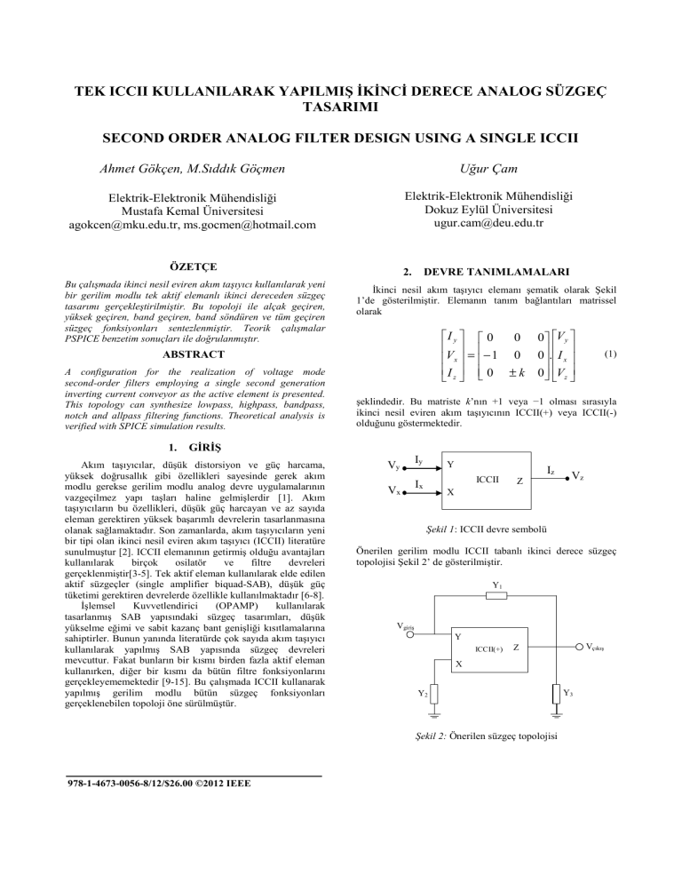 TEK ICCII KULLANILARAK YAPILMIŞ İKİNCİ DERECE ANALOG SÜZGEÇ TASARIMI SECOND ORDER ANALOG FILTER DESIGN USING A SINGLE ICCII Ahmet Gökçen, M.Sıddık Göçmen Uğur Çam Elektrik-Elektronik Mühendisliği Mustafa Kemal Üniversitesi [email protected], [email protected] Elektrik-Elektronik Mühendisliği Dokuz Eylül Üniversitesi [email protected] ÖZETÇE Bu çalışmada ikinci nesil eviren akım taşıyıcı kullanılarak yeni bir gerilim modlu tek aktif elemanlı ikinci dereceden süzgeç tasarımı gerçekleştirilmiştir. Bu topoloji ile alçak geçiren, yüksek geçiren, band geçiren, band söndüren ve tüm geçiren süzgeç fonksiyonları sentezlenmiştir. Teorik çalışmalar PSPICE benzetim sonuçları ile doğrulanmıştır. 2. DEVRE TANIMLAMALARI İkinci nesil akım taşıyıcı elemanı şematik olarak Şekil 1’de gösterilmiştir. Elemanın tanım bağlantıları matrissel olarak ⎡I y ⎤ ⎡ 0 0 ⎢ ⎥ ⎢ ⎢Vx ⎥ = ⎢− 1 0 ⎢ I z ⎥ ⎢⎣ 0 ± k ⎣ ⎦ ABSTRACT A configuration for the realization of voltage mode second-order filters employing a single second generation inverting current conveyor as the active element is presented. This topology can synthesize lowpass, highpass, bandpass, notch and allpass filtering functions. Theoretical analysis is verified with SPICE simulation results. 1. 0⎤ ⎡V y ⎤ ⎢ ⎥ 0⎥⎥.⎢ I x ⎥ 0⎥⎦ ⎢⎣Vz ⎥⎦ (1) şeklindedir. Bu matriste k’nın +1 veya −1 olması sırasıyla ikinci nesil eviren akım taşıyıcının ICCII(+) veya ICCII(-) olduğunu göstermektedir. GİRİŞ Akım taşıyıcılar, düşük distorsiyon ve güç harcama, yüksek doğrusallık gibi özellikleri sayesinde gerek akım modlu gerekse gerilim modlu analog devre uygulamalarının vazgeçilmez yapı taşları haline gelmişlerdir [1]. Akım taşıyıcıların bu özellikleri, düşük güç harcayan ve az sayıda eleman gerektiren yüksek başarımlı devrelerin tasarlanmasına olanak sağlamaktadır. Son zamanlarda, akım taşıyıcıların yeni bir tipi olan ikinci nesil eviren akım taşıyıcı (ICCII) literatüre sunulmuştur [2]. ICCII elemanının getirmiş olduğu avantajları kullanılarak birçok osilatör ve filtre devreleri gerçeklenmiştir[3-5]. Tek aktif eleman kullanılarak elde edilen aktif süzgeçler (single amplifier biquad-SAB), düşük güç tüketimi gerektiren devrelerde özellikle kullanılmaktadır [6-8]. İşlemsel Kuvvetlendirici (OPAMP) kullanılarak tasarlanmış SAB yapısındaki süzgeç tasarımları, düşük yükselme eğimi ve sabit kazanç bant genişliği kısıtlamalarına sahiptirler. Bunun yanında literatürde çok sayıda akım taşıyıcı kullanılarak yapılmış SAB yapısında süzgeç devreleri mevcuttur. Fakat bunların bir kısmı birden fazla aktif eleman kullanırken, diğer bir kısmı da bütün filtre fonksiyonlarını gerçekleyememektedir [9-15]. Bu çalışmada ICCII kullanarak yapılmış gerilim modlu bütün süzgeç fonksiyonları gerçeklenebilen topoloji öne sürülmüştür. Vy Vx Iy Y ICCII Ix Z Iz X Şekil 1: ICCII devre sembolü Önerilen gerilim modlu ICCII tabanlı ikinci derece süzgeç topolojisi Şekil 2’ de gösterilmiştir. Y1 Vgiriş Y ICCII(+) Vçıkış Z X Y2 Şekil 2: Önerilen süzgeç topolojisi 978-1-4673-0056-8/12/$26.00 ©2012 IEEE Vz Y3 Önerilen devrenin transfer fonksiyonu 2 numaralı denklem ile verilmiştir. Vgiriş Vçikiş = Y1 − Y2 Y1 + Y3 (2) Tablo 1. İkinci dereceden süzgeçlerin doğal kesim frekansı ve Q faktörü Süzgeç Y1 AG Y2 Y2 = 1 1 + sC 2 G2 1 Y2 = 1 1 + sC 2 G2 1 Y2 = 1 1 + sC 2 G 2 1 Y2 = 1 1 + sC 2 G2 Y1 = G1 = G2 YG Y1 = sC1 = sC2 BG Y1 = 0 BS/TG Y1 = sC1 + G1 Y3 Doğal frekans 1 Q Faktörü Y3 = sC 3 ω0 = G1G2 C 2 C3 Q= Y3 = G3 ω0 = G 2 G3 C1C 2 Q= Y3 = sC 3 + G3 ω0 = G2 G3 C 2 C3 Q= Y3 = 0 ω0 = G1G2 C1C 2 Q= C 2 C 3 G1G 2 C 3 G 2 + C 2 G1 C1C 2 G2 G3 C 2 G3 + C1G2 C 2 C3G2 G3 C 2 G3 + C 3 G 2 C1C 2 G1G2 C1G2 + C 2 G1 Uygun admittans kombinasyonunun denklem (2) için sağlanması sonucu, alçak geçiren (AG), yüksek geçiren (YG), band geçiren (BG), band söndüren (BS) ve tüm geçiren (TG) süzgeçler elde edilebilmektedir. Tablo 1’de süzgeç fonksiyonlarına ait uygun admittans değerleri, doğal kesim frekansları ve Q faktörleri gösterilmiştir. AG Süzgeç YG Süzgeç R1 sC1 Vgiriş Vgiriş Z ICCII(+) ICCII(+) Z X X R2 R2 R3 sC3 sC2 sC2 BG Süzgeç BS/TG Süzgeç sC1 Vgiriş Vçıkış Y ICCII(+) Z X R1 Vçıkış Y Vçıkış Y R1 R3 sC3 Vgiriş Vçıkış Y ICCII(+) sC1 X R2 sC2 Şekil 3: ICCII süzgeç topolojileri Z Tablo 1’ de görülen admittans değerlerinin Şekil 1’deki topolojiye uygulanması sonucu elde edilen AG, YG, BG, BS ve TG süzgeç tasarımları Şekil 3’ te görülmektedir. BS ve TG süzgeçlerin Tablo 1’de belirtilen değerlerine ek şart aşağıda verilmiştir. (C1G2 + C 2 G1 = C 2 G2 ) (BS için) (C1G2 + C 2 G1 − C 2 G2 ) = −(C1G2 + C 2 G1 ) (TG için) 3. BENZETİM SONUÇLARI Teorik çalışmayı doğrulamak amacıyla, benzetimler PSPICE programı ile yapılmıştır. Kullanılan CMOS ICCII yapısı [16] referans numarasıyla belirtilmiş olan CMOS DDCC yapısının Y1 ve Y3 uçlarının topraklanmasıyla elde edilmiştir. Kullanılan CMOS ICCII yapısı Şekil 4 ‘te gösterilmiştir. Kaynak gerilimleri ±1.5V olarak alınmıştır. Tablo 2’ de CMOS ICCII yapısı için kullanılan 0.35μm TSMC MOSIS parametre seti verilmiştir. Şekil 4: ICCII CMOS yapısı Tablo 2. 0.35 μm TSMC CMOS model parametresi .MODEL CMOSN NMOS (LEVEL = 3 + TOX = 7.9E-9 NSUB = 1E17 GAMMA = 0.5827871 + PHI = 0.7 VTO = 0.5445549 DELTA = 0 + UO = 436.256147 ETA = 0 THETA = 0.1749684 + KN = 2.055786E-4 VMAX = 8.309444E4 +KAPPA = 0.2574081 RSH = 0.0559398 NFS = 1E12 +TPG = 1 XJ = 3E-7 LD = 3.162278E-11 WD = 7.04672E-8 + CGDO = 2.82E-10 CGSO = 2.82E-10 CGBO = 1E-10 + CJ = 1E-3 PB = 0.9758533 MJ = 0.3448504 + CJSW = 3.777852E-10 MJSW = 0.3508721 ) .MODEL CMOSP PMOS (LEVEL = 3 + 
