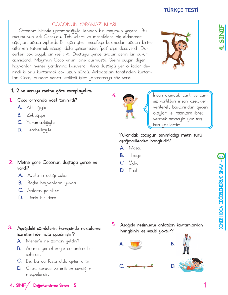 TÜRKÇE TESTİ 1. Coco ormanda nasıl tanınırdı? A. Akıllılığıyla 4. İnsan dışındaki canlı ve cansız varlıkları insan özellikleri verilerek, başlarından geçen olaylar ile insanlara ibret vermek amacıyla yazılmış kısa yazılardır. B. Zekiliğiyle C. Yaramazlığıyla D. Tembelliğiyle 2. Metne göre Coco’nun düştüğü yerde ne vardı? A. Avcıların açtığı çukur Yukarıdaki çocuğun tanımladığı metin türü aşağıdakilerden hangisidir? A. Masal B. Hikaye C. Öykü SONER HOCA DEĞERLENDİRME SINAVI - 5 1, 2 ve soruyu metne göre cevaplayalım. 4. SINIF COCO’NUN YARAMAZLIKLARI Ormanın birinde yaramazlığıyla tanınan bir maymun yaşardı. Bu maymunun adı Coco’ydu. Tehlikelere ve mesafelere hiç aldanmaz ağaçtan ağaca zıplardı. Bir gün yine mesafeye bakmadan ağacın birine atlarken tutunmak istediği dala yetişemeden ‘ pat’’ diye düşüverdi. Düşerken çok büyük bir ses çıktı. Düştüğü yerde avcılar derin bir çukur açmışlardı. Maymun Coco onun içine düşmüştü. Sesini duyan diğer hayvanlar hemen yardımına koşuverdi. Ama düştüğü yer o kadar derindi ki onu kurtarmak çok uzun sürdü. Arkadaşları tarafından kurtarılan Coco, bundan sonra tehlikeli işler yapmamaya söz verdi. D. Fabl B. Başka hayvanların yuvası C. Arıların petekleri D. Derin bir dere 3. Aşağıdaki cümlelerin hangisinde noktalama işaretlerinde hata yapılmıştır? A. Mersin’e ne zaman geldin? B. Adana, yemekleriyle de anılan bir şehirdir. C. Ee, bu da fazla oldu yeter artık. D. Çilek, karpuz ve erik en sevdiğim meyvelerdir. 4. SINIF Değerlendirme Sınavı - 5 5. Aşağıda resimlerle anlatılan kavramlardan hangisinin eş seslisi yoktur? A. B. C. D. 1 9. 6. 1 2 3 4 Yukarıda görselde yer alan hayvanların hangi ikisinin ismindeki kalın ve ince ünlü sayıları birbirine eşittir? A. 1 - 2 B. 2 - 3 yalnış sipiker yanlız maydonoz stajer aferim 4. SINIF TÜRKÇE TESTİ Yukarıdaki kelimelerden kaç tanesinin yazımı yanlıştır? A. 2 B. 3 C. 4 D. 6 C. 1 - 3 D. 3 - 4 A. Soru bildiren cümlelerin sonuna soru işareti konur. B. Hayret, kızgınlık, şaşırma ve mutluluk gibi duyguları belirtmek ve vurgulamak için ünlem işareti konur. C. Tamamlanmamış (eksiltili) cümlelerin sonuna iki nokta konur. D. Özel isimlere getirilen ekler kesme işaretiyle ayrılır. 10. SONER HOCA DEĞERLENDİRME SINAVI - 5 7. Aşağıda kullanım alanı verilen noktalama işaretlerinden hangisinde hata yapılmıştır? mektep - okul doktor - hekim ak - kara 8. Aşağıdaki cümlelerde altı çizili sözcüklerden hangisi mecaz anlamıyla kullanılmıştır? A. Burada oturmaktan çok sıkıldım. B. Erzurum’da havalar çok soğumuş. C. Bu sınavdan kalırsam yandım. D. Bu kadar ince bir ipi nereden buldun? 4. SINIF Değerlendirme Sınavı - 5 barış - sulh Yukarıdaki tabloda hangi sembolün önündeki kelime çifti arasındaki anlam ilişkisi farklıdır? A. B. C. D. 2 TÜRKÇE TESTİ 14. 4. SINIF 2- Komşu komşunun külüne muhtaçtır. 3- Kalem kılıçtan üstündür. 4- İşleyen demir pas tutmaz.. Yukarıda verilen atasözlerinden hangisi ‘ tasarruf , dayanışma ve eğitim’’ alanlarından biriyle ilgili değildir? A. 1 12. Aşağıdaki ifadelerden hangisi yanlıştır? A. Gerçek anlam, bir kelimenin aklımıza ilk gelen anlamıdır. B. Bir bilim, sanat, meslek dalıyla ya da bir konuyla ilgili özel ve belirli bir kavramı olan sözcük şeklinde ifade edilen kavram terim anlamdır. C. ‘ Elim çok acıyor.’’ cümlesindeki ‘‘acımak’’ sözcüğü mecaz anlamında kullanılmıştır. D. ‘‘Gezegen, gök taşı’’ gibi sözcükler terim anlamlı sözcüklerdir. 1- Damlaya damlaya göl olur. B. 2 C. 3 D. 4 15. Birinci sözcüğün eş anlamlısı vardır. İkinci sözcük birinci sözcüğün zıt anlamlısıdır. Üçüncü sözcüğün eş seslisi vardır. 13. Derste o kadar önemli bir konu vardı ki tüm öğrenciler ......................... Yukarıdaki öğrencinin kurduğu cümlenin sonuna aşağıdaki deyimlerden hangisi getirilirse cümle anlamlı olur? A. kendini dinledi Aşağıdaki sözcüklerin hangisi yukarıdaki tabloya uygun olarak verilmiştir? A. B. 1. sözcük 2. sözcük 3. sözcük barış sulh kayıt doktor hastane yüz B. yarım kulak dinledi C. kulak asmadı C. cevap soru ekmek D. can kulağı ile dinledi D. düşman arkadaş kara 4. SINIF Değerlendirme Sınavı - 5 3 SONER HOCA DEĞERLENDİRME SINAVI - 5 11. Aşağıdaki cümlelerin hangisinde yazım hatası yapılmıştır? A. Siz de toplantıya katılacak mısınız? B. Benim çantam siyah, kardeşiminki kırmızıydı. C. Bu sınavdan yüksek not almak hiç te kolay olmadı. D. Tam düşüyordum ki; babam elini uzattı. MATEMATİK TESTİ 232522 237520 156652 233525 4. 4858 2585 1858 Yukarıdaki sayıları küçükten büyüğe doğru sıraladığımızda baştan 2. sayı hangisi olur? A. C. B. 232522 ? 237520 D. 156652 4. SINIF 1. Yukarıda verilen işlem şemasına göre ‘ ?’ yerine hangi sayı gelmelidir? A. 4100 B. 4125 237520 C. 4131 D. 4150 2. 1895 SONER HOCA DEĞERLENDİRME SINAVI - 5 Yukarıdaki toplama işleminde sembolü 90 arttırılır, sembolü 50 azaltılırsa sonuç ne olur? A. 1935 B. 1795 C. 1685 D. 1445 5. 3. 6 9 0 2 Yukarıdaki rakamlar kullanılarak oluşturulabilecek dört basamaklı en büyük ve en küçük sayının toplamı kaçtır? A. 10256 B. 11689 C. 12252 D. 13400 4. SINIF Değerlendirme Sınavı - 5 Ob Bn Yz O B Yukarıdaki abaküste gösterilen sayıdan 8576 çıkarılırsa sonuç aşağıdaki sayılardan hangisi olur? A. 35665 B. 37585 C. 37100 D. 38500 4 6. 4281 4300 9. 5749 5800 7625 7600 2552 2500 Kenan, Sevil ve Kaan içinde sayıların yazılı olduğu kartlardan birer tane çekiyor. Ve çektikleri kartlarla ilgili aşağıdaki bilgileri veriyor. Kenan : Çektiğim kartta yazılı olan sayı 5 basamaklı en büyük çift sayıdan 5 eksiktir. Sevil : Benim çektiğim sayı