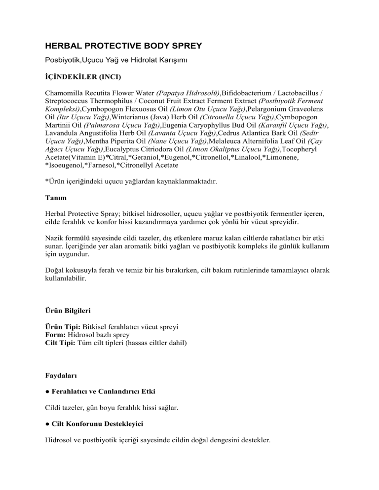 HERBAL PROTECTIVE BODY SPREY Posbiyotik,Uçucu Yağ ve Hidrolat Karışımı İÇİNDEKİLER (INCI) Chamomilla Recutita Flower Water (Papatya Hidrosolü),Bifidobacterium / Lactobacillus / Streptococcus Thermophilus / Coconut Fruit Extract Ferment Extract (Postbiyotik Ferment Kompleksi),Cymbopogon Flexuosus Oil (Limon Otu Uçucu Yağı),Pelargonium Graveolens Oil (Itır Uçucu Yağı),Winterianus (Java) Herb Oil (Citronella Uçucu Yağı),Cymbopogon Martinii Oil (Palmarosa Uçucu Yağı),Eugenia Caryophyllus Bud Oil (Karanfil Uçucu Yağı), Lavandula Angustifolia Herb Oil (Lavanta Uçucu Yağı),Cedrus Atlantica Bark Oil (Sedir Uçucu Yağı),Mentha Piperita Oil (Nane Uçucu Yağı),Melaleuca Alternifolia Leaf Oil (Çay Ağacı Uçucu Yağı),Eucalyptus Citriodora Oil (Limon Okaliptus Uçucu Yağı),Tocopheryl Acetate(Vitamin E)*Citral,*Geraniol,*Eugenol,*Citronellol,*Linalool,*Limonene, *Isoeugenol,*Farnesol,*Citronellyl Acetate *Ürün içeriğindeki uçucu yağlardan kaynaklanmaktadır. Tanım Herbal Protective Spray; bitkisel hidrosoller, uçucu yağlar ve postbiyotik fermentler içeren, cilde ferahlık ve konfor hissi kazandırmaya yardımcı çok yönlü bir vücut spreyidir. Nazik formülü sayesinde cildi tazeler, dış etkenlere maruz kalan ciltlerde rahatlatıcı bir etki sunar. İçeriğinde yer alan aromatik bitki yağları ve postbiyotik kompleks ile günlük kullanım için uygundur. Doğal kokusuyla ferah ve temiz bir his bırakırken, cilt bakım rutinlerinde tamamlayıcı olarak kullanılabilir. Ürün Bilgileri Ürün Tipi: Bitkisel ferahlatıcı vücut spreyi Form: Hidrosol bazlı sprey Cilt Tipi: Tüm cilt tipleri (hassas ciltler dahil) Faydaları ● Ferahlatıcı ve Canlandırıcı Etki Cildi tazeler, gün boyu ferahlık hissi sağlar. ● Cilt Konforunu Destekleyici Hidrosol ve postbiyotik içeriği sayesinde cildin doğal dengesini destekler. ● Aromatik Rahatlatıcı Etki Bitkisel uçucu yağların doğal kokusu ile huzur ve rahatlama hissi verir. ● Çok Amaçlı Kullanım Vücut spreyi, saç spreyi veya ortam ferahlatıcı olarak kullanılabilir. ● Günlük Kullanıma Uygun Hafif yapısı sayesinde yapışkanlık hissi bırakmaz. Uygulama Yöntemleri ● Vücut Spreyi Olarak 15–20 cm mesafeden cilde püskürtülerek uygulanır. ● Yüz Bölgesi İçin Doğrudan yüze püskürtülmemeli; önce ele sıkılıp nazikçe uygulanmalıdır. ● Ortam Spreyi Ortam havasını tazelemek ve aromatik bir atmosfer oluşturmak için kullanılabilir. Kullanmadan önce çalkalayınız. Uyarı & Güvenlik Gereklilikleri ● Haricen kullanım içindir. ● Göz ile temasından kaçınınız; temas halinde bol su ile yıkayınız. ● Çocukların ulaşamayacağı yerlerde muhafaza ediniz. ● Alerjik reaksiyon riskine karşı kullanmadan önce cildin küçük bir bölümünde test ediniz. ● Tahriş olmuş veya hassas cilt üzerine uygulamayınız. ● 2 yaş ve üzeri çocuklar için uygundur. Saklama Koşulları Oda sıcaklığında (25°C), direkt güneş ışığından uzakta muhafaza ediniz. Raf Ömrü ve Kullanım Süresi ● Üretim Sonrası Raf Ömrü: 2 yıl ● Şişe Açıldıktan Sonra Kullanım Süresi : 12 Ay Sıkça Sorulan Sorular S: Herbal Protective Spray cilde doğrudan uygulanabilir mi? C: Evet. Vücut için doğrudan uygulanabilir. Yüz için önce ele sıkılarak kullanılması önerilir. S: Hassas ciltler için uygun mudur? C: Evet. Hassas ciltler için uygundur; yine de önceden test edilmesi önerilir. S: Gün içinde kaç kez kullanılabilir? C: İhtiyaç duyuldukça gün içinde tekrar uygulanabilir. S: Saçta ağırlık yapar mı? C: Hayır. Hafif yapısı sayesinde saçta yapışkanlık veya ağırlık hissi bırakmaz. S: Güneş öncesi kullanımda sakınca var mı? C: Fototoksik etki beklenmez; ancak doğrudan güneş öncesi hassas ciltlerde ölçülü kullanım önerilir.