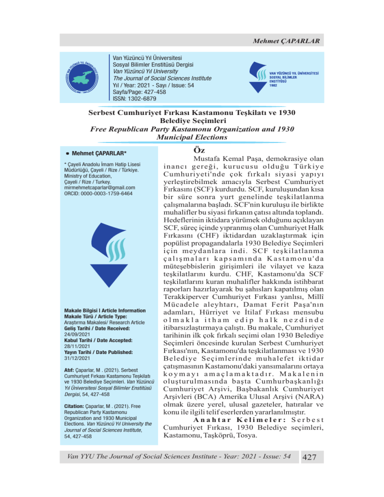 Mehmet ÇAPARLAR Van Yüzüncü Yıl Üniversitesi Sosyal Bilimler Enstitüsü Dergisi Van Yüzüncü Yıl University The Journal of Social Sciences Institute Yıl / Year: 2021 - Sayı / Issue: 54 Sayfa/Page: 427-458 ISSN: 1302-6879 Serbest Cumhuriyet Fırkası Kastamonu Teşkilatı ve 1930 Belediye Seçimleri Free Republican Party Kastamonu Organization and 1930 Municipal Elections Mehmet ÇAPARLAR* * Çayeli Anadolu İmam Hatip Lisesi Müdürlüğü, Çayeli / Rize / Türkiye. Ministry of Education, Çayeli / Rize / Turkey. [email protected] ORCID: 0000-0003-1759-6464 Makale Bilgisi | Article Information Makale Türü / Article Type: Araștırma Makalesi/ Research Article Geliș Tarihi / Date Received: 24/09/2021 Kabul Tarihi / Date Accepted: 28/11/2021 Yayın Tarihi / Date Published: 31/12/2021 Atıf: Çaparlar, M . (2021). Serbest Cumhuriyet Fırkası Kastamonu Teșkilatı ve 1930 Belediye Seçimleri. Van Yüzüncü Yıl Üniversitesi Sosyal Bilimler Enstitüsü Dergisi, 54, 427-458 Citation: Çaparlar, M . (2021). Free Republican Party Kastamonu Organization and 1930 Municipal Elections. Van Yüzüncü Yıl University the Journal of Social Sciences Institute, 54, 427-458 Öz Mustafa Kemal Paşa, demokrasiye olan inancı gereği, kurucusu olduğu Türkiye Cumhuriyeti'nde çok fırkalı siyasi yapıyı yerleştirebilmek amacıyla Serbest Cumhuriyet Fırkasını (SCF) kurdurdu. SCF, kuruluşundan kısa bir süre sonra yurt genelinde teşkilatlanma çalışmalarına başladı. SCF'nin kuruluşu ile birlikte muhalifler bu siyasi fırkanın çatısı altında toplandı. Hedeflerinin iktidara yürümek olduğunu açıklayan SCF, süreç içinde yıpranmış olan Cumhuriyet Halk Fırkasını (CHF) iktidardan uzaklaştırmak için popülist propagandalarla 1930 Belediye Seçimleri için meydanlara indi. SCF teşkilatlanma çalışmaları kapsamında Kastamonu'da müteşebbislerin girişimleri ile vilayet ve kaza teşkilatlarını kurdu. CHF, Kastamonu'da SCF teşkilatlarını kuran muhalifler hakkında istihbarat raporları hazırlayarak bu şahısları kapatılmış olan Terakkiperver Cumhuriyet Fırkası yanlısı, Millî Mücadele aleyhtarı, Damat Ferit Paşa'nın adamları, Hürriyet ve İtilaf Fırkası mensubu olmakla itham edip halk nezdinde itibarsızlaştırmaya çalıştı. Bu makale, Cumhuriyet tarihinin ilk çok fırkalı seçimi olan 1930 Belediye Seçimleri öncesinde kurulan Serbest Cumhuriyet Fırkası'nın, Kastamonu'da teşkilatlanması ve 1930 Belediye Seçimlerinde muhalefet iktidar çatışmasının Kastamonu'daki yansımalarını ortaya k o y m a y ı a m a ç l a m a k t a d ı r. M a k a l e n i n oluşturulmasında başta Cumhurbaşkanlığı Cumhuriyet Arşivi, Başbakanlık Cumhuriyet Arşivleri (BCA) Amerika Ulusal Arşivi (NARA) olmak üzere yerel, ulusal gazeteler, hatıralar ve konu ile ilgili telif eserlerden yararlanılmıştır. Anahtar Kelimeler: Serbest Cumhuriyet Fırkası, 1930 Belediye seçimleri, Kastamonu, Taşköprü, Tosya. Van YYU The Journal of Soc al Sc ences Inst tute - Year: 2021 - Issue: 54 427 Serbest Cumhuriyet Fırkası Kastamonu Teşkilatı ve 1930 Belediye Seçimleri Abstract Mustafa Kemal Pasha, due to his belief in democracy, had the Liberal Republican Party founded aiming to strive multi-party political structure in Turkey, of which he is the founder. The Liberal Republican Party (LRP), shortly after its foundation, began to organize its sections throughout Turkey. With the establishment of the LRP, the opponents began to get together under the umbrella of this political party. The LRP, explaining their goal is to walk to power, went to the streets for the 1930 municipal elections with populist propaganda to get the Republican People's Party (RPP) away from power, which worn out due to staying in power for a long time. The LRP, within the scope of the organizational work, founded the sections in cities and towns with the attempts of the entrepreneurs. RPP, preparing intelligence reports about the opponents who established the LRP organizations in Kastamonu, accused them of being followers of the Progressive Republic Party, the opponents to the National Struggle, Damat Ferit Pasha's men, being a member of the Freedom and Entente Party and tried to discredit them in the public eye. This paper aims to reveal the organization of the Liberal Republic Party in Kastamonu, which was established before the 1930 municipal election that is the first multi-party election in the history of the Republic, and the reflections of the opposition-ruling conflict in Kastamonu in this election. The Presidential Archives, Prime Ministry Republic Archives (BCA), the National Archive of America (NARA), local and national newspapers, memoirs and copyrighted works related to the subject were used in the preparation of the article. Keywords: Liberal Republic Party, 1930 Municipal Election, Kastamonu, Taşköprü, Tosya. Giriş 1929 yılında bütün dünyayı etkisi altına alan ekonomik kriz Birinci Dünya Savaşı ve akabinde yaşanan Kurtuluş Savaşının yol açtığı derin yaraları sarmakla uğraşan Türkiye’yi derinden etkiliyordu. Bu nedenle 1930’ların Türkiye’sinde tek parti iktidarı; bir yandan siyasi, sosyal, ekonomik, güvenlik sorunları ile baş etmeye çalışıyordu. (Weiker, 1973: 43; Okyar ve Seyitdanlıoğlu, 2007: 44). Diğer yandan İsmet Paşa Hükûmeti; ülkeyi imar etme çabaları kapsamında demiryolu yatırımlarına ağırlık veriyor, hazineden aslan payı demiryolu yatırımlarına ayrılıyor, yatırımların finansmanında sıkıntısı çeken hükûmet halka yeni vergiler yüklüyordu. Buna karşın halkın istek ve şikayetlerini dile getirecek, hükümetin ekonomik icraatlarına yönelik eleştirileri hukuki ve siyasi bir zemine oturtarak, hükümet icraatının kontrolünü sağlayacak çok fırkalı politik sistem bulunmuyordu (Goloğlu, 2011: 642). Yedi yıllık muhalefetsiz ortamda iç ve dış sorunlarla boğu