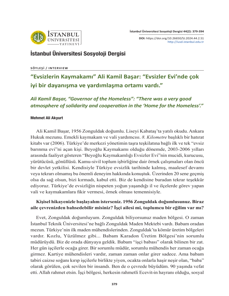 İstanbul Üniversitesi Sosyoloji Dergisi 44(2): 379-394 DOI: https://doi.org/10.26650/SJ.2024.44.2.S1 http://iusd.istanbul.edu.tr . Istanbul Üniversitesi Sosyoloji Dergisi S ÖY L E Ş İ / I N T E R V I E W “Evsizlerin Kaymakamı” Ali Kamil Başar: “Evsizler Evi’nde çok iyi bir dayanışma ve yardımlaşma ortamı vardı.” Ali Kamil Başar, “Governor of the Homeless”: “There was a very good atmosphere of solidarity and cooperation in the ‘Home for the Homeless’.” Mehmet Ali Akyurt Ali Kamil Başar, 1956 Zonguldak doğumlu. Liseyi Kabataş’ta yatılı okudu. Ankara Hukuk mezunu. Emekli kaymakam ve vali yardımcısı. 8. Kilometre başlıklı bir hatırat kitabı var (2006). Türkiye’de merkezi yönetimin taşra teşkilatına bağlı ilk ve tek “evsiz barınma evi”ni açan kişi. Beyoğlu Kaymakamı olduğu dönemde, 2003-2006 yılları arasında faaliyet gösteren “Beyoğlu Kaymakamlığı Evsizler Evi”nin mucidi, kurucusu, yürütücüsü, gönüllüsü. Kamu-sivil toplum işbirliğine dair örnek çalışmaları olan öncü bir devlet yetkilisi. Kendisiyle Türkiye evsizlik tarihinde kalmış, maalesef devamı veya tekrarı olmamış bu önemli deneyim hakkında konuştuk. Üzerinden 20 sene geçmiş olsa da sağ olsun, bizi kırmadı, kabul etti. Biz de kendisine buradan tekrar teşekkür ediyoruz. Türkiye’de evsizliğin nispeten yoğun yaşandığı il ve ilçelerde görev yapan vali ve kaymakamlara fikir vermesi, örnek olması temennisiyle. Kişisel hikayenizle başlayalım isterseniz. 1956 Zonguldak doğumlusunuz. Biraz aile çevrenizden bahsedebilir misiniz? İşçi ailesi mi, toplumcu bir eğilim var mı? Evet, Zonguldak doğumluyum. Zonguldak biliyorsunuz maden bölgesi. O zaman İstanbul Teknik Üniversitesi’ne bağlı Zonguldak Maden Mektebi vardı. Babam oradan mezun. Türkiye’nin ilk maden mühendislerinden. Zonguldak’ta kömür üretim bölgeleri vardır. Kozlu, Yüzülmez gibi... Babam Karadon Üretim Bölgesi’nin sorumlu müdürüydü. Biz de orada dünyaya geldik. Babam “işçi babası” olarak bilinen bir zat. Her gün işçilerle ocağa girer. Bir sorumlu müdür, sorumlu mühendis her zaman ocağa girmez. Kartiye mühendisleri vardır, zaman zaman onlar girer sadece. Ama babam tabiri caizse soğanı kırıp işçilerle birlikte yiyen, ocakta onlarla haşir neşir olan, “baba” olarak görülen, çok sevilen bir insandı. Ben de o çevrede büyüdüm. 90 yaşında vefat etti. Allah rahmet etsin. İşçi bölgesi, herkesin rahmetli Ecevit›in hayranı olduğu, sosyal 379 İSTANBUL ÜNİVERSİTESİ SOSYOLOJİ DERGİSİ demokrat bir çevreydi. Madencilerin bulunduğu bir sitede, lojmanda yaşadık. Çok güzel bir çocukluk devrem oldu. İlkokul, ortaokul, hep orada geçti. Sonra İstanbul’a geliyorsunuz, 1971-74 arasında Kabataş Lisesi’nde yatılı okuyorsunuz. “İstanbul’da geçirdiğim öğrencilik yıllarımda, yatılı okuldan arkadaşlarımızla kaçtığımız günlerde de sokakta yatan kişilerle karşılaşır, onlara çok acırdım.” diye belirtiyorsunuz hatta hatıratınızda. Yatılı hayatı zordu tabii. Başlarda çok zorlandım ama sonradan değerini anladım. Büyük bir etkisi oldu bana hem yatılılığın hem Kabataş’ın. Hocalarımızın, arkadaşlarımızın bıraktığı izlerin, altyapı olarak, hayatımın, kişiliğimin gelişmesinde çok önemli katkısı oldu. Bir dayanışma ve yardımlaşma ruhu geliştirdi bende. Birlik beraberlik içerisinde yaşamak, arkadaş satmamak gibi… Çok değerli hocalarımız vardı. Onları da rahmetle yad ediyorum. Kabataş’ta yatılı olduğumuz için, okuldan kaçtığımız günler oluyordu. Beyoğlu’na çıkıyorduk, Çiçek Pasajı’na falan. Orada tabii sokakta yaşayan insanları görüyorduk. O zaman da vardı. Evsizlerin dramı hiçbir zaman bitmez zaten. Dünyanın her yerinde, her dönemde evsiz vardır. Kaymakam olarak Beyoğlu’na atanmadan önceki görev yerleriniz Sivas, İmranlı; Ağrı, Diyadin; Giresun, Şebinkarahisar; Muğla, Dalaman ve İzmir, Urla. Buralarda evsizlik var mıydı? Buralar daha küçük yerler, ilçe merkezleriydi. Evsizliğe rastlamadım. Kura çekip ilk gittiğim yer İmranlı… İmranlı’da 100 köy, bir o kadar da köye bağlı, yakın mezra vardı. 80’lerin ilk yarısı. O zaman oradaki problemler daha farklıydı. Elektriği, suyu olmayan köyler vardı. Elektriksiz köylerle uğraşıyorduk. Çok çetin iklim şartları vardı kışın. Bütün köy yolları kapanırdı, onlarla mücadele ederdik. Elinizde bir tane ekip var, bir greyder, bir dozer… Kışın 100 tane köyün yolunu açmakla mükellefsiniz. Nasıl bir planlamayla yapacaksınız? Bütün kafamız onunla meşguldü. Onun da birtakım formülleri vardı… Mesela sağlık bizim için ilk sırada. Kışın doğuracak kadınların listesini tutuyordum. Hamileliğin kaçıncı ayındalar gibi önden. Bazıları arayıp bizi kandırmaya çalışıyordu hatta. Yolumuz kapalı, hanım doğuracak, doğum var, diye. Hassas noktayı fark etmişler tabii. Listeye bakıp “muhtar” diyordum, “bendeki listeye göre senin köyde doğum yok.” Öyle birtakım taktikler geliştiriyorduk. Öncelikle açmamız gereken yollar hangisiyse onları açıyorduk sırayla. Orada bu sorunlara odaklıydık. Çok maceralı, çok da keyifli bir yaşantıydı. Diyadin de öyle. Kış şartları çok ağırdı. Ağrı’da aşiret düzeni hakimdi. Sonra, Şebinkarahisar… Biraz kapalı bir toplumdu. Ama okumuş yazmışı da çoktu. Aziz Nesin, Rahşan Ecevit oralıdır mesela. Orada da güzel günler geçti. Oradayken devlet tarafından bir yıllığına Amerika’ya gönderildik, 72 kaymakam. Massachusetts eyaletinde Boston şehrindeydik. Özal göndermişti, Amerikan başkanlık sistemi o 380 Akyurt / “Evsizlerin Kaymakamı” Ali Kamil Başar ile Söyleşi: “Evsizler Evi’nde çok iyi bir dayanışma ve yardımlaşma ortamı vardı.” za