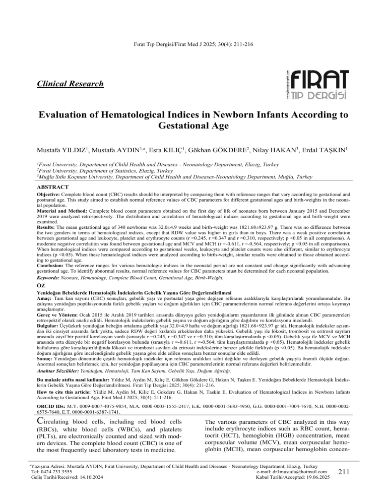 Fırat Tıp Dergisi/Firat Med J 2025; 30(4): 211-216 Clinical Research Evaluation of Hematological Indices in Newborn Infants According to Gestational Age Mustafa YILDIZ1, Mustafa AYDIN1,a, Esra KILIÇ1, Gökhan GÖKDERE2, Nilay HAKAN3, Erdal TAŞKIN1 1 Fırat University, Department of Child Health and Diseases - Neonatology Department, Elazig, Turkey 2Fırat University, Department of Statistics, Elazig, Turkey 3Muğla Sıtkı Koçman University, Department of Child Health and Diseases-Neonatology Department, Muğla, Turkey ABSTRACT Objective: Complete blood count (CBC) results should be interpreted by comparing them with reference ranges that vary according to gestational and postnatal age. This study aimed to establish normal reference values of CBC parameters for different gestational ages and birth-weights in the neonatal population. Material and Method: Complete blood count parameters obtained on the first day of life of neonates born between January 2015 and December 2019 were analyzed retrospectively. The distribution and correlation of hematological indices according to gestational age and birth-weight were examined. Results: The mean gestational age of 340 newborns was 32.0±4.9 weeks and birth-weight was 1821.68±923.97 g. There was no difference between the two genders in terms of hematological indices, except that RDW value was higher in girls than in boys. There was a weak positive correlation between gestational age and leukocyte, platelet and erythrocyte counts (r =0.245, r =0.347 and r =0.310, respectively; p <0.05 in all comparisons). A moderate negative correlation was found between gestational age and MCV and MCH (r =-0.611, r =-0.564, respectively; p <0.05 in all comparisons). When hematological indices were compared according to gestational weeks, leukocyte and platelet counts were also different, similar to erythrocyte indices (p <0.05). When these hematological indices were analyzed according to birth-weight, similar results were obtained to those obtained according to gestational age. Conclusion: The reference ranges for various hematologic indices in the neonatal period are not constant and change significantly with advancing gestational age. To identify abnormal results, normal reference values for CBC parameters must be determined for each neonatal population. Keywords: Neonate, Hematology, Complete Blood Count, Gestational Age, Birth-Weight. ÖZ Yenidoğan Bebeklerde Hematolojik İndekslerin Gebelik Yaşına Göre Değerlendirilmesi Amaç: Tam kan sayımı (CBC) sonuçları, gebelik yaşı ve postnatal yaşa göre değişen referans aralıklarıyla karşılaştırılarak yorumlanmalıdır. Bu çalışma yenidoğan popülasyonunda farklı gebelik yaşları ve doğum ağırlıkları için CBC parametrelerinin normal referans değerlerini ortaya koymayı amaçlamıştır. Gereç ve Yöntem: Ocak 2015 ile Aralık 2019 tarihleri arasında dünyaya gelen yenidoğanların yaşamlarının ilk gününde alınan CBC parametreleri retrospektif olarak analiz edildi. Hematolojik indekslerin gebelik yaşına ve doğum ağırlığına göre dağılımı ve korelasyonu incelendi. Bulgular: Üçyüzkırk yenidoğan bebeğin ortalama gebelik yaşı 32.0±4.9 hafta ve doğum ağırlığı 1821.68±923.97 gr idi. Hematolojik indeksler açısından iki cinsiyet arasında fark yoktu, sadece RDW değeri kızlarda erkeklerden daha yüksekti. Gebelik yaşı ile lökosit, trombosit ve eritrosit sayıları arasında zayıf bir pozitif korelasyon vardı (sırasıyla r =0.245, r =0.347 ve r =0.310; tüm karşılaştırmalarda p <0.05). Gebelik yaşı ile MCV ve MCH arasında orta düzeyde bir negatif korelasyon bulundu (sırasıyla r =-0.611, r =-0.564; tüm karşılaştırmalarda p <0.05). Hematolojik indeksler gebelik haftalarına göre karşılaştırıldığında lökosit ve trombosit sayıları da eritrosit indekslerine benzer şekilde farklıydı (p <0.05). Bu hematolojik indeksler doğum ağırlığına göre incelendiğinde gebelik yaşına göre elde edilen sonuçlara benzer sonuçlar elde edildi. Sonuç: Yenidoğan döneminde çeşitli hematolojik indeksler için referans aralıkları sabit değildir ve ilerleyen gebelik yaşıyla önemli ölçüde değişir. Anormal sonuçları belirlemek için, her yenidoğan popülasyonu için CBC parametrelerinin normal referans değerleri belirlenmelidir. Anahtar Sözcükler: Yenidoğan, Hematoloji, Tam Kan Sayımı, Gebelik Yaşı, Doğum Ağırlığı. Bu makale atıfta nasıl kullanılır: Yıldız M, Aydın M, Kılıç E, Gökhan Gökdere G, Hakan N, Taşkın E. Yenidoğan Bebeklerde Hematolojik İndekslerin Gebelik Yaşına Göre Değerlendirilmesi. Fırat Tıp Dergisi 2025; 30(4): 211-216. How to cite this article: Yildiz M, Aydin M, Kilic E, Gokdere G, Hakan N, Taskin E. Evaluation of Hematological Indices in Newborn Infants According to Gestational Age. Firat Med J 2025; 30(4): 211-216. ORCID IDs: M.Y. 0009-0007-4075-9854, M.A. 0000-0003-1555-2417, E.K. 0000-0001-5683-4950, G.G. 0000-0001-7004-7670, N.H. 0000-00026575-7640, E.T. 0000-0001-6387-1741. Circulating blood cells, including red blood cells (RBCs), white blood cells (WBCs), and platelets (PLTs), are electronically counted and sized with modern devices. The complete blood count (CBC) is one of the most frequently used laboratory tests in medicine. a The various parameters of CBC analyzed in this way include erythrocyte indices such as RBC count, hematocrit (HCT), hemoglobin (HGB) concentration, mean corpuscular volume (MCV), mean corpuscular hemoglobin (MCH), mean corpuscular hemoglobin concen- Yazışma Adresi: Mustafa AYDIN, Fırat University, Department of Child Health and Diseases - Neonatology Department, Elazig, Turkey Tel: 0424 233 3555 e-mail: [email protected] Geliş Tarihi/Received: 14.10.2024 Kabul Tarihi/Accepted: 19.06.2025 211 Fırat Tıp Dergisi/Firat Med J 2025; 30(4): 211-216 tration (MCHC), and PLT count, mean platelet volume (MPV), and WBC count (1). Recog