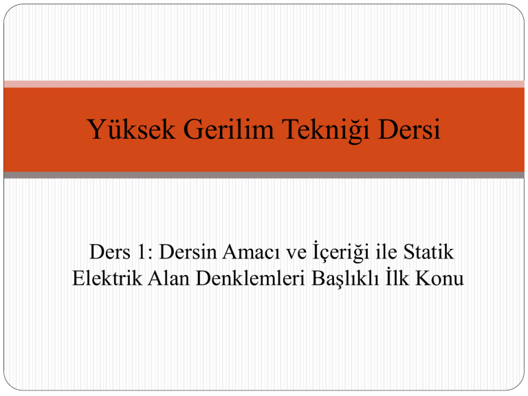 Yüksek Gerilim Tekniği Dersi Ders 1: Dersin Amacı ve İçeriği ile Statik Elektrik Alan Denklemleri Başlıklı İlk Konu YGT dersinin amacı: yüksek gerilim enerji sistemlerinin, buradaki ekipmanların, çalışma koşullarının ve mühendis sorumluluklarının öğretilmesidir. Gerilim Seviyesine Göre Elektrik Şebekeleri Alçak gerilim şebekeleri: Alçak gerilim şebekeleri, dağıtım trafolarından tüketicilere(abonelere) kadar olan elektrik hatlarından oluşur. Alçak gerilimler yalıtımı ve korunması kolay olduğu için abonelere yakın kısımlarda kurulur. Türkiyede alçak gerilim hat gerilimi 380V’dur. Orta gerilim şebekeleri: Orta gerilim şebekeleri, 1000V (1kV) ile 35000V (35kV) gerilimler arasındaki şebekelerdir. Yüksek ve çok yüksek gerilim şebekeleri ile alçak gerilim şebekelerinin birbirine bağlanması işleminde kullanılır. Yüksek gerilimlerin direkt olarak abonelere verilmesi izolasyon ve güvenlik açışından uygun değildir. Bu sebeple yüksek gerilimler uygun değerlere indirilerek orta gerilim şebekelerine bağlanır. Orta gerilim şebekeleri küçük şehirler ve sanayi bölgelerine elektrik enerjisinin taşınmasında kullanılır. 10 km’ye kadar olan uzunluklarda 3 ile 10kV, 20 ile 30 km arasındaki uzunluktaki hatlarda10-20kV, 30 ile 70 km arasındaki uzaklıklarda 20-35kV’luk gerilimler kullanılması uygun olurken, 70 km’yi geçen uzunluktaki hatlarda yüksek gerilimler kullanılmaktadır. Türkiye’de kullanılan orta gerilim şebekelerinde 6.3,10.5,15 ve 30kV’lik gerilimler kullanılmaktadır. Yüksek gerilim şebekeleri: Yüksek gerilim şebekeleri, 35kV ile 154kV arasındaki gerilimi kullanan şebekelerdir. Elektrik enerjisinin üretildiği santrallerden başlayan ve büyük şehirler ile bölgelerin başlangıcı arasında kullanılan şebekelerdir. Yüksek gerilimde dağıtım yapılmaz. Yüksek gerilimler iletime en uygun gerilimlerdir. Çok yüksek gerilim şebekeleri: Yüksek Gerilimin Güncel Standartlardaki Tanımı IEC (International Electrotechnical Commission) ye göre ; Alternatif Gerilim’de 1000 V un, Doğru Gerilim’de 1200 V’un üzeri YÜKSEK GERİLİM kabul edilir. Neden uzak mesafelere enerji iletiliyor? Neden yüksek gerilim ? Yüksek Gerilim Avantajları Uzun mesafelere aynı güç aktarılırken (iletilirken); ✔ düşük akım → düşük kayıp ✔ daha küçük iletken kesiti ✔ yüksek sistem güç transfer verimi Yüksek Gerilim Dezavantajları ⚠ izolasyon maliyeti yüksek ⚠ Elektrik alan etkileri ortaya çıkar (korona kayıpları, radyo parazitleri) ⚠ insan güvenliği riski ⚠ pahalı şalt ekipmanı (ölçü trafoları, kesiciler, ayırıcılar) Delinme ve Atlama Ud arttırılırsa deşarj (boşalma) iki yoldan meydana gelir: Yalıtkan madde d ile gösterilen yol üzerinden delinir. Deşarj a ile gösterilen yol üzerinden atlar. Delinme Boşalma (Atlama) Delinme ve Atlama Etkileri Delinmede yalıtkan madde kullanılmaz hale gelir, atlama da zarar görmez. Fakat atlama olayı da şebekede arızalara sebep olması bakımından önemlidir. e=Ud/Un : yalıtkan maddenin emniyet derecesi denir. Daima e>1 olmalıdır. Yalıtkan maddenin birim kalınlığına karşılık gelen delinme gerilimine ‘‘delinme dayanımı (Ed)’’ denir: Ed=Ud/a (kV/cm).