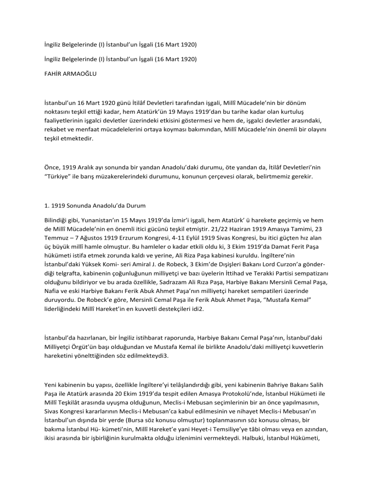 İngiliz Belgelerinde (I) İstanbul’un İşgali (16 Mart 1920) İngiliz Belgelerinde (I) İstanbul’un İşgali (16 Mart 1920) FAHİR ARMAOĞLU İstanbul’un 16 Mart 1920 günü İtilâf Devletleri tarafından işgali, Millî Mücadele’nin bir dönüm noktasını teşkil ettiği kadar, hem Atatürk’ün 19 Mayıs 1919’dan bu tarihe kadar olan kurtuluş faaliyetlerinin işgalci devletler üzerindeki etkisini göstermesi ve hem de, işgalci devletler arasındaki, rekabet ve menfaat mücadelelerini ortaya koyması bakımından, Millî Mücadele’nin önemli bir olayını teşkil etmektedir. Önce, 1919 Aralık ayı sonunda bir yandan Anadolu’daki durumu, öte yandan da, İtilâf Devletleri’nin “Türkiye” ile barış müzakerelerindeki durumunu, konunun çerçevesi olarak, belirtmemiz gerekir. 1. 1919 Sonunda Anadolu’da Durum Bilindiği gibi, Yunanistan’ın 15 Mayıs 1919’da İzmir’i işgali, hem Atatürk’ ü harekete geçirmiş ve hem de Millî Mücadele’nin en önemli itici gücünü teşkil etmiştir. 21/22 Haziran 1919 Amasya Tamimi, 23 Temmuz – 7 Ağustos 1919 Erzurum Kongresi, 4-11 Eylül 1919 Sivas Kongresi, bu itici güçten hız alan üç büyük millî hamle olmuştur. Bu hamleler o kadar etkili oldu ki, 3 Ekim 1919’da Damat Ferit Paşa hükümeti istifa etmek zorunda kaldı ve yerine, Ali Riza Paşa kabinesi kuruldu. İngiltere’nin İstanbul’daki Yüksek Komi- seri Amiral J. de Robeck, 3 Ekim’de Dışişleri Bakanı Lord Curzon’a gönderdiği telgrafta, kabinenin çoğunluğunun milliyetçi ve bazı üyelerin İttihad ve Terakki Partisi sempatizanı olduğunu bildiriyor ve bu arada özellikle, Sadrazam Ali Rıza Paşa, Harbiye Bakanı Mersinli Cemal Paşa, Nafia ve eski Harbiye Bakanı Ferik Abuk Ahmet Paşa’nın milliyetçi hareket sempatileri üzerinde duruyordu. De Robeck’e göre, Mersinli Cemal Paşa ile Ferik Abuk Ahmet Paşa, “Mustafa Kemal” liderliğindeki Millî Hareket’in en kuvvetli destekçileri idi2. İstanbul’da hazırlanan, bir İngiliz istihbarat raporunda, Harbiye Bakanı Cemal Paşa’nın, İstanbul’daki Milliyetçi Örgüt’ün başı olduğundan ve Mustafa Kemal ile birlikte Anadolu’daki milliyetçi kuvvetlerin hareketini yönelttiğinden söz edilmekteydi3. Yeni kabinenin bu yapısı, özellikle İngiltere’yi telâşlandırdığı gibi, yeni kabinenin Bahriye Bakanı Salih Paşa ile Atatürk arasında 20 Ekim 1919’da tespit edilen Amasya Protokolü’nde, İstanbul Hükümeti ile Millî Teşkilât arasında uyuşma olduğunun, Meclis-i Mebusan seçimlerinin bir an önce yapılmasının, Sivas Kongresi kararlarının Meclis-i Mebusan’ca kabul edilmesinin ve nihayet Meclis-i Mebusan’ın İstanbul’un dışında bir yerde (Bursa söz konusu olmuştur) toplanmasının söz konusu olması, bir bakıma İstanbul Hü- kümeti’nin, Millî Hareket’e yani Heyet-i Temsiliye’ye tâbi olması veya en azından, ikisi arasında bir işbirliğinin kurulmakta olduğu izlenimini vermekteydi. Halbuki, İstanbul Hükümeti, Müttefikler (veya İtilâf Devletleri, veya işgalci devletler) bakımından, Türk toprakları üzerindeki her türlü sömürgeci ve emperyalist plânlarını gerçekleştirmede, baskı yoluyla kullanabilecekleri bir araç idi. Millî Hareket ise, bu tekerleğin önüne konan büyük bir kaya parçası idi. Hele, Atatürk’ün, İstanbul ile daha yakın temas kurmak için, Heyet Temsiliye’yi Ankara’ya naklederek, Millî Mücadele’yi İstanbul’a çok yakın bir mesafeye getirmesi, İstanbul-Ankara işbirliği bakımından Müttefikleri iyice korkutmuştur. 2. Osmanlı Devleti ile İlgili Barış Müzakereleri Osmanlı Devleti’yle, yani Batılıların deyimi ile “Türkiye” ile barış konuları, esasında, Paris Konferansı’nın 1919 Ocak ayında açıldığından itibaren gündeme gelmiştir. Çünkü, Yunanistan başta olmak üzere, Araplar, Ermeniler, Kürtler, v.s. , “leş kargaları” örneği, Osmanlı İmparatorluğu topraklarından pay kapmak için Paris’e üşüşmüşlerdir. Her biri, kendi ihtiraslarına ve hayal güçlerine göre Osmanlı topraklarından pay kopartmanın peşindeydi. “Leş Kargaları”nın bu tutumu, Osmanlı İmparatorluğu’nun “cesedi” üzerin- deki çıkarlarını gerçekleştirmek isteyen işgalci devletlerin politik amaçları ile ters orantılıydı. Bununla beraber, üç büyükler, yani İngiltere, Fransa ve İtalya, Amerika ile beraber, önce, başta Almanya olmak üzere yenilmiş Avrupa devletleri ile yapılacak barışa yöneldiklerinden Osmanlı Devleti (Türkiye) ile yapılacak barışa hemen sıra gelmedi. Amerikan Senatosu, Almanya ile imzalanan Ver- say Barış Antlaşması’nı onaylamayı reddedip, Amerika, Aralık 1919’da Paris Konferansı’ndan çekildikten sonra, Osmanlı Devleti’yle yapılacak barış antlaşması sistemli bir şekilde ele alınmaya başlandı. Bu konuda ilk toplantı, İngiltere Başbakanı Lloyd George ile Fransa Başbakanı Clémenceau ve heyetleri arasında 11 Aralık 1919’da Londra’da yapıldı4. Bu toplantıda Clémenceau, İngiltere ile tam bir işbirliği içine girerek, Fransa’nın bütün amaçlarını İngiltere’ye kabul ettirme çabası içinde olmuştur. İngiltere ile bir görüş ayrılığı veya anlaşmazlık çıkmamasına çalışmış- tır. Bununla beraber, üzerinde en fazla tartışılan konu, İstanbul ve Padişah’ın durumu olmuştur. Fransa, İstanbul Şehri ile Boğazlar sorununun birbirinden ayrı olarak ele alınmasını ve Padişah’ın İstanbul’da oturmasına izin verilmesini ileri sürerken, İngiltere, İstanbul’un Boğazlar sorunundan ayrı olarak ele alınamayacağı ve İstanbul’un da milletlerarası bir otoritenin yönetimine verilmesi gerektiği tezini savunmuştur. Padişah’ın statüsü için de, Venizelos’un İngiltere’ye telkin ettiği, “Vatikan’vari” bir sistemin tartışması yapıl- mıştır5. Clémenceau’n