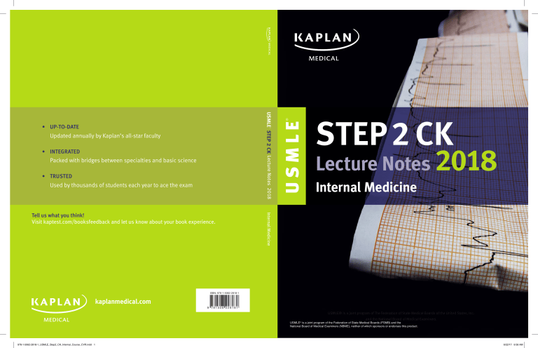 Updated annually by Kaplan’s all-star faculty • INTEGRATED Packed with bridges between specialties and basic science • TRUSTED Used by thousands of students each year to ace the exam STEP 2 CK Lecture Notes 2018 Internal Medicine Internal Medicine Tell us what you think! Visit kaptest.com/booksfeedback and let us know about your book experience. USMLE ® ® USMLE STEP 2 CK Lecture Notes 2018 • UP-TO-DATE ISBN: 978-1-5062-2818-1 kaplanmedical.com 9 781506 228181 USMLE® is a joint program of The Federation of State Medical Boards of the United States, Inc. and the National Board of Medical Examiners. USMLE® is a joint program of the Federation of State Medical Boards (FSMB) and the National Board of Medical Examiners (NBME), neither of which sponsors or endorses this product. 978-1-5062-2818-1_USMLE_Step2_CK_Internal_Course_CVR.indd 1 6/22/17 9:58 AM USMLE ® STEP 2 CK Lecture Notes 2018 Internal Medicine USMLE® is a joint program of The Federation of State Medical Boards of the United States, Inc. and the National Board of Medical Examiners. USMLE S2 Internal Medicine.indb 1 6/13/17 10:00 PM USMLE® is a joint program of the Federation of State Medical Boards (FSMB) and the National Board of Medical Examiners (NBME), neither of which sponsors or endorses this product. This publication is designed to provide accurate information in regard to the subject matter covered as of its publication date, with the understanding that knowledge and best practice constantly evolve. The publisher is not engaged in rendering medical, legal, accounting, or other professional service. If medical or legal advice or other expert assistance is required, the services of a competent professional should be sought. This publication is not intended for use in clinical practice or the delivery of medical care. To the fullest extent of the law, neither the Publisher nor the Editors assume any liability for any injury and/or damage to persons or property arising out of or related to any use of the material contained in this book. © 2017 by Kaplan, Inc. Published by Kaplan Medical, a division of Kaplan, Inc. 750 Third Avenue New York, NY 10017 All rights reserved. The text of this publication, or any part thereof, may not be reproduced in any manner whatsoever without written permission from the publisher. 10 9 8 7 6 5 4 3 2 1 Course ISBN: 978-1-5062-2818-1 Retail Kit ISBN: 978-1-5062-2080-2 This item comes as a set and should not be broken out and sold separately. Kaplan Publishing print books are available at special quantity discounts to use for sales promotions, employee premiums, or educational purposes. For more information or to purchase books, please USMLE® a joint program of Thedepartment Federation of Medical Boards of the United States, Inc. call the Simon & isSchuster special sales atState 866-506-1949. and the National Board of Medical Examiners. USMLE S2 Internal Medicine.indb 2 6/13/17 10:00 PM Editors Joseph J. Lieber, MD Associate Director of Medicine Elmhurst Hospital Center Associate Professor of Medicine Associate Program Director in Medicine for Elmhurst Site Icahn School of Medicine at Mt. Sinai New York, NY Frank P. Noto, MD Assistant Professor of Internal Medicine Site Director, Internal Medicine Clerkship and Sub-Internship Icahn School of Medicine at Mt. Sinai New York, NY Hospitalist Elmhurst Hospital Center New York, NY The editors would like to acknowledge Manuel A. Castro, MD, AAHIVS, Amirtharaj Dhanaraja, MD, and Aditya Patel, MD, and Irfan Sheikh, MD for their contributions. USMLE® is a joint program of The Federation of State Medical Boards of the United States, Inc. and the National Board of Medical Examiners. USMLE S2 Internal Medicine.indb 3 6/13/17 10:00 PM We want to hear what you think. What do you like or not like about the Notes? Please email us at [email protected]. USMLE® is a joint program of The Federation of State Medical Boards of the United States, Inc. and the National Board of Medical Examiners. USMLE S2 Internal Medicine.indb 4 6/13/17 10:00 PM Table of Contents Chapter Title 00 Chapter 1: Preventive Medicine . . . . . . . . . . . . . . . . . . . . . . . . . . . . . . . . . . . . . . . . . . 1 Chapter 2: Endocrinology . . . . . . . . . . . . . . . . . . . . . . . . . . . . . . . . . . . . . . . . . . . . . . 11 Chapter 3: Rheumatology . . . . . . . . . . . . . . . . . . . . . . . . . . . . . . . . . . . . . . . . . . . . . . 61 Chapter 4: Gastroenterology . . . . . . . . . . . . . . . . . . . . . . . . . . . . . . . . . . . . . . . . . . . . 85 Chapter 5: Cardiology . . . . . . . . . . . . . . . . . . . . . . . . . . . . . . . . . . . . . . . . . . . . . . . 125 Chapter 6: Hematology . . . . . . . . . . . . . . . . . . . . . . . . . . . . . . . . . . . . . . . . . . . . . . 193 Chapter 7: Infectious Diseases . . . . . . . . . . . . . . . . . . . . . . . . . . . . . . . . . . . . . . . . . 225 Chapter 8: Nephrology . . . . . . . . . . . . . . . . . . . . . . . . . . . . . . . . . . . . . . . . . . . . . . . 281 Chapter 9: Pulmonology . . . . . . . . . . . . . . . . . . . . . . . . . . . . . . . . . . . . . . . . . . . . . 321 Chapter 10: Emergency Medicine . . . . . . . . . . . . . . . . . . . . . . . . . . . . . . . . . . . . . . 361 Chapter 11: Neurology . . . . . . . . . . . . . . . . . . . . . . . . . . . . . . . . . . . . . . . . . . . . . . . 405 Chapter 12: Dermatology . . . . . . . . . . . . . . . . . . . . . . . . . . . . . . . . . . . . . . . . . . . . . . 433 Chapter 13: Radiology/Imaging . . . . . . . . . . . . . . . . . . . . . . . . . . . . . . . . . . . . . . . . 455 Chapter 14: Ophthalmology . . . . . . . . . . . . . . . . . . . . . . . . . . . . . . . . . . . . . . . . . . 465 Index . . . . . . . . . . . . . . . . . . . . . . . . . . . . . . . . . . . . . . . . . . . . . . . . . . . . . . . . . . . . . . . . . . . . 473 Additional resources available at www.kaptest.com/usmlebookresources USMLE® is a joint program of The Federation of St
