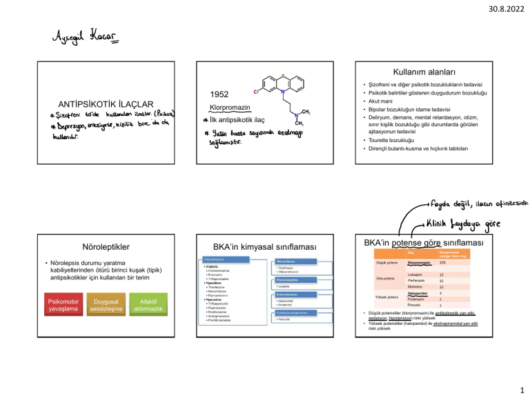 30.8.2022 Kullanım alanları • Şizofreni ve diğer psikotik bozuklukların tedavisi 1952 ANTİPSİKOTİK İLAÇLAR Klorpromazin İlk antipsikotik ilaç • Psikotik belirtiler gösteren duygudurum bozukluğu • Akut mani • Bipolar bozukluğun idame tedavisi • Deliryum, demans, mental retardasyon, otizm, sınır kişilik bozukluğu gibi durumlarda görülen ajitasyonun tedavisi • Tourette bozukluğu • Dirençli bulantı-kusma ve hıçkırık tabloları Nöroleptikler BKA’in kimyasal sınıflaması • Nörolepsis durumu yaratma kabiliyetlerinden ötürü birinci kuşak (tipik) antipsikotikler için kullanılan bir terim BKA’in potense göre sınıflaması İlaç Düşük potens Klorpromazin eşdeğer dozu (mg) Klorpromazin Loksapin Orta potens Perfenazin Molindon Psikomotor yavaşlama Duygusal sessizleşme Afektif aldırmazlık Yüksek potens Haloperidol Flufenazin Pimozid • Düşük potensliler (klorpromazin) ile antikolinerjik yan etki, sedasyon, hipotansiyon riski yüksek • Yüksek potensliler (haloperidol) ile ekstrapiramidal yan etki riski yüksek 1 30.8.2022 Ana etki mekanizması Diğer D2 antagonist H1, M1, 1 antagonist BKA Birinci Kuşak (BKA) Nöroleptikler Tipik Geleneksel İkinci Kuşak (İKA) D2 ve 5-HT2A antagonist Atipik Üçüncü Kuşak (ÜKA) Dopamin parsiyel agonisti H1, M1, 1, 5-HT2C antagonist 5-HT1A agonist Klorpromazin Haloperidol Flupentiksol Flufenazin Perfenazin İKA Klozapin Risperidon Paliperidon Olanzapin Ketiyapin Ziprasidon Bütün antipsikotikler dopaminerjik iletimi azaltırlar ÜKA Aripiprazol Brekspiprazol Kariprazin D2 antagonizması BKA BKA İKA ÜKA İKA D2 kısmi agonizması ÜKA 5-HT1A agonist 5-HT2A antagonist Dopamin Aripiprazol BKA Tam agonist Antipsikotik Yanıt (%) Grup Kısmi agonist Antagonist 2 30.8.2022 Şizofrenide dopamin hipotezi Şizofreni belirtileri ile ilişkili dopamin yolakları 4 Dopaminerjik Yolak • Postsinaptik dopamin reseptör antagonizması bir ilacın antipsikotik özelliğini açıklayan ortak mekanizmadır Korteks Mezolimbik yolakta aşırı aktivite Mezokortikal yolakta azalmış aktivite • Dopamini arttıran ilaçlar – Şizofreni benzeri belirtiler – Kokain, L-dopa, amfetamin Negatif ve bilişsel belirtiler Pozitif belirtiler Mezolimbik yolaktedavisiz şizofreni YÜKSEK Mezokortikal DLPFC yolak D2 antagonisti Mezokortikal VMPFC yolak D2 antagonisti DÜŞÜK DÜŞÜK Pozitif belirtiler Mezolimbik yolak- D2 antagonisti • Mezolimbik: pozitif belirtiler • Mezokortikal: negatif ve bilişsel belirtiler OOFF OOFF • Nigrostriatal: EPS ve TD Pozitif belirtiler azalmış • Tuberoinfindibüler: hiperprolaktinemi D2 antagonisti İkincil negatif belirtiler D2 antagonisti Bilişsel belirtilerin düzelmemesi veya kötüleşmesi İkincil negatif belirtiler Afektif belirtilerin düzelmemesi veya kötüleşmesi 3 30.8.2022 • İKA’lerin 5-HT2A antagonizması serotoninin dopamin nöronu üzerindeki frenleyici etkisini ortadan kaldırır • Dopamin salınımı artar İKA’ler dopaminin normal veya düşük olduğu bölgelerde dopamin azalmasına neden olmaz. Dopaminerjik iletim Mezolimbik yolak Maksimum Aktivite Şizofreni Normal Aktivite Bilişsel, afektif. negatif bel. tedavisi MEZOKORTİKAL EPS daha az Prolaktin artışı daha az NİGROSTRİATAL TUBEROİNFİNDİBULAR Bazal Aktivite Dopaminerjik iletim Maksimum Aktivite Mezokortikal yolak Normal Aktivite D2 5HT2A Şizofreni Bazal Aktivite İlaç seçimi Şizofrenide tedavi evreleri Önceki yanıt öyküsü Akut dönem • • • İlk epizod Psikotik relaps Ajitasyon Sürdürüm dönemi • • Relapsın önlenmesi İşlevselliğin iyileştirilmesi Yan etki profili • EPS: yüksek potensli BKA (haloperidol) • Kilo artışı ve metabolik etkiler: olanzapin, klozapin • Hiperprolaktinemi: BKA’ler, risperidon, paliperidon Akut psikoz • İlk seçenek İKA/ÜKA • Tedaviye yanıtı değerlendirmek için 3-4 hafta • Yanıt alınmamışsa başka bir ilaç denenir Psikotik belirtilerin iyileşmesi 2. hafta 4. hafta Aylar 4 30.8.2022 Sürdürüm tedavisi • Amaç Antipsikotiklerin yan etkileri • İlaç birden kesilmemeli, yavaş yavaş • relapsların önlenmesi • işlevselliğin iyileştirilmesi • Etkili en düşük doz kullanılmalı • İlk psikotik epizodtan sonra en az 1-2 yıl azaltılmalı • Bazı hastalarda im. enjeksiyon şeklinde uzun etkili antipsikotikler kullanılabilir. • Birden fazla psikotik epizod geçirilmişse en az 5 yıl Nigrostriatal yolaktedavisiz şizofreni Ekstrapiramidal yan etkiler • Akut – Distoni – Parkinsonizm – Akatizi Tardiv diskinezi • Geç • Uzun süreli AP tedavi alan hastalar TD gelişimi açısından düzenli olarak takip edilmeli – Tardiv diskinezi • Anormal istemsiz hareketler Nigrostriatal yolak- D2 antagonisti • Genellikle ağız ve dil kasları etkilenir DÜŞÜK • Vücudun diğer kısımları da etkilenebilir • Fark edildiğinde, hasta hemen uzmana yönlendirilmeli D2 antagonisti 5 30.8.2022 Parkinsonizm • AP ilaçlar ile oldukça sık • Genelde bir kaç hafta içinde gelişir • Tremor, rijidite, bradikinezi • İlaç değiştirme • Doz azaltma • Biperiden tablet (Akineton®) ekleme Akut distoni Akatizi • AP tedavinin ilk birkaç haftası içinde ortaya çıkar • Anksiyete ve gerginlik hissi • Huzursuzluk ve ajitasyon • Hasta kendini dolaşıp durmak zorunda hisseder, oturduğu yerde kıpırdanır • Diazepam, beta bloker Acil tedavi • Genelde tedavinin ilk bir kaç günü içinde ortaya çıkar • iv veya im biperiden (Akineton® 5 mg) • Boyun, ağız, dil ve bazen de diğer kas gruplarının uzun süreli olarak ağrılı kasılması • Önceden distonik reaksiyon öyküsü olan hastalarda, yeniden AP başlanırken profilaktik olarak biperiden kullanılabilir. • Ekstraoküler kaslar tutulmuşsa, gözlerin yukarı bakar pozisyonda kilitlendiği “okülojirik kriz” • Larinks kasları etkilenmişse, solunum sıkıntısı Akut distoni • D