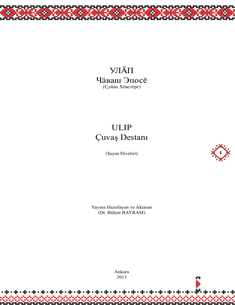 УЛӐП Чӑвaш Эпосӗ (Ҫуйӑн Xӗветӗрӗ) ULIP Çuvaş Destanı (Şuyın Hivetiri) Yayına Hazırlayan ve Aktaran (Dr. Bülent BAYRAM) Ankara 2013 1 TÜRKSOY Uluslararası Türk Kültürü Teşkilatı ULIP Çuvaş Türklerinin Kahramanlık Destanı 2 İnceleme, Transkripsiyon, Türkiye Türkçesine Aktarma, Açıklamalı Notlar ve Dizin, Dr. Bülent BAYRAM Grafik Tasarım Okan YURDAKUL Baskı - Cilt Öncü Basım Evi - Basım Yayım Tanıtım Ltd. Şti. Kazım Karabekir Cad. Ali Kabakçı İşhanı 85/2 İskitler - ANKARA Tel: 0.312 384 31 20 Bu eserin tüm hakları saklıdır. Yazılar ve görsel malzemeler yayımcıdan yazılı izin alınmadan tümüyle ya da kısmen yayımlanamaz. Elektronik, mekanik, fotokopi, kayıt vesaire araç ve ortamda çoğaltılamaz ve iletilemez. TÜRKSOY, Uluslararası Türk Kültürü Teşkilatı, 2010 Ferit Recai Ertuğrul Cad. No:8 06450 Oran - ANKARA Tel:90 (312) 491 01 00 Faks: 90 (312) 491 01 11 www.turksoy.org [email protected] SUNUŞ Çuvaşlar, Türk Dünyası’nın dilleri, kültürleri ile en dikkat çeken topluluklarından birisidir. Bu konuda edindikleri özel konuma rağmen belki de dillerinin diğer Türk şive ve lehçelerinden farklılıkları sebebiyle gözden uzak bir durumdadırlar. Son yıllarda özellikle Türkiye’de gerek bilimsel, gerekse kültürel alanlarda yapılan çalışmalarla Çuvaşlar, diğer Türk boyları tarafından ve özellikle de Türkiye Türkleri tarafından daha yakından tanınmaya başlamıştır. Türksoy bu sürecte, Çuvaş sanatçılarını, halk oyunları gruplarını çeşitli toplantılara çağırarak kültürel alanda yaptığı desteklere Ulıp(Çuvaş Destanı) adlı eseri yayımlayarak bilimsel alanda da bir katkı daha yapmaktadır. Orta İdil coğrafyasında kültürlerini, aralarında yaşadıkları güçlü ve etkili topluluklar arasında yaşatmaya çalışan Çuvaşlar dil ve folklor alanında Türk kültürünün arkaik pek çok özelliğini günümüze kadar getirmişlerdir. Ancak gelişen dünya, küreselleşme, teknolojik gelişmeler sözlü kültürün hızla yok olmasını da beraberinde getirmektedir. Kültür aktarımında yeni yollar, teknolojik gelişmelerin kullanımı, kültürel zenginliklerin kayda alınması ve bunların yeniden yaratılarak insanların beğenilerine sunulması bir zorunluluk haline gelmiştir. Çuvaş şairi ŞuyınHivetiri de Ulıpdestanını kaleme alarak bu sürece bir katkıda bulunmuştur. Yayımladığımız bu destan Manas, KozıKörpeş, Köroğlu, Kız Jibek vb. gibi bir sözlü kültür ürünü değildir. Ulıp, şairin sözlü kültürden kendisi veya başka araştırmacılar tarafından derlenen sözlü kültür malzemelerini, tarihi bazı olayları, Çuvaş geleneksel dininin anlatmalarını hayal dünyasının zenginlikleriyle harmanlayarak bir araya getirdiği, nazma çektiği bir eserdir. Çuvaş alplarını, arşuri gibi Çuvaş mitolojik varlıklarını, esrel, iye, kiremet, vutış gibi geleneksel Çuvaş dini inançlarının varlıklarını, tuhya, surpan gibi geleneksel giyim kuşamlarını, atasözlerini, deyimleri, bilmeceleri şair büyük bir ustalıkla bir araya getirmiştir ve eserine nakşetmiştir. Yayınlanan metin, Türk destan araştırmaları, folklor-edebiyat ilişkisi, mitoloji, halk inanışları, yapma destanlar konusunda çalışan araştırmacılar tarafından da kullanılabilecek önemli bir kaynaktır. Dr. Bülent Bayram, destan metnini Türkiye Türkçesine aktarmış, açıklama notlarını hazırlamış ve destanı genel olarak değerlendirdiği giriş bölümünü de kaleme almıştır. Bayram, eserin giriş kısmında, destanın şairi ŞuyınHivetiri, Ulıp destanının konu ve olay örgüsü, Ulıp destanının önemli motifleri hakkında bilgi vermektedir. Metinde destanın Çuvaş Türkçesi ve Türkiye Türkçesi aynı sayfada verilmektedir. Zaman zaman metinde doğrudan aktarılamayan yerlerin açıklanması için yapılan açıklamaların yer aldığı aktarma bölümünden sonra kısa açıklama notları ve dizin ile çalışma tamamlanmaktadır. Hem yayımlanan metnin hacmi hem de açıklamalardan anlaşıldığı kadarıyla bu eser için söylenecek çok söz araştırmacıların ilgisini beklemektedir. Bugüne kadar birçok Türk destanını yayımlayan TÜRKSOY olarak Çuvaş Türklerinin Ulıp destanını yayımlamak da bizleri ziyadesiyle mutlu etmiştir. Düsen KASEİNOV TÜRKSOY Genel Sekreteri 3 ÖN SÖZ Destanlar, halk edebiyatı metinleri içerisinde diğer türlerle karşılaştırıldığında konuları bakımından millî kültürün, millî hislerin yoğunluğu sebebiyle özel bir öneme sahip olmuşlardır. Bir millî destana sahip olmak gurur kaynağı olmuştur. Pek çok milletin folklor araştırmaları tarihinde destan araştırmaları çoğunlukla ilk sıralarda yer almıştır. Milletlerin dünyada en çok tanınan halk edebiyatı metinlerinin de çoğu zaman destanlarının oluşu ona atfedilen önemin bir başka göstergesidir. Halk edebiyatı denildiğinde Finlerin Kalevala, Farsların Şehnâme, Kırgızların Manas, Rusların İgor, Yunanlıların İlyada ve Odisse vb. ile birlikte zikredilmeleri bu önemden kaynaklanmaktadır. Destan metinleri, milletin kahramanlık duygularını yansıtan metinlerin araştırılması yanında bir millî destan yazılması da araştırmacıları, yazar ve şairleri meşgul eden bir başka konu olmuştur. Sözlü gelenek içerisinde bir destan sahibi olamamış ya da olsalar dahi, zaman içerisinde kaybolmuş, unutulmuş olmaları gibi sebeplerle millî destanı bir araya getirme çabaları pek çok toplumda yeni destan metinlerinin daha doğrusu telif destan metinlerinin ortaya çıkmasını sağlamıştır. Aslında yukarıda zikredilen metinlerin de birçoğu sözlü gelenekten ziyade yazılı geleneğin ürünleridir. Ancak hepsinin yine de folklor geleneklerine dayandığı bir gerçektir. 4 İdil-Ural bölgesinin Türk boyl