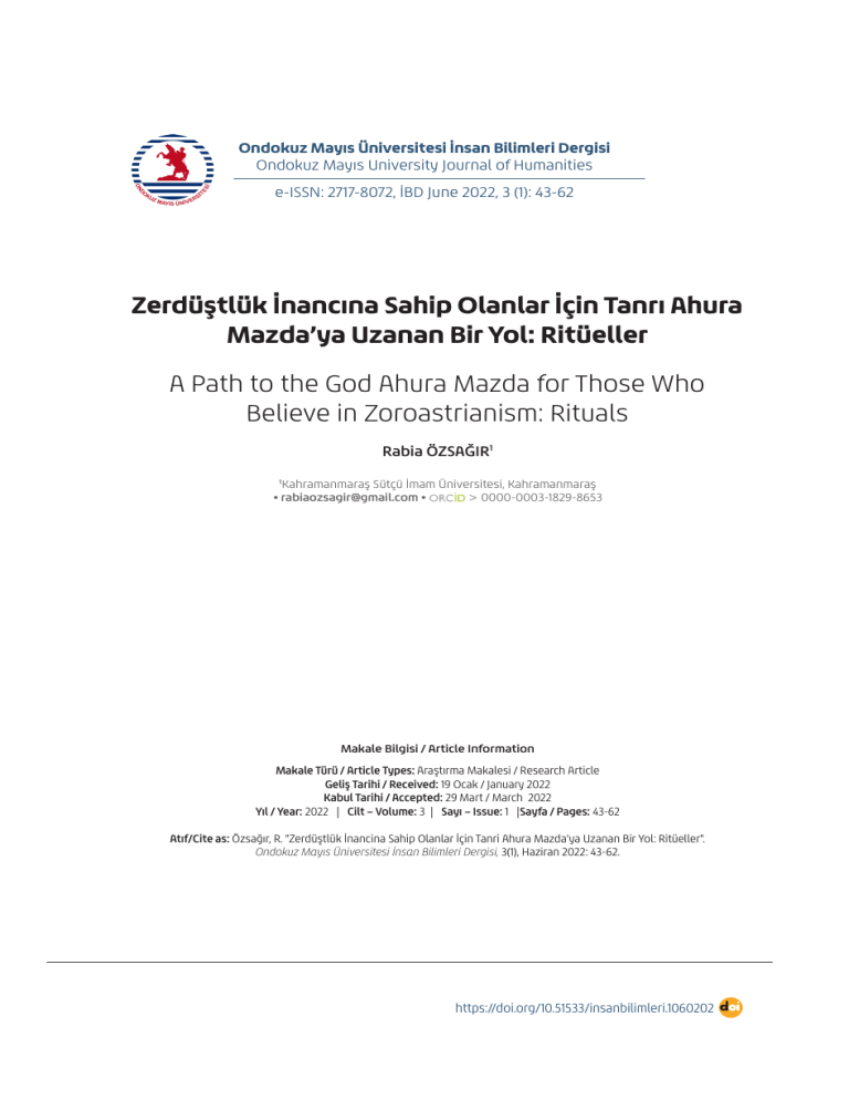 Ondokuz Mayıs Üniversitesi İnsan Bilimleri Dergisi Ondokuz Mayıs University Journal of Humanities e-ISSN: 2717-8072, İBD June 2022, 3 (1): 43-62 Zerdüştlük İnancına Sahip Olanlar İçin Tanrı Ahura Mazda’ya Uzanan Bir Yol: Ritüeller A Path to the God Ahura Mazda for Those Who Believe in Zoroastrianism: Rituals Rabia ÖZSAĞIR1 1 Kahramanmaraş Sütçü İmam Üniversitesi, Kahramanmaraş • [email protected] • > 0000-0003-1829-8653 Makale Bilgisi / Article Information Makale Türü / Article Types: Araştırma Makalesi / Research Article Geliş Tarihi / Received: 19 Ocak / January 2022 Kabul Tarihi / Accepted: 29 Mart / March 2022 Yıl / Year: 2022 | Cilt – Volume: 3 | Sayı – Issue: 1 |Sayfa / Pages: 43-62 Atıf/Cite as: Özsağır, R. "Zerdüştlük İnancina Sahip Olanlar İçin Tanri Ahura Mazda’ya Uzanan Bir Yol: Ritüeller". Ondokuz Mayıs Üniversitesi İnsan Bilimleri Dergisi, 3(1), Haziran 2022: 43-62. https://doi.org/10.51533/insanbilimleri.1060202 Rabia ÖZSAĞIR 43 ZERDÜŞTLÜK İNANCINA SAHİP OLANLAR İÇİN TANRI AHURA MAZDA’YA UZANAN BİR YOL: RİTÜELLER ÖZ: Ari toplulukların sahip olduğu birçok inanç sistemlerinden biri olan Zerdüştlük inancının kökeni MÖ VII-VI. yüzyıllara kadar dayanmaktadır. Kimi araştırmacılara göre Pers coğrafyasında yaşadığı düşünülen Zerdüşt’ün, inananları tarafından kendi adını taşıyan inanç sisteminin peygamberi olduğu kabul edilmektedir. Zerdüştlük inancının tanrısı ise Ahura Mazda’dır ve yapılan ritüellerin muhatabı da yine odur. Çok katmanlı ve sembolik anlamlar içeren birçok ritüeli barındıran Zerdüştlük, kendisine özgü ritüeller vasıtasıyla kuşaklar boyu manevi mirasını korumuş ve nihayetinde birtakım etkilere maruz kalsa da ritüeller vasıtasıyla modern dönemde bile varlığını sürdürmeye devam etmiştir. Eski Çağ’dan kalma bu arkaik inanç sisteminin adeta manevi mirası olan ritüeller Türkçe literatürde farklı çalışmalar içerisine dahil edilerek ele alınmış olsa da, bu çalışmada daha detaylı bir inceleme hedeflenmiştir. Bünyesinde çok fazla ritüeli barındıran Zerdüştlük inancında, toplumun bazı kesimleri tarafından uygulanan yahut istisnai durumlarda uygulanan ritüeller olmasına karşın bu çalışmada, Zerdüştlüğün en temel ritüelleri olan ve toplumun her kesiminin katılım gösterdiği ritüellerin nasıl gerçekleştirildiğine odaklanılmış, Türkçe ve İngilizce literatürde yer alan çalışmaların taranması yöntemiyle yazılmıştır. Anahtar Kelimeler: Zerdüştlük, Ritüel, Navjote, Gahanbar. A PATH TO THE GOD AHURA MAZDA FOR THOSE WHO BELIEVE IN ZOROASTRIANISM: RITUALS ABSTRACT: The origin of Zoroastrianism, one of the many belief systems of Aryan communities, dates back to VII-VI BC centuries. According to some researchers, Zoroaster, who is thought to have lived in the Persian geography, is accepted by his believers as the prophet of the belief system that bears his name. The god of Zoroastrianism is Ahura Mazda, and he is also the addressee of the rituals. Zoroastrianism, which contains many rituals with multi-layered and symbolic meanings, has preserved its spiritual heritage for generations through rituals unique to itself. It has continued to exist even in the modern era through rituals, even though it was eventually exposed to some influences. Although the rituals, which are almost the spiritual heritage of this archaic belief system from the Ancient Age, have been included in different studies in the Turkish literature, a more detailed examination is aimed in this study. Although there are rituals practiced by some parts of the society or applied in exceptional cases in the Zoroastrian https://doi.org/10.51533/insanbilimleri.1060202 44 Zerdüştlük İnancına Sahip Olanlar İçin Tanrı Ahura Mazda’ya Uzanan Bir Yol: Ritüeller belief, which includes so many rituals, this study focuses on the most basic rituals of Zoroastrianism and how the rituals in which all parts of the society are performed. This study was written by scanning the studies in Turkish and English literatüre. Keywords: Zoroastrian, Ritual, Navjote, Gahanbar. GİRİŞ Pers coğrafyasında ve çevresindeki coğrafyalarda yaşayan Ari toplulukları arasında yaygın olan ve kökeni Eski Çağ’a dayanan Zerdüştlük inancının, tam olarak hangi bölgede ve yüzyılda ortaya çıktığı bilim çevreleri tarafından hȃlȃ tartışma konusudur. Bu inanç sisteminin ilk ortaya çıktığı zamanı, kimi çevrelerce bir reformist, kimi çevrelerce de bir peygamber olarak kabul edilen Zerdüşt’ün tarih sahnesine çıktığı dönem ile eş zamanlı olarak kabul edilirse Mary Boyce, onun MÖ 1700-1500 arasında yaşadığını öne sürmüştür.[1] Bunun dışında yanılgı payını azaltmak adına MÖ VII ve VI. yüzyılları kapsayan nispeten daha geniş bir zaman aralığı da verilmektedir[2]. Konu ile ilgili tüm tarihsel sınırlamalara ihtiyatla yaklaşılması gerektiği göz önünde tutularak, Zerdüşt’e atfedilen Gatha metinleri üzerinde yapılan filolojik çalışmalar ve diğer tarihi veriler ışığında ortaya çıkarılan bazı güncel çalışma ve araştırmalar Zerdüşt’ün, MÖ 1400-1000 arasında yaşamış olabileceğini varsaymaktadır[3]. Zerdüşt’ü yerelleştirme ve dolayısıyla Zerdüştlüğün ortaya çıktığı coğrafyayı tespit etme girişimlerinde de henüz ortak bir görüş ve kesin bir ön kabulden bahsetmek imkȃnsızdır. Etnik kaygılar güdülerek yapılan bazı çalışmalarda Zerdüşt’ün, günümüz İran’ının doğusu veya Urmiye çevresinde doğmuş olabileceği savunulmuştur[4]. İbn Esȋr, Zerdüşt’ün Filistin bölgesinde doğduğunu savunurken, konuyla alakalı olarak ismi telaffuz edilen bölgeler arasında Baktria ve Azerbaycan da vardır. En yaygın görüş ise Zerdüşt’ün, İran coğrafyasında doğmuş olabilec